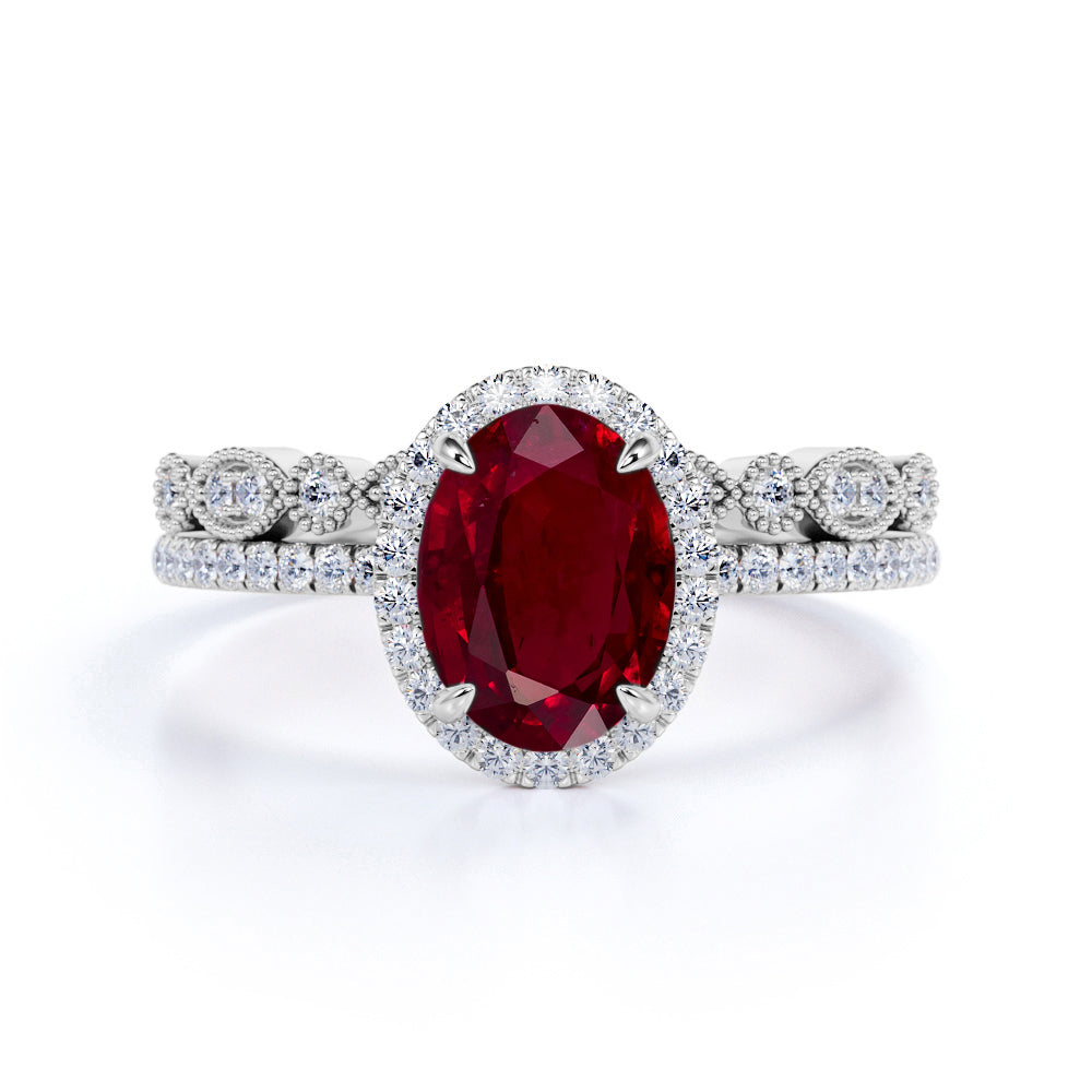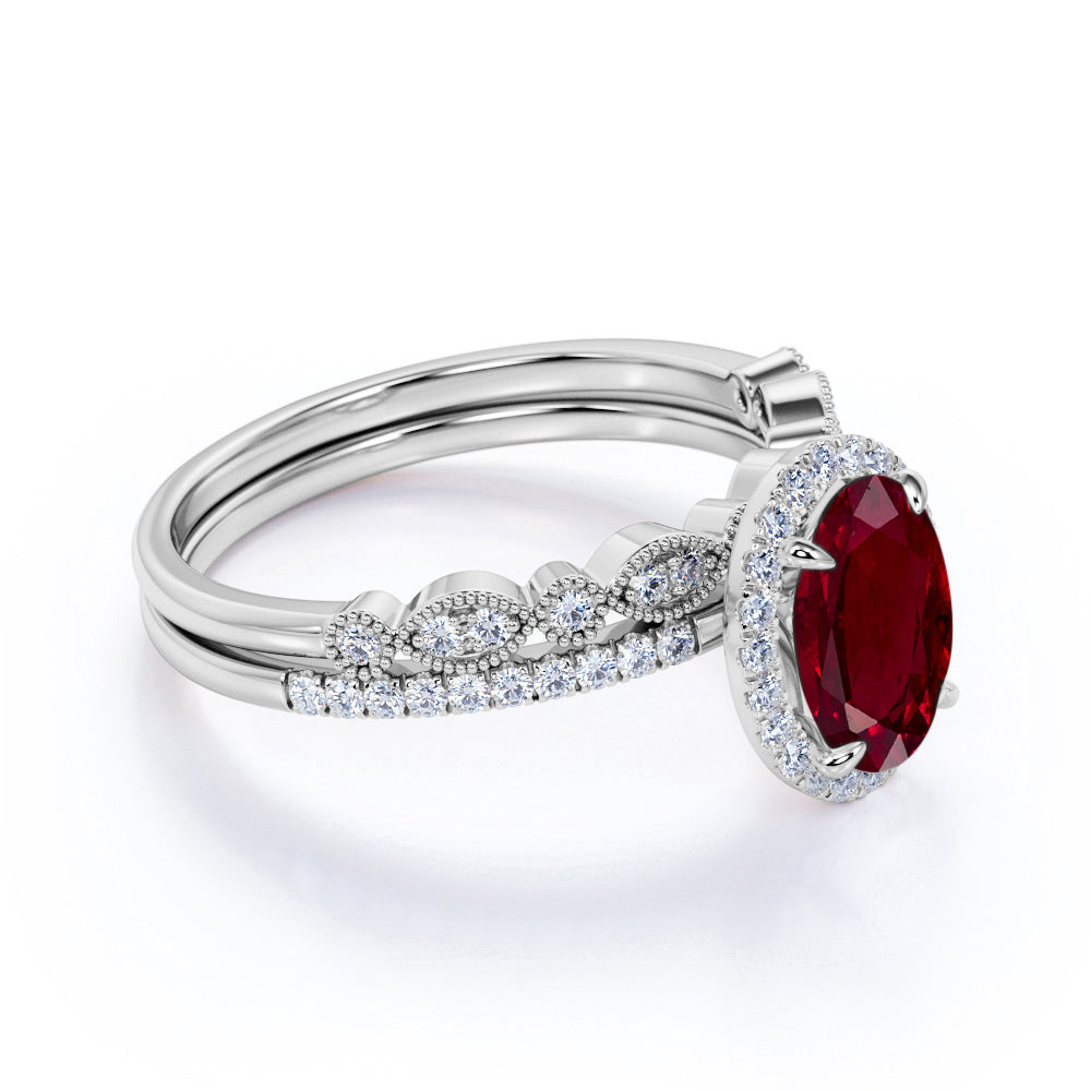 Antique Design 2 Carat Oval Cut Lab Ruby and Diamond Halo Wedding Set with Art Deco Band in White Gold