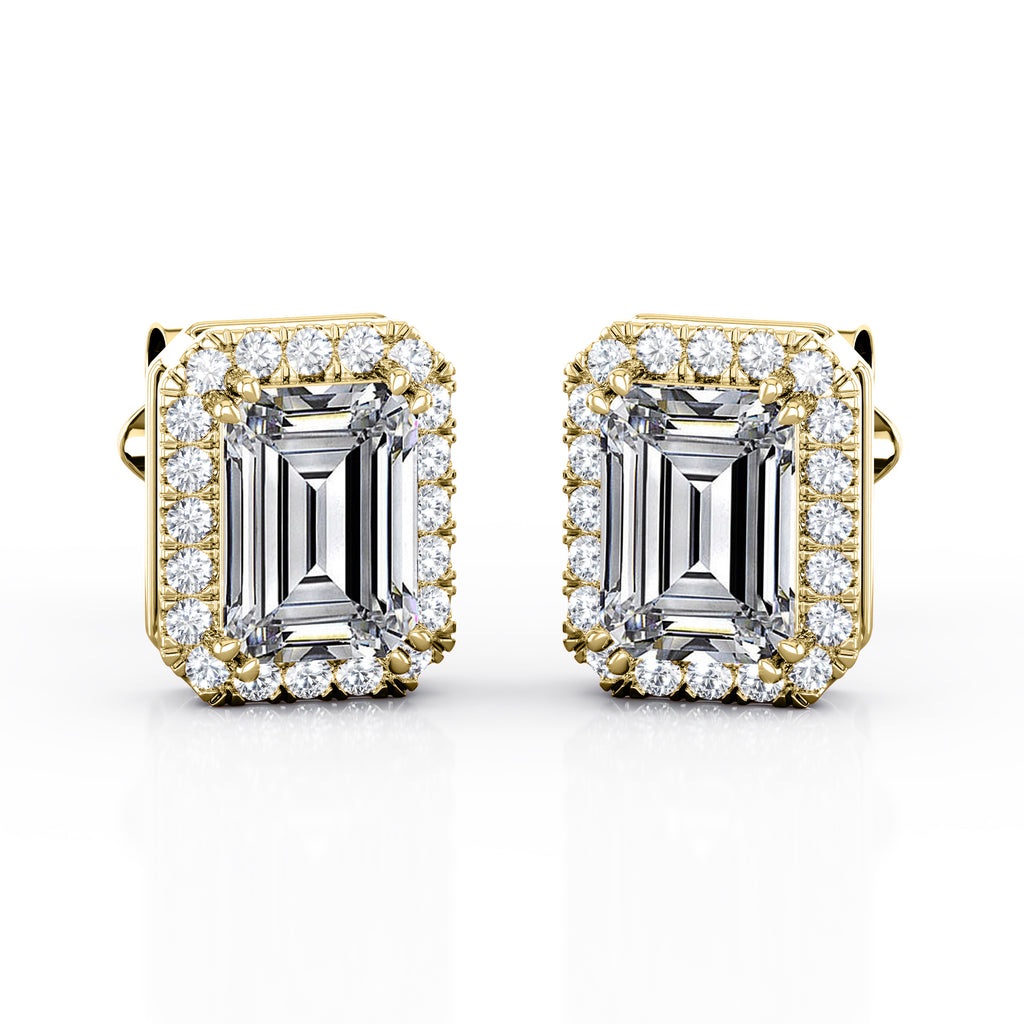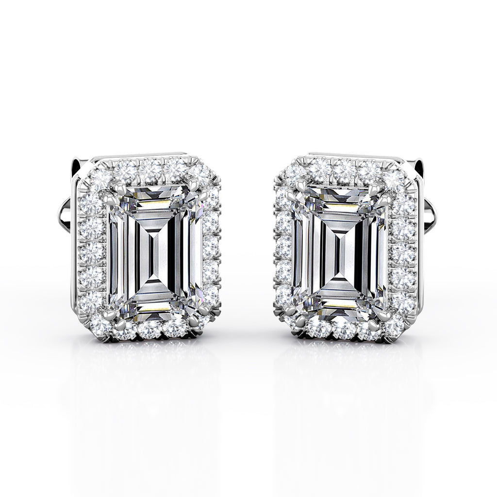 Antique Double Prong 2.10 Carat Emerald Cut Certified Moissanite and Diamond Halo Stud Earrings