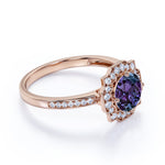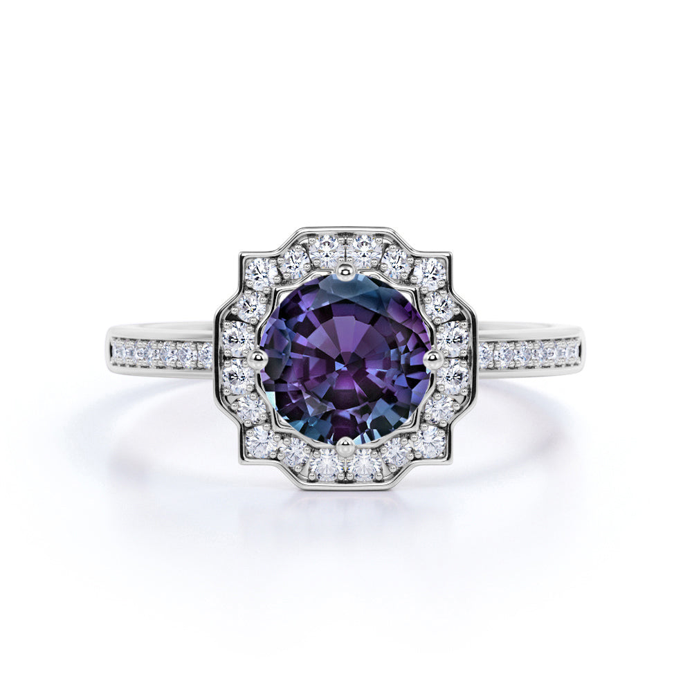 Be on cloud nine with this Antique Floral Bezel Set 1.50 Carat Round Cut Created Alexandrite and Diamond Channel Set Rings Engagement Ring. This vintage ring features 1 carat round cut lab grown Alexandrite and .50 carat real genuine side diamond for gold ring and moissanite for silver ring. This nature-inspired engagement ring can be customized to either 10k, 14K and Gold over Silver and either Black Gold, Rose Gold, White Gold or Yellow Gold. Also, as your satisfaction is our most priority, we will do our best to have your handmade jewelry be carefully and beautifully crafted by our expert jewelers. The order also comes with a 30-day full refund policy. Enrich your charm and charisma with this vintage mystic lab grown Alexandrite ring for women that is excellent for everyday wear. With its unique ability to exhibit two colors, this ring will make you stand out from others. This fascinating ring is a perfect match for those who are looking for symbol of luck, hope and good fortune. Enrich your charming love story and strengthen your bond with this color-change man made Alexandrite ring. This simulated Alexandrite ring gives a vivid grass green color in daylight and displays an intense raspberry red in candescent light. Create a fascinating look on your finger with this lab created Alexandrite ring for women which is available in both solid gold and sterling silver. This ring will bring love and hope to its wearer. This engagement ring will create a timeless and fabulous look on your finger. Those who has a penchant for vintage and flawless ring would completely fall in love with this affordable synthetic Alexandrite ring. Handcrafted with love, this antique man made Alexandrite ring will complement any style and enhance the charm of its wearer.