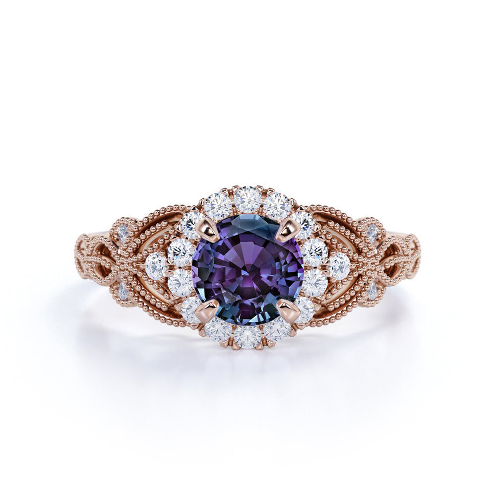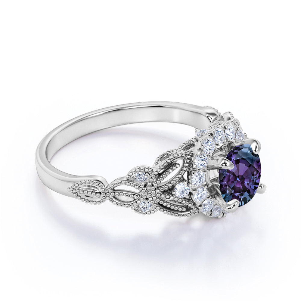 Antique Floral Milgrain 1.25 Carat Round Cut Created Alexandrite and Diamond Cluster Engagement Ring - Gifts for Her