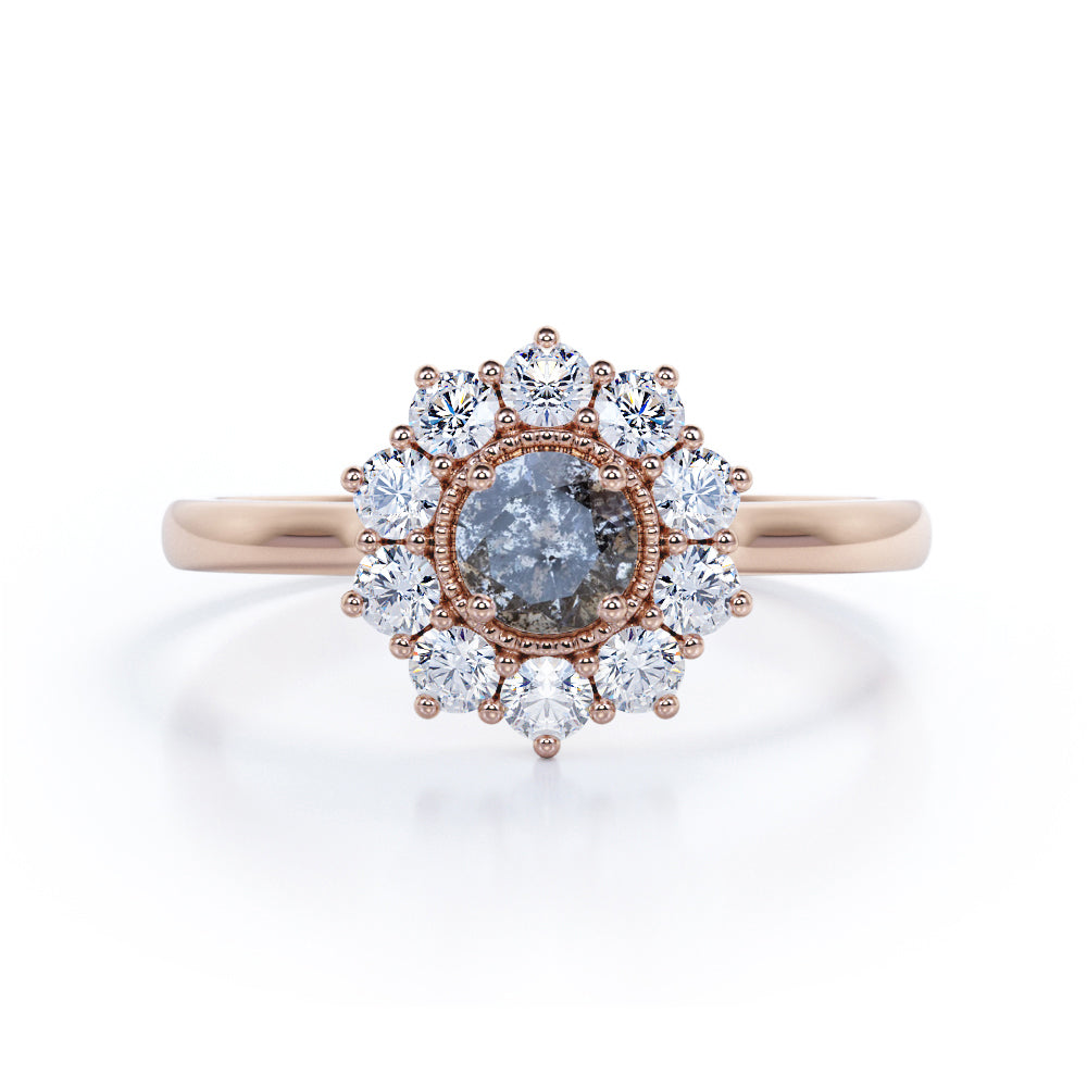 IMPORTANT NOTE: Since each Salt and Pepper Diamonds is one of a kind, the actual color of it may vary from the one that is pictured above. Embellish your love story with the uniqueness of this Antique Flower Cluster 1 Carat Round Cut Natural Fancy Grey Salt and Pepper Diamond Engagement Ring in Rose Gold. This unique floral cluster fancy grey Salt and Pepper Diamond engagement ring features .50 carat round cut natural Salt and Pepper Diamond and .50 carat real side diamond for gold ring and moissanite for silver ring. This antique Salt and Pepper engagement ring can be customized to either 10k, 14K and Gold over Silver and either Black Gold, Rose Gold, White Gold or Yellow Gold. Also, as your satisfaction is our most priority, we will do our best to have your handmade jewelry be carefully and beautifully crafted by our expert jewelers. The order also comes with a 30-day full refund policy. Enrich your charm and charisma with this vintage dark grey Salt and Pepper Diamond ring for women that is excellent for everyday wear. With its unique appearance, this unique dark grey Salt and Pepper Diamond ring will create a charming and fascinating look on your fingers. Being imperfect diamond, this Salt and Pepper Diamond encourages couple to look past the flaws and focus on the love since no one is perfect. If you are looking for alternate gemstone, this Salt and Pepper Diamond is right for you. Salt and Pepper Diamonds are eco-friendly, ethical, and environmental friendly. Its inclusions will distinguish your ring offering a unique look on your finger . If you are in search of a unique gift for any occasion, this stunning Salt and Pepper Diamond ring is the best answer for you. This antique ring is available at a very affordable price yet it offers a very expensive and gorgeous look on your finger. Impress your special someone with this beautiful and affordable ring. Handcrafted with love, this antique ring will complement any style and enhance the charm of its wearer.