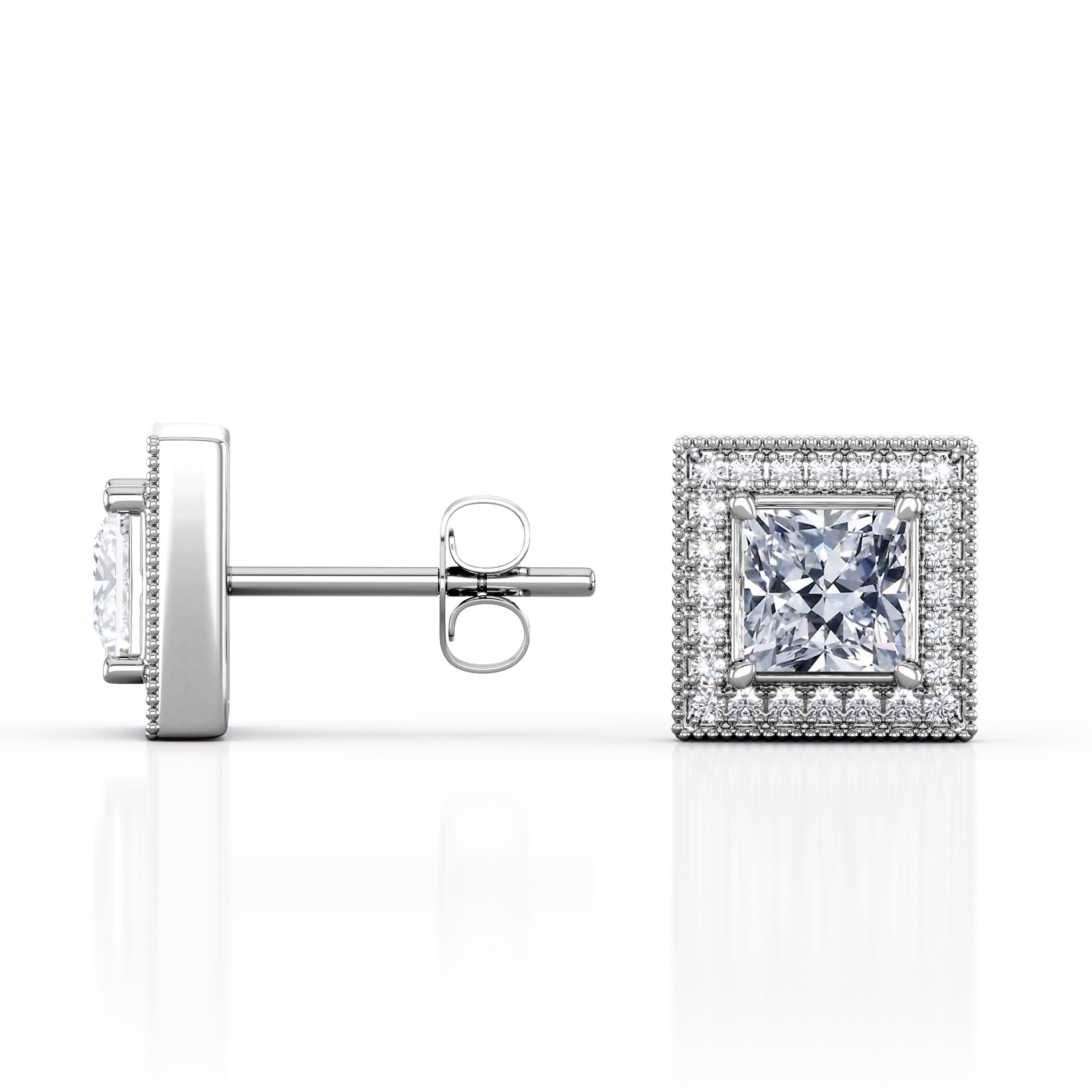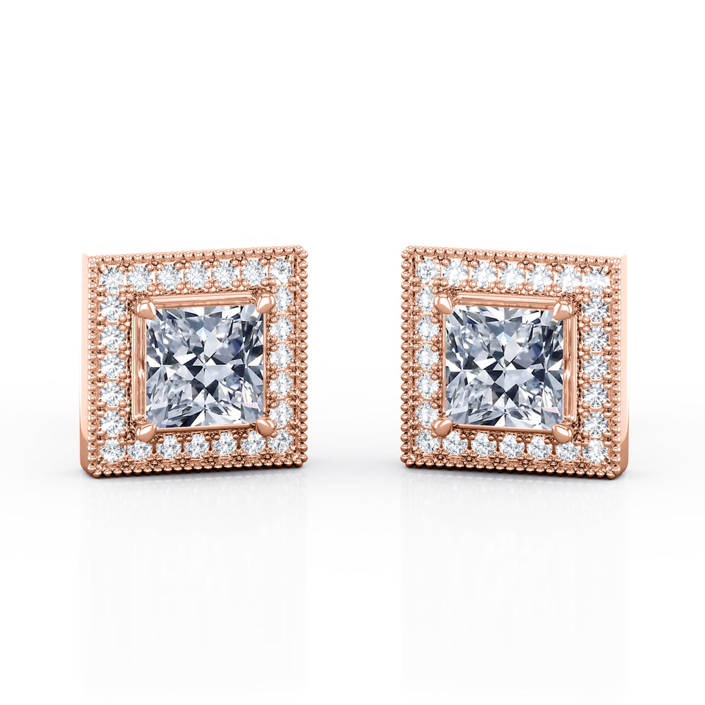 Antique Halo 0.85 CT TDW Princess Certified Lab Diamond Surface Prong Milgrain Ear Studs in Yellow Gold