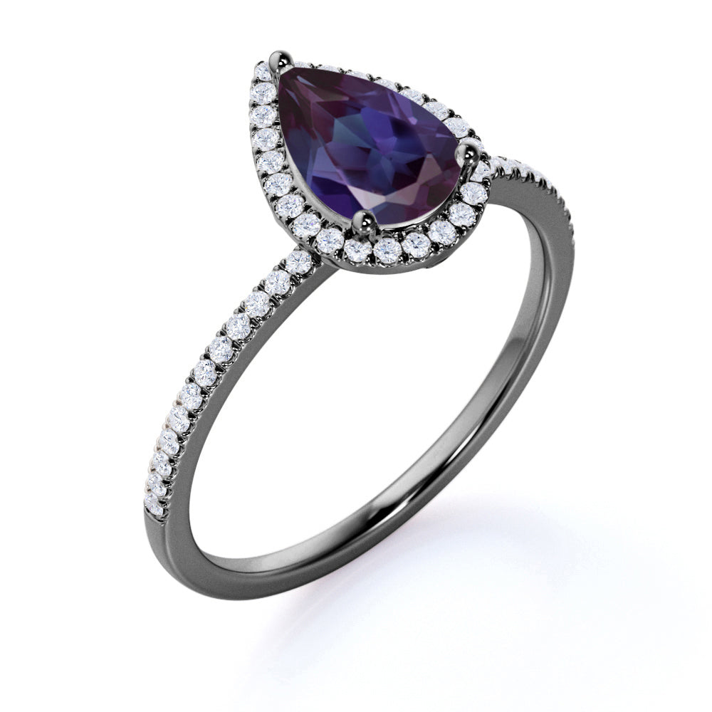 Be on cloud nine with this Antique Halo 1.50 Carat Pear Cut Lab Made Alexandrite and Diamond Semi Eternity Pave Engagement Ring. This vintage engagement ring features 1 carat pear cut synthetic Alexandrite and .50 carat real side diamond for gold ring and moissanite for silver ring. This beautiful ring can be customized to either 10k, 14K and Gold over Silver and either Black Gold, Rose Gold, White Gold or Yellow Gold. Also, as your satisfaction is our most priority, we will do our best to have your handmade jewelry be carefully and beautifully crafted by our expert jewelers. The order also comes with a 30-day full refund policy. Crowned as June birthstone, this flawless synthetic Alexandrite ring will bring hope as well as encouragement to you. Design your own flawless look with this ring which you can customize it as per your satisfaction. This flawless ring will be a perfect fit for you love story as it is believed that joy enters the lives of people through the stone. Enrich your charming love story and strengthen your bond with this color-change man made Alexandrite ring. Own this ring which displays one of the most remarkable color changes and stand out from the rest. Embellish your love story with this beautiful man made Alexandrite ring and make it even more memorable. If you are in search of a perfect gift for any occasion, this delicate and stunning ring is the best answer for you. This ring is available at a very affordable price yet it offers a very expensive and gorgeous look on your finger. Those who has a penchant for vintage and flawless ring would completely fall in love with this affordable synthetic Alexandrite ring. With its mesmerizing color-change variety and unparalleled vibrancy, this flawless lab grown Alexandrite ring will enchant your special someone with gracefulness.