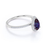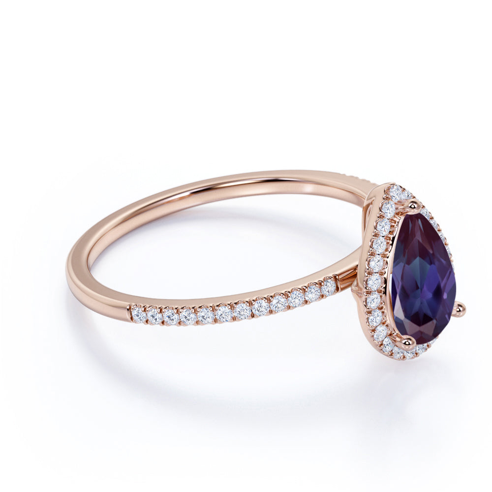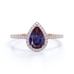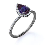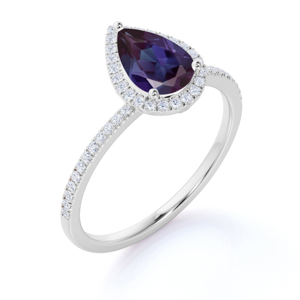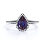 Be on cloud nine with this Antique Halo 1.50 Carat Pear Cut Lab Made Alexandrite and Diamond Semi Eternity Pave Engagement Ring. This vintage engagement ring features 1 carat pear cut synthetic Alexandrite and .50 carat real side diamond for gold ring and moissanite for silver ring. This beautiful ring can be customized to either 10k, 14K and Gold over Silver and either Black Gold, Rose Gold, White Gold or Yellow Gold. Also, as your satisfaction is our most priority, we will do our best to have your handmade jewelry be carefully and beautifully crafted by our expert jewelers. The order also comes with a 30-day full refund policy. Crowned as June birthstone, this flawless synthetic Alexandrite ring will bring hope as well as encouragement to you. Design your own flawless look with this ring which you can customize it as per your satisfaction. This flawless ring will be a perfect fit for you love story as it is believed that joy enters the lives of people through the stone. Enrich your charming love story and strengthen your bond with this color-change man made Alexandrite ring. Own this ring which displays one of the most remarkable color changes and stand out from the rest. Embellish your love story with this beautiful man made Alexandrite ring and make it even more memorable. If you are in search of a perfect gift for any occasion, this delicate and stunning ring is the best answer for you. This ring is available at a very affordable price yet it offers a very expensive and gorgeous look on your finger. Those who has a penchant for vintage and flawless ring would completely fall in love with this affordable synthetic Alexandrite ring. With its mesmerizing color-change variety and unparalleled vibrancy, this flawless lab grown Alexandrite ring will enchant your special someone with gracefulness.