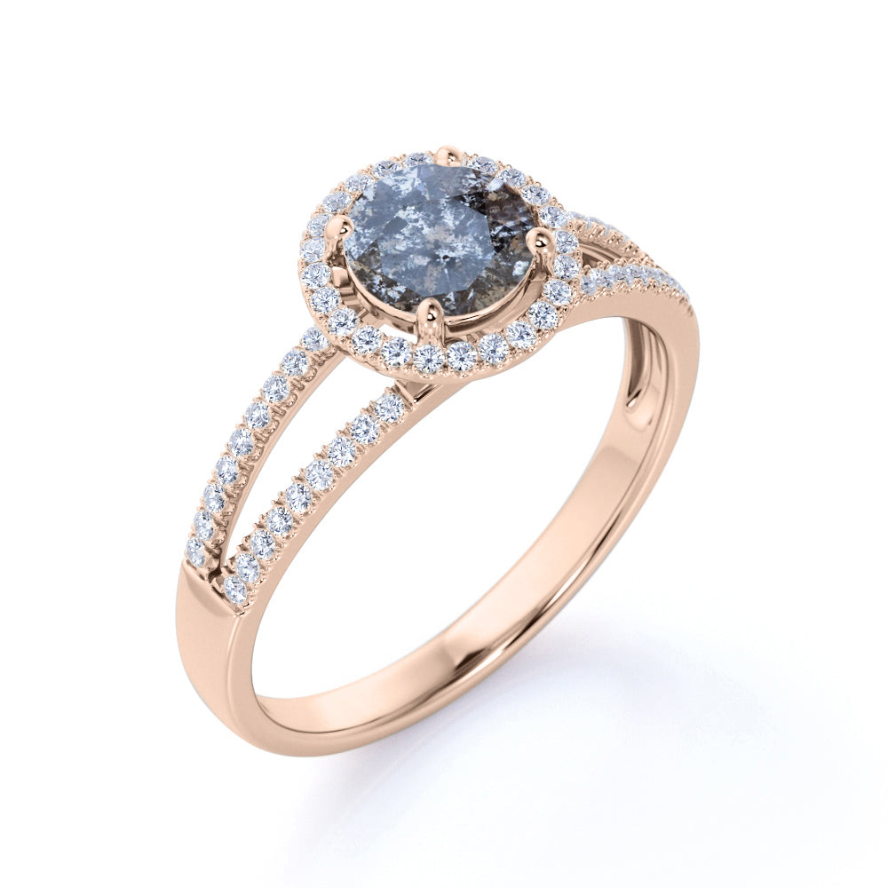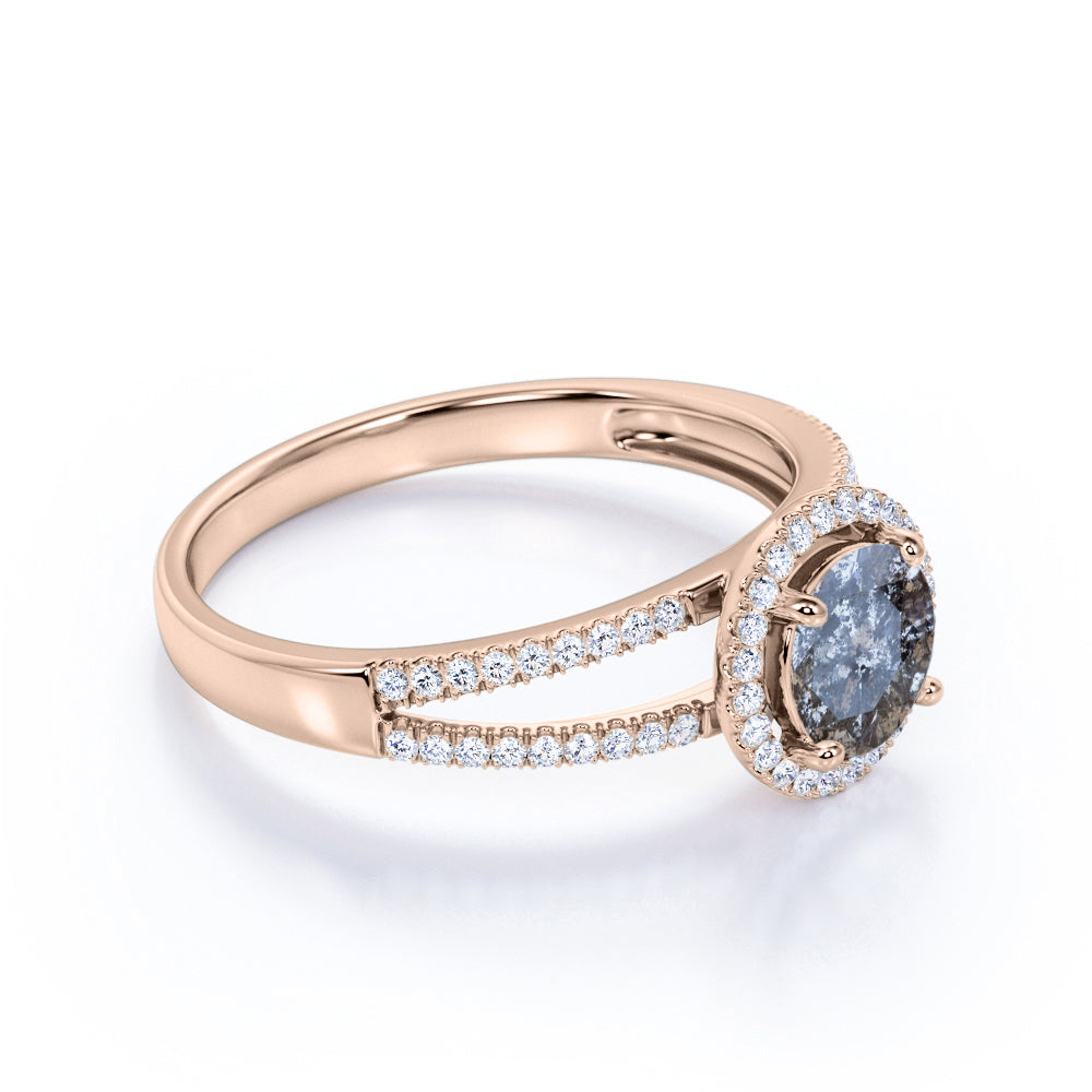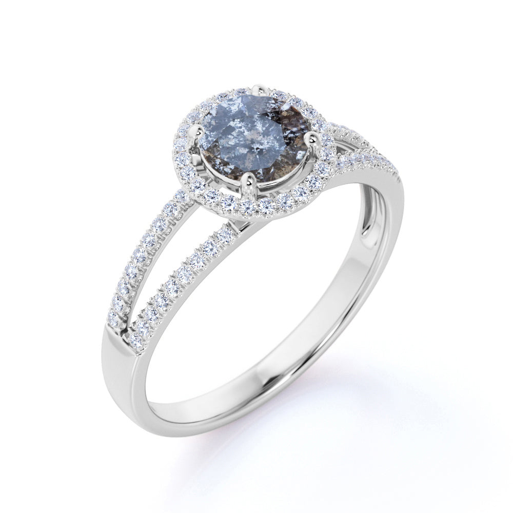 IMPORTANT NOTE: Since each Salt and Pepper Diamonds is one of a kind, the actual color of it may vary from the one that is pictured above. Handcrafted with love, this Antique Halo 1.25 Carat Round Cut Fancy Icy Grey Salt and Pepper Diamond Split Shank Pave Engagement Ring will surely be as unique as you are. This vintage Salt and Pepper Diamond ring features .50 carat round cut natural Salt and Pepper Diamond and .75 carat real side Diamond for gold ring and Moissanite for silver ring. This exquisite engagement ring can be customized to either 10k, 14K and Gold over Silver and either Black Gold, Rose Gold, White Gold or Yellow Gold. Also, as your satisfaction is our most priority, we will do our best to have your handmade jewelry be carefully and beautifully crafted by our expert jewelers. The order also comes with a 30-day full refund policy. This ring will be a perfect gift for any occasions: birthday, anniversary, proposal, Valentine's day, Christmas, and any other special events. This ring is very exclusive due to the unique inclusions of Salt and Pepper Diamond that appears black and white. Ornament and distinguish your love story with the neat distribution of black and white inclusions of Salt and Pepper Diamond. It is eco-friendly, ethical, and environmental friendly. Being considered a very eccentric gemstone, this ring will create a timeless and fabulous engagement ring. Create a fascinating look on your finger with this Salt and Pepper Diamond ring for women which is available in both solid gold and sterling silver. Sparkle your finger with this ring which is perfect for any occasion and everyday wear. Diversity of Salt and Pepper Diamond provides additional character to your traditional engagement ring. With its mesmerizing salt and pepper inclusions, it is sure to enchant your special someone with gracefulness.