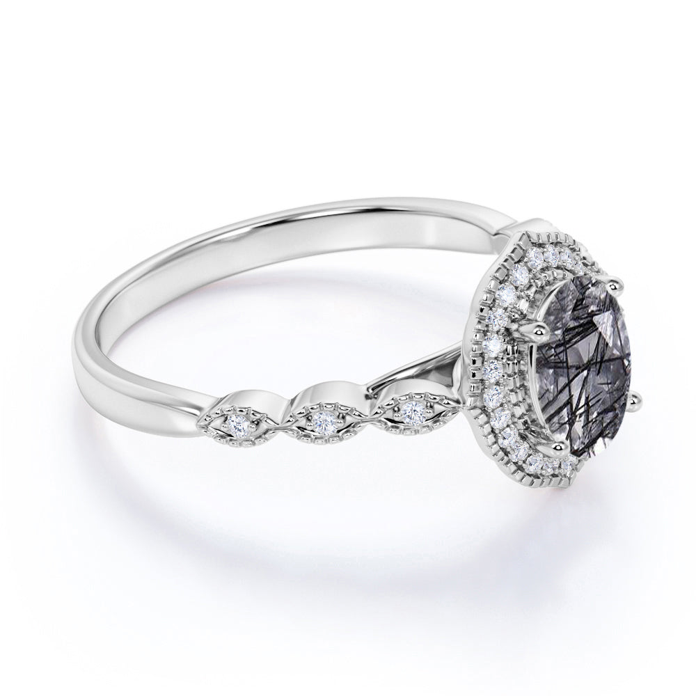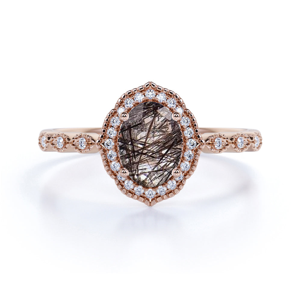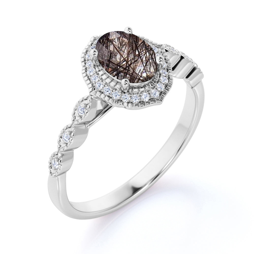 Halo 1.50 ct Oval Black Rutilated Quartz Art Deco Engagement Ring