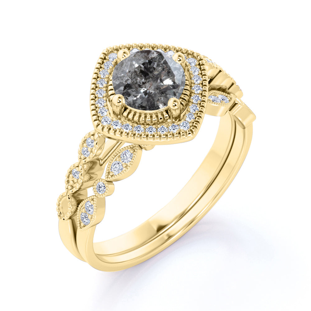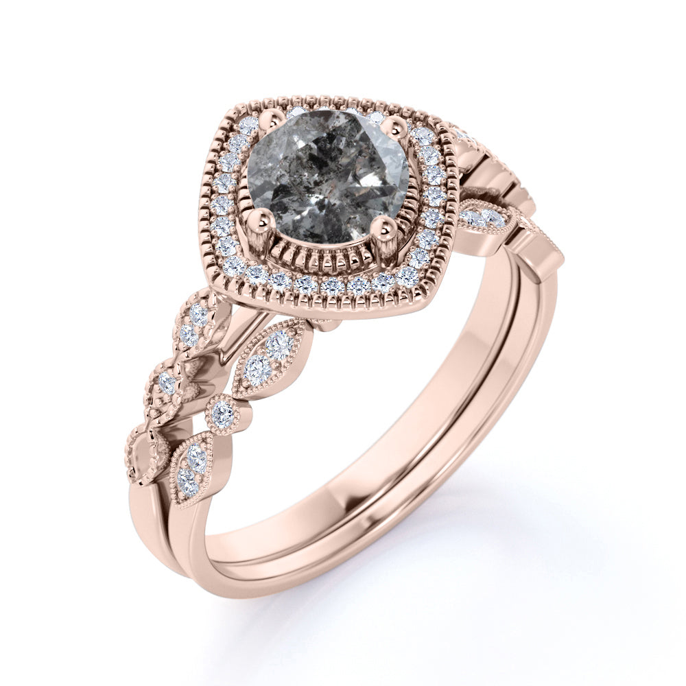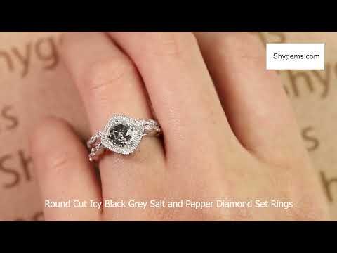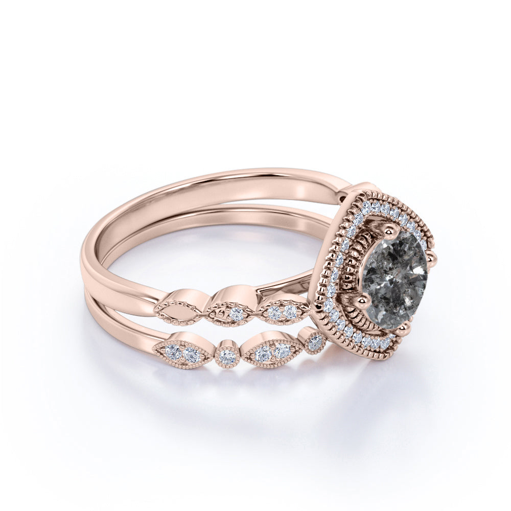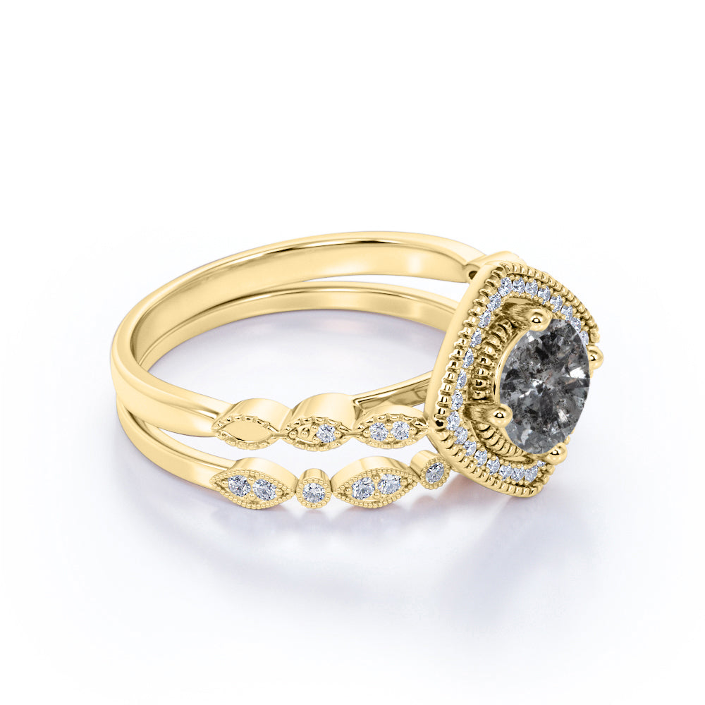 Art Deco Halo 0.8 Ct Round Cut Salt and Pepper Diamond Bridal Set
