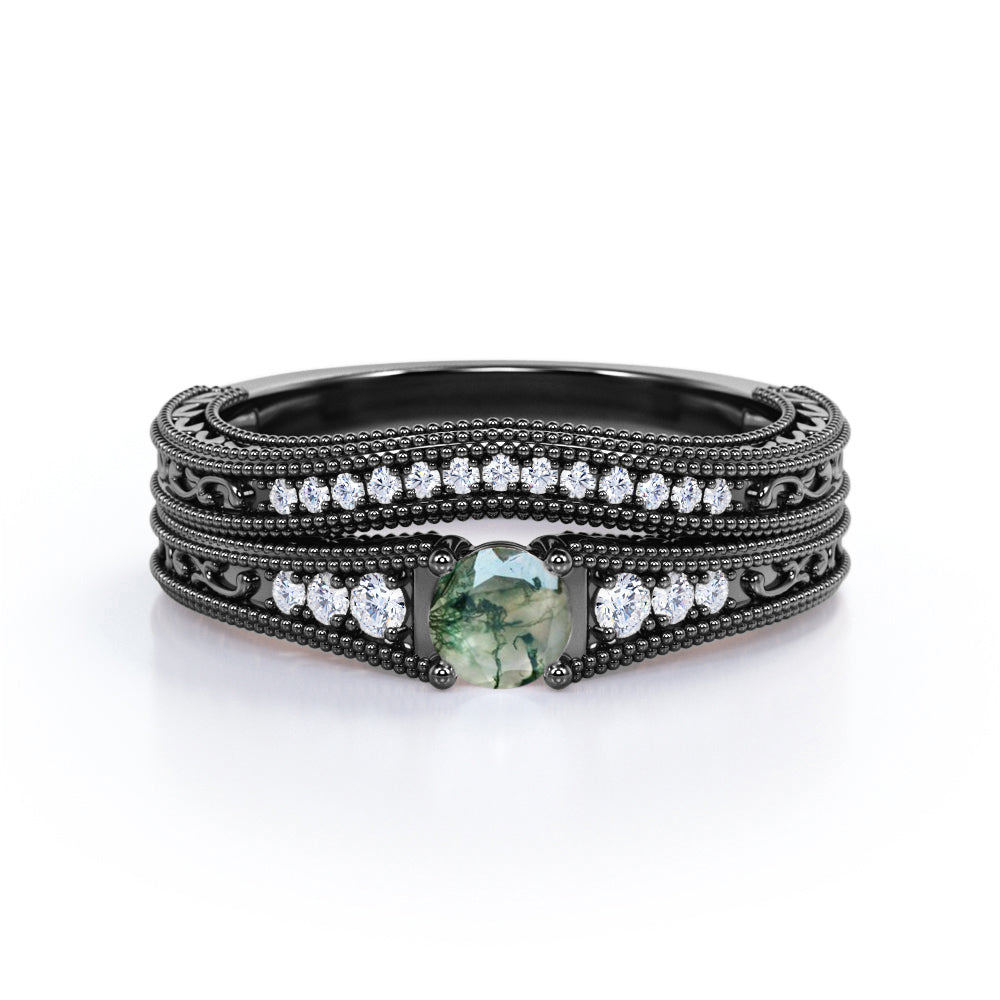 Antique Milgrain 0.8 carat Round Dendritic Moss Agate Stone and Moissanite Bridal Set in White Gold
