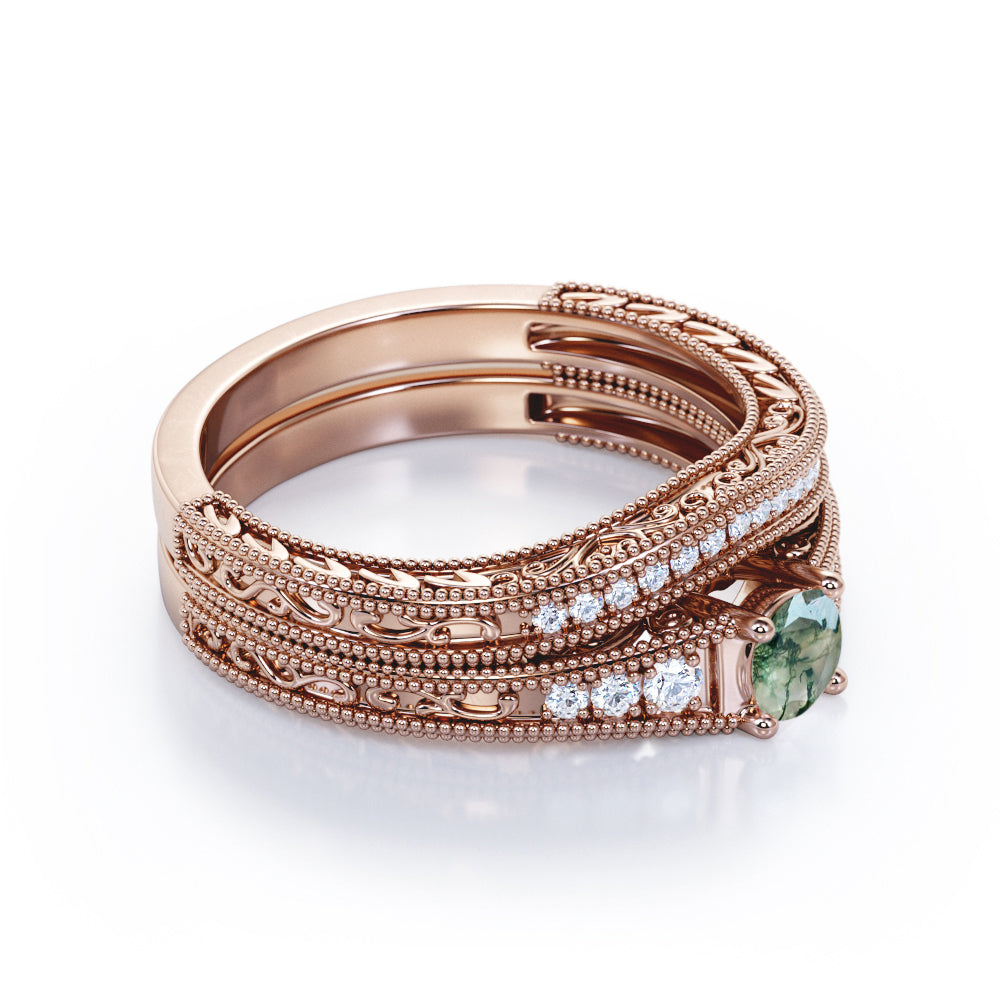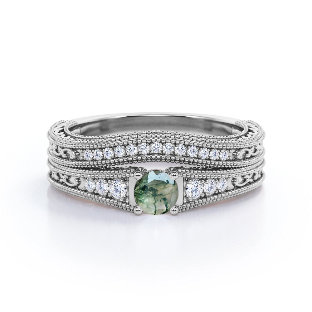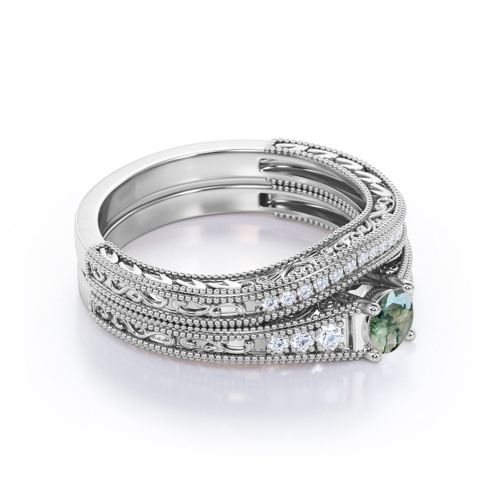 Antique Milgrain 0.8 carat Round Dendritic Moss Agate Stone and Moissanite Bridal Set in White Gold