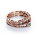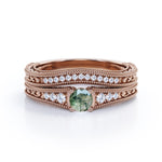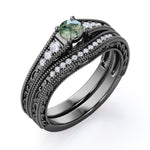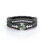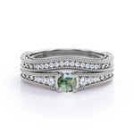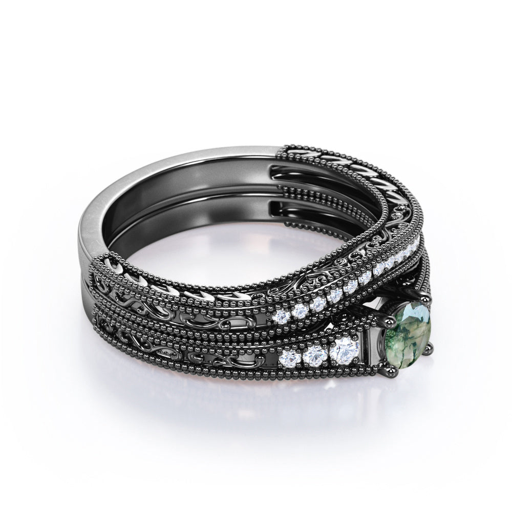 Nature and vintage style are combined in one place and presented as the Antique Milgrain 0.8 carat Round Dendritic Moss Agate Stone and Moissanite Bridal Set in White Gold. This wedding set contains one Moss agate engagement ring and one wedding ring. Moss agate crystal is located in the middle of the promise ring where tapered band and small round Moissanite are employed. Filigree ring band shows the windblow engraving on it while the side illustrates wind and leaves floating around. Both rings are finished by line Milgrain that is put on each edge. You can choose your preferred color and metal; white gold, rose gold, yellow gold and black gold are up for you to choose as the color and for metal, it can be either 18k gold over silver, 10k gold and 14k gold.