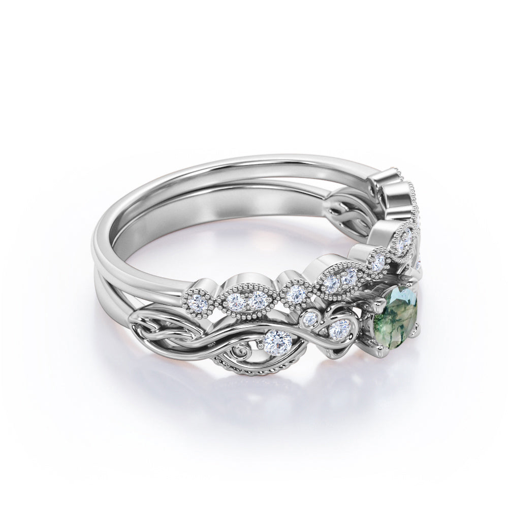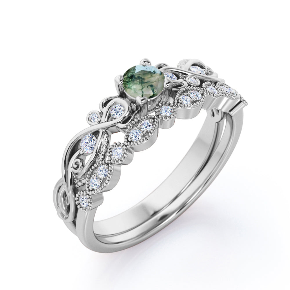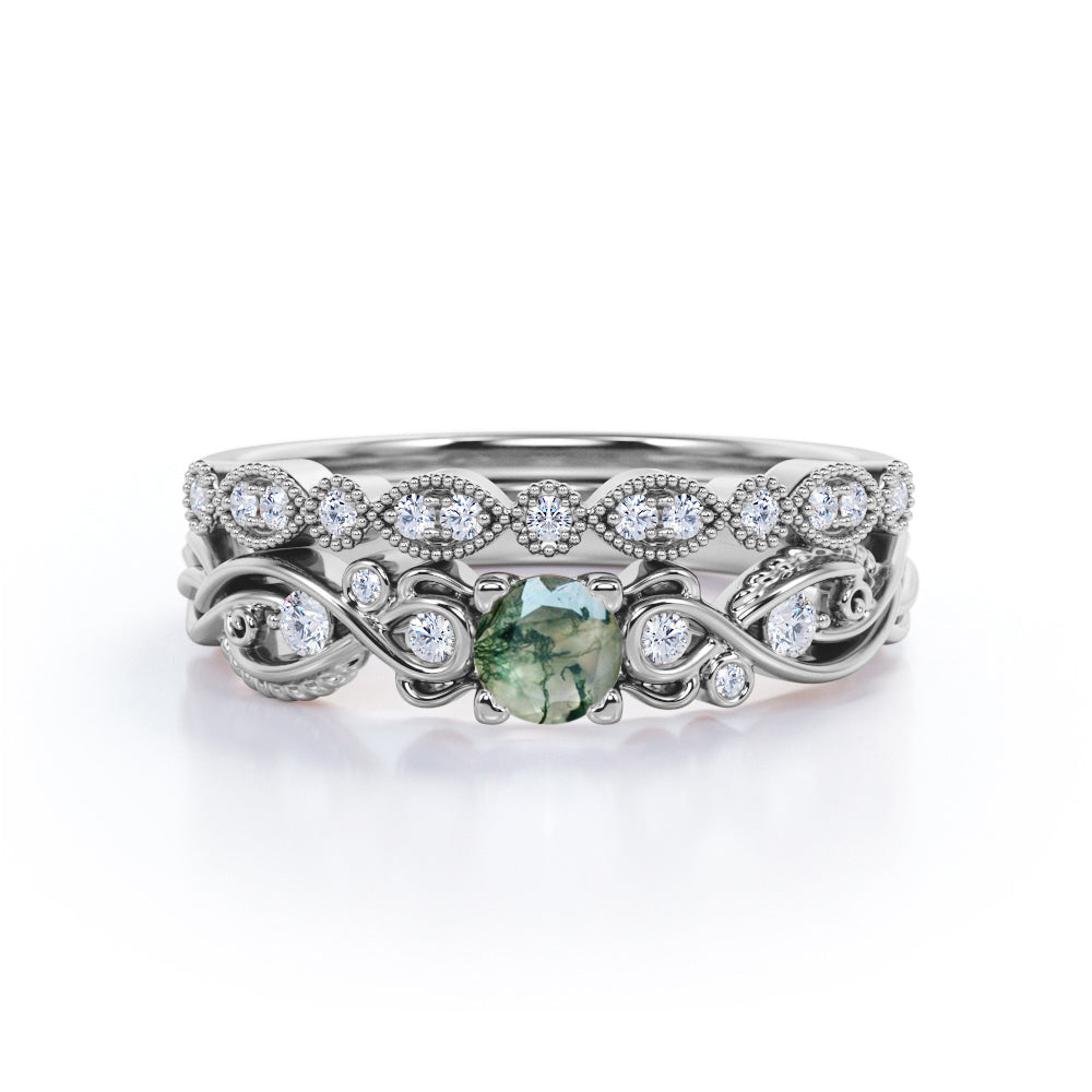 Antique Solitaire 1.25 Carat Round Cut Milky White Druzy Moss Green Agate with Diamond Marquise Dot Art Deco Band Wedding Ring Sets