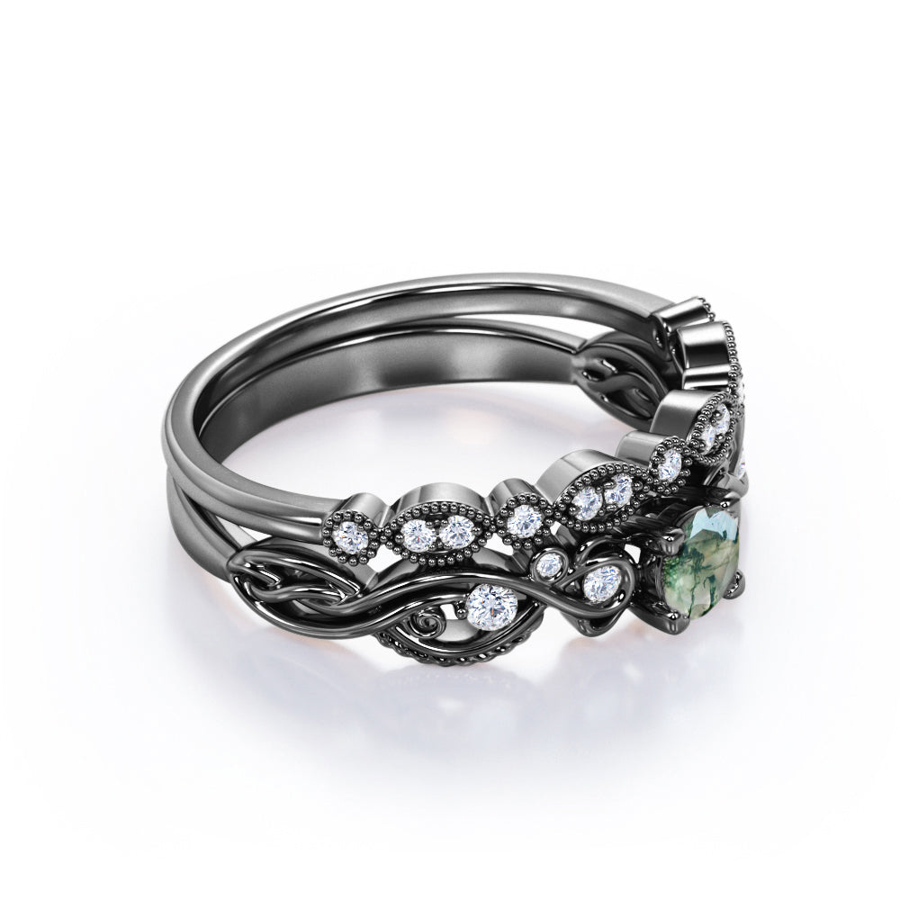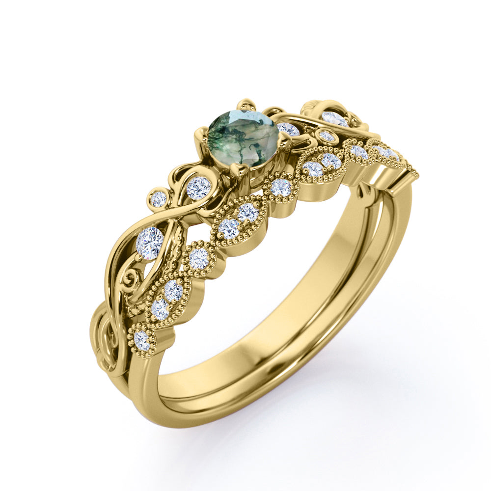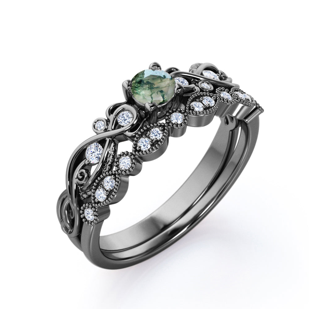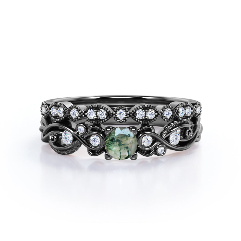 Antique Solitaire 1.25 Carat Round Cut Milky White Druzy Moss Green Agate with Diamond Marquise Dot Art Deco Band Wedding Ring Sets
