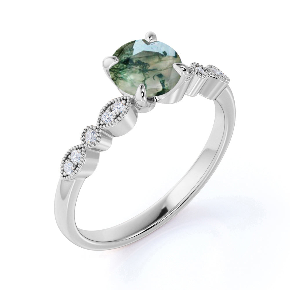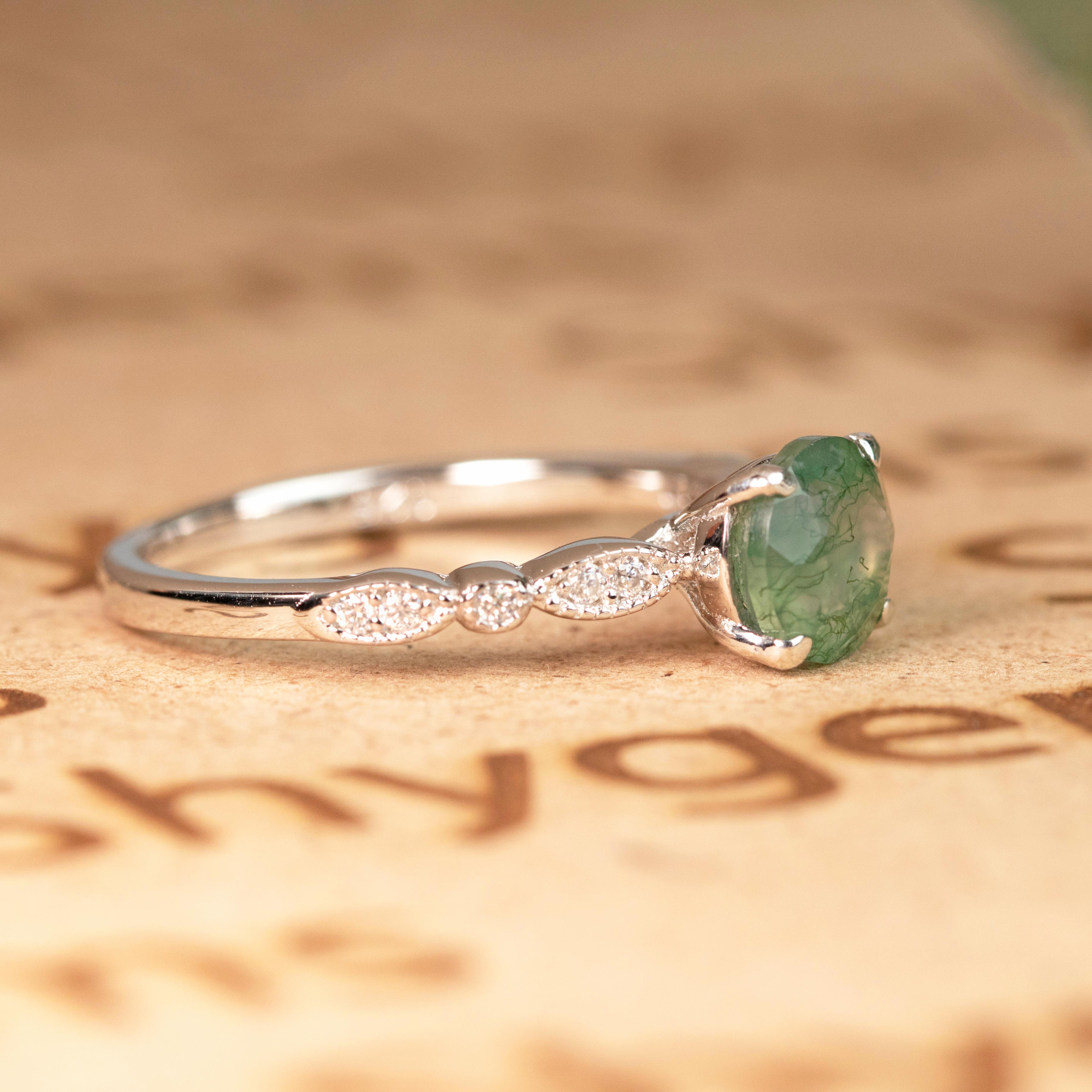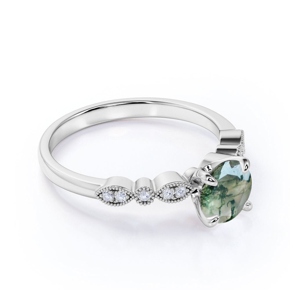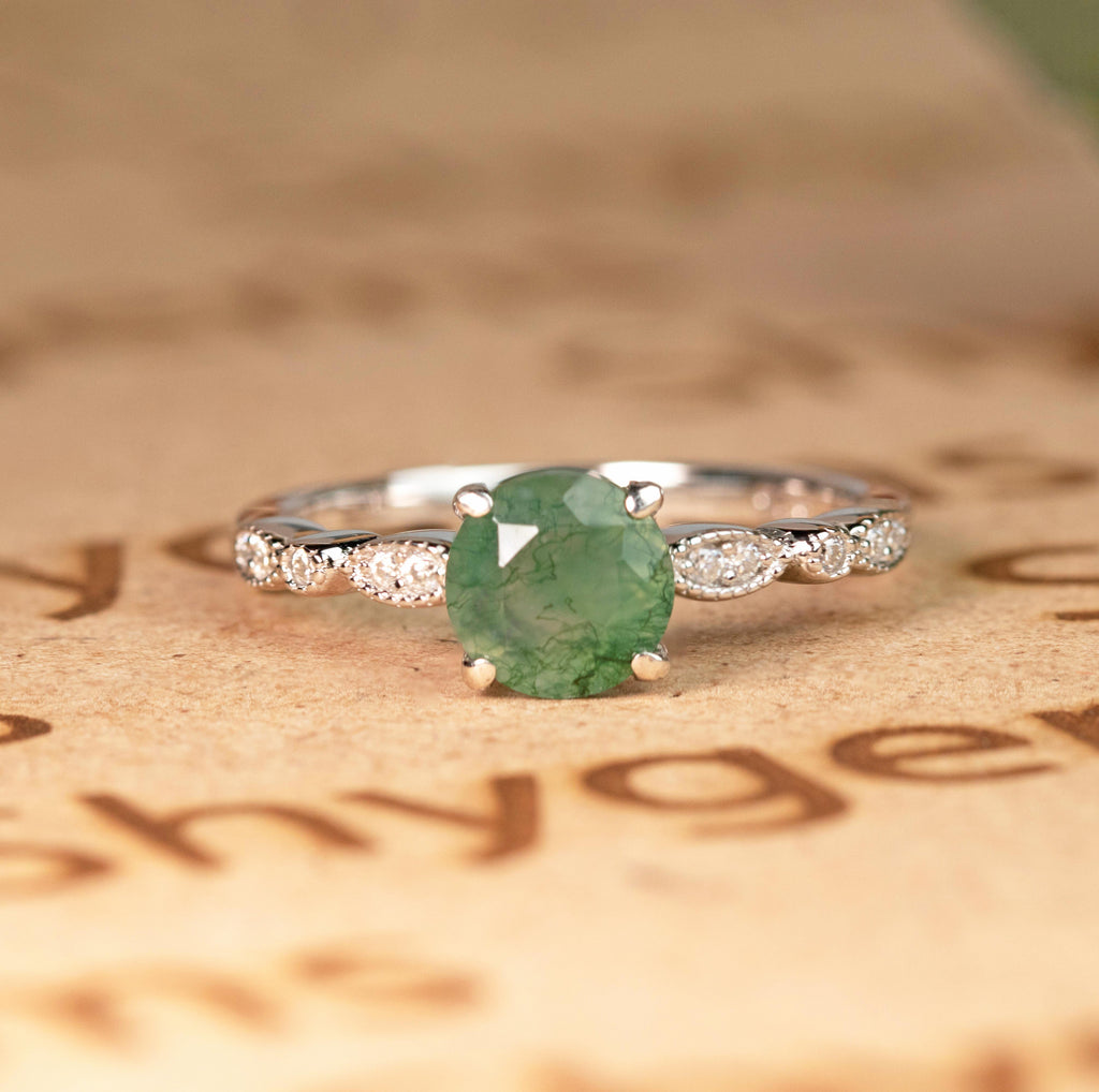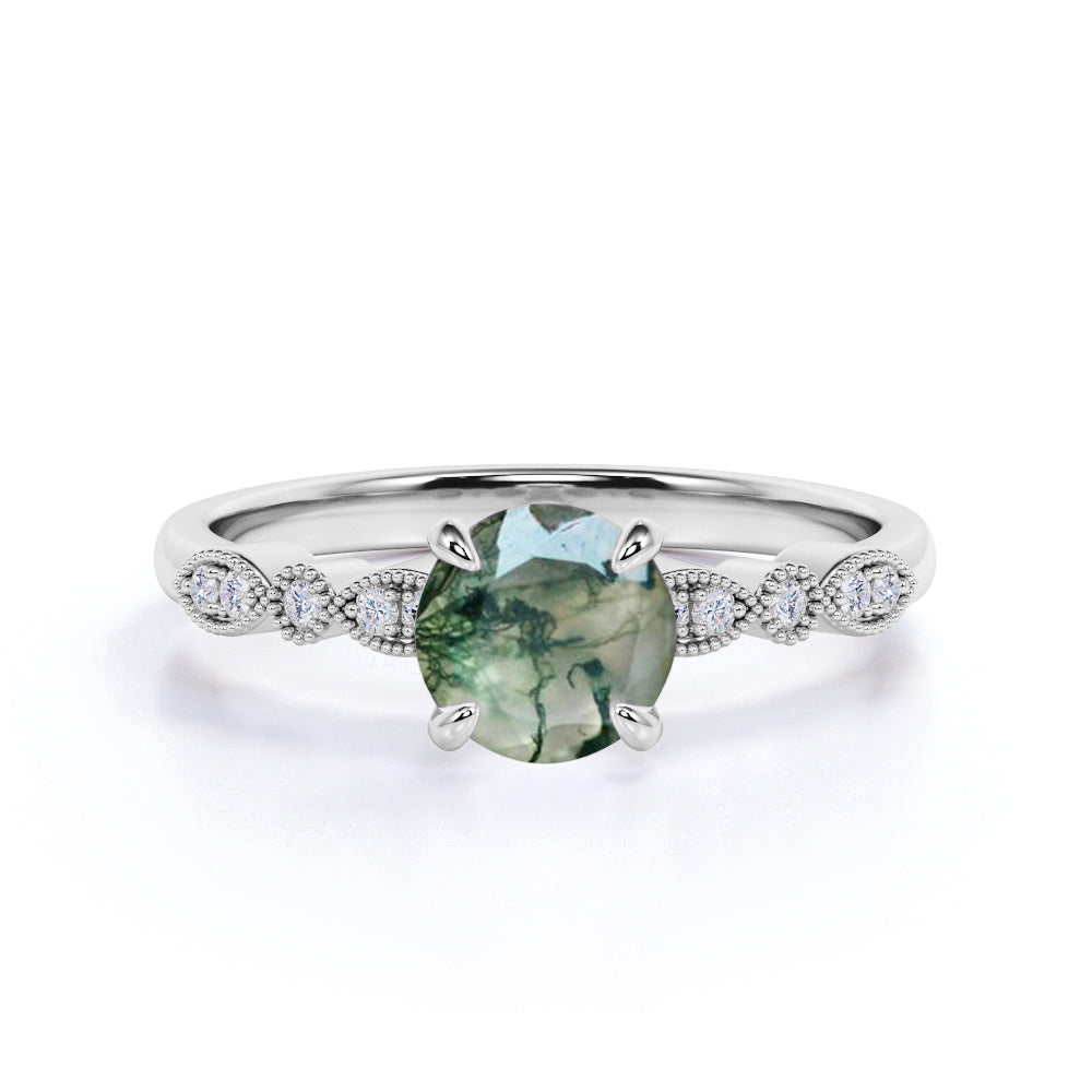 Paint your love story with this Antique Solitaire 1.75 Carat Round Cut Natural Translucent Banded Moss Green Agate and Diamond Art Deco Engagement Ring in White Gold. This antique art deco milky white moss green agate engagement ring features 1.50 carat round cut natural moss green agate and .25 carat real genuine side diamond for gold ring and moissanite for silver ring. This beautiful solitaire agate engagement ring can be customized to either 10k, 14K and Gold over Silver and either Black Gold, Rose Gold, White Gold or Yellow Gold. Also, as your satisfaction is our most priority, we will do our best to have your handmade jewelry be carefully and beautifully crafted by our expert jewelers. The order also comes with a 30-day full refund policy. This green colored minerals with banded inclusions ring will surely be a perfect gift for your special someone. It is believed to bring abundance in wealth and improve self-esteem. Encourage trust and hope with this real green Agate ring that shows a variety of white with green inclusions that resembles moss. Due to its unique milky white color with green dendritic inclusions, this vintage moss green Agate ring is sure to enchant its wearer. Perfect for everyday wear, this polished veined moss green Agate gemstone is resistant to chemical attack. This ring is available at a very affordable price and available in both silver and gold ring. Precisely handcrafted and created to be unique, no two rings are exactly alike. Being considered a very lucky omen, this natural banded moss green Agate ring encourages the gradual growth of what you currently need most in your life. Sparkle your finger with this ring which is perfect for any occasion and everyday wear. Handcrafted with love, this antique ring will complement any style and enhance the charm of its wearer.