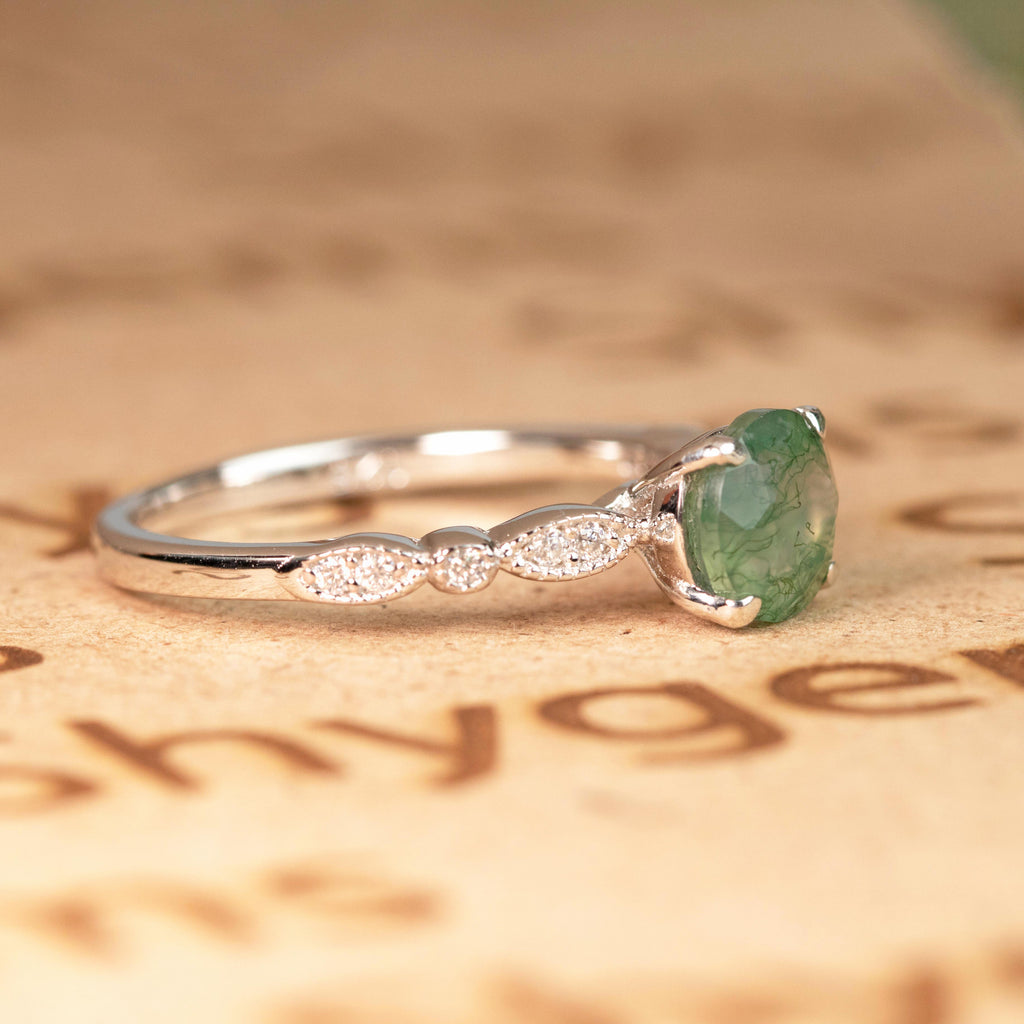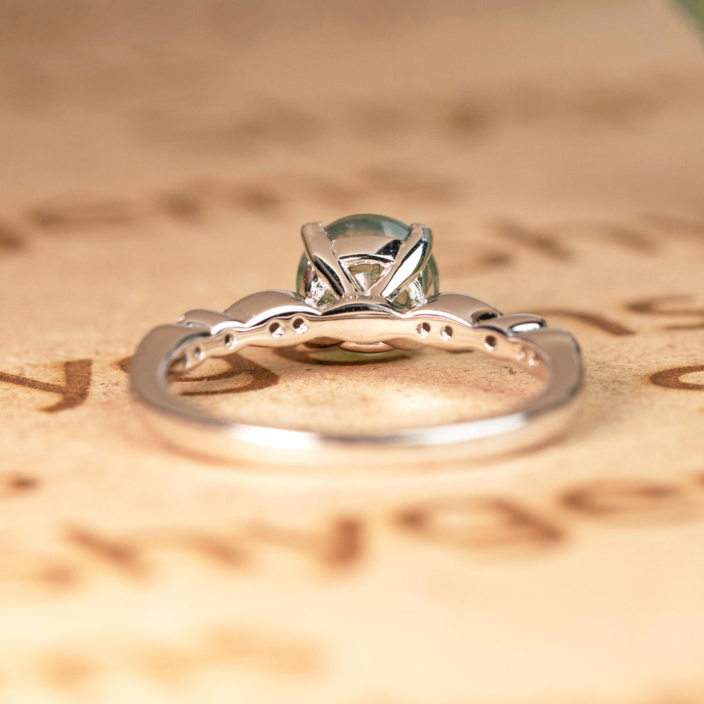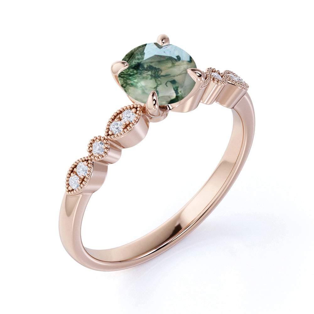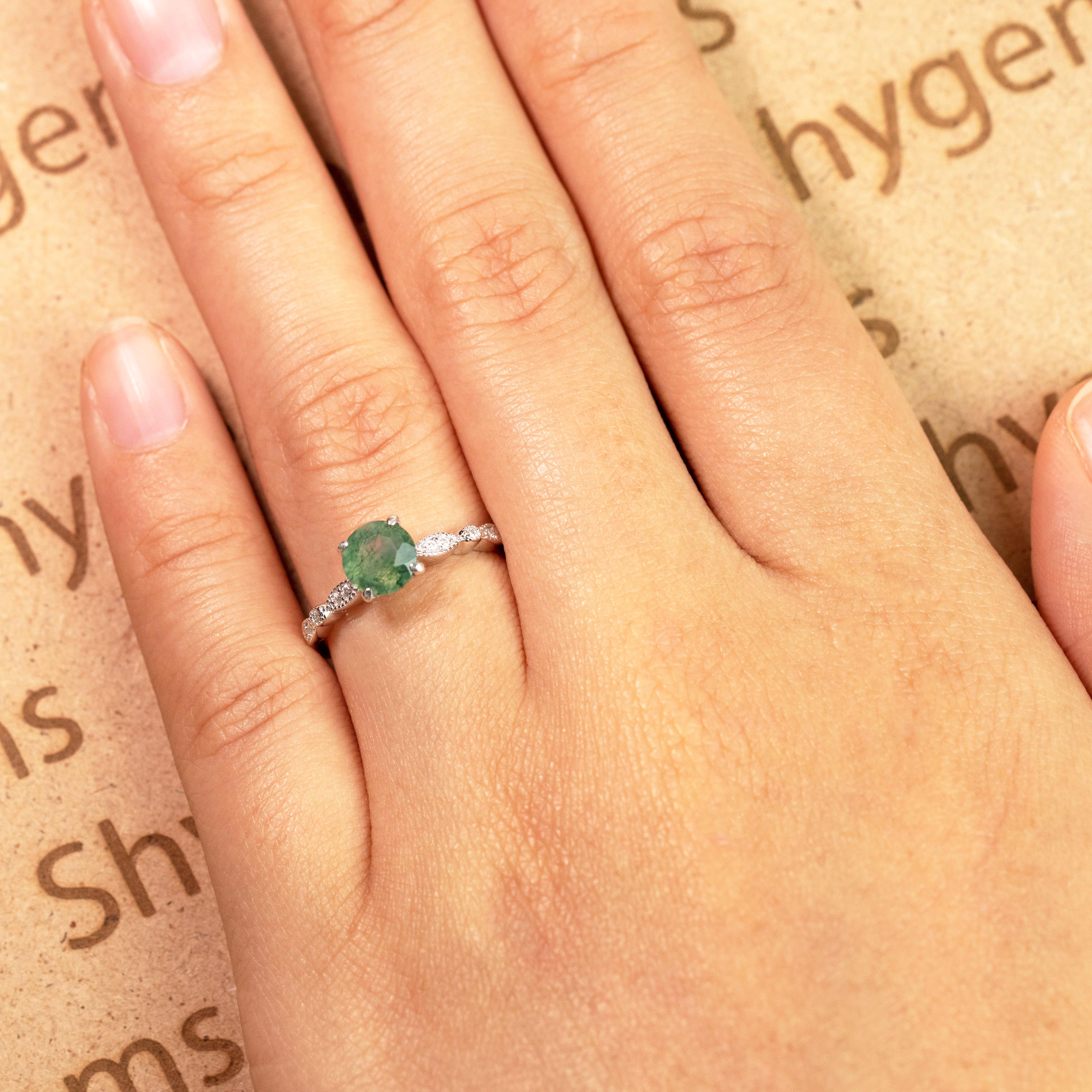 Paint your love story with this Antique Solitaire 1.75 Carat Round Cut Natural Translucent Banded Moss Green Agate and Diamond Art Deco Engagement Ring in White Gold. This antique art deco milky white moss green agate engagement ring features 1.50 carat round cut natural moss green agate and .25 carat real genuine side diamond for gold ring and moissanite for silver ring. This beautiful solitaire agate engagement ring can be customized to either 10k, 14K and Gold over Silver and either Black Gold, Rose Gold, White Gold or Yellow Gold. Also, as your satisfaction is our most priority, we will do our best to have your handmade jewelry be carefully and beautifully crafted by our expert jewelers. The order also comes with a 30-day full refund policy. This green colored minerals with banded inclusions ring will surely be a perfect gift for your special someone. It is believed to bring abundance in wealth and improve self-esteem. Encourage trust and hope with this real green Agate ring that shows a variety of white with green inclusions that resembles moss. Due to its unique milky white color with green dendritic inclusions, this vintage moss green Agate ring is sure to enchant its wearer. Perfect for everyday wear, this polished veined moss green Agate gemstone is resistant to chemical attack. This ring is available at a very affordable price and available in both silver and gold ring. Precisely handcrafted and created to be unique, no two rings are exactly alike. Being considered a very lucky omen, this natural banded moss green Agate ring encourages the gradual growth of what you currently need most in your life. Sparkle your finger with this ring which is perfect for any occasion and everyday wear. Handcrafted with love, this antique ring will complement any style and enhance the charm of its wearer.