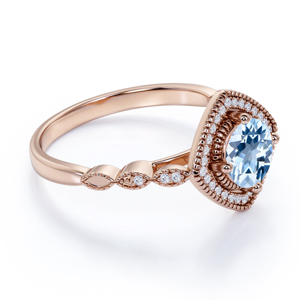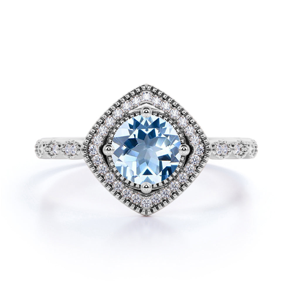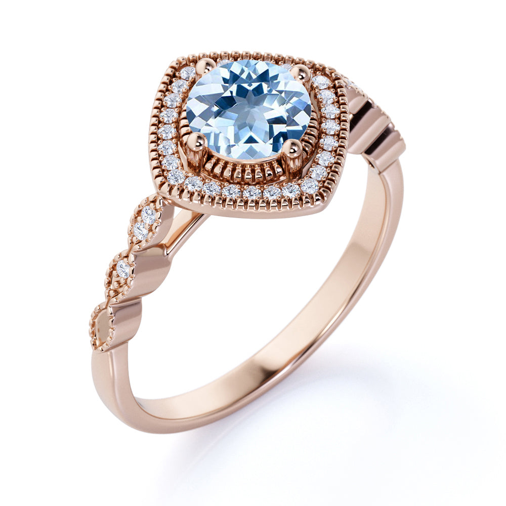 - The Aquamarine and Diamond Engagement Ring can be made in either 10k, 14k, or 18k real solid gold and in any color between Rose, White or Yellow.