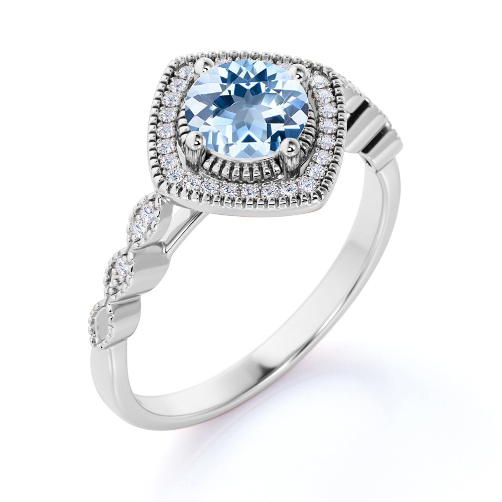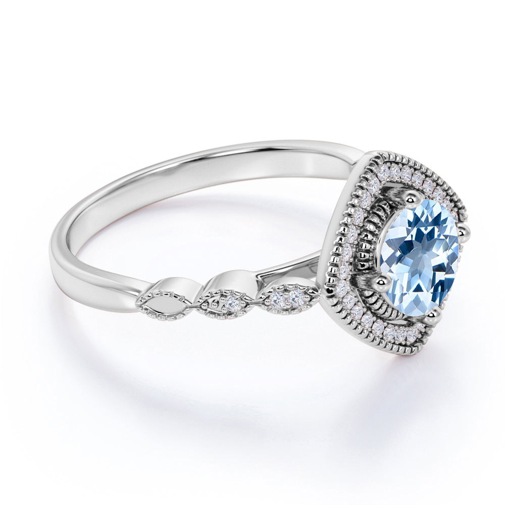 Antique style 1.25 Carat Aquamarine and Diamond Engagement Ring in White Gold