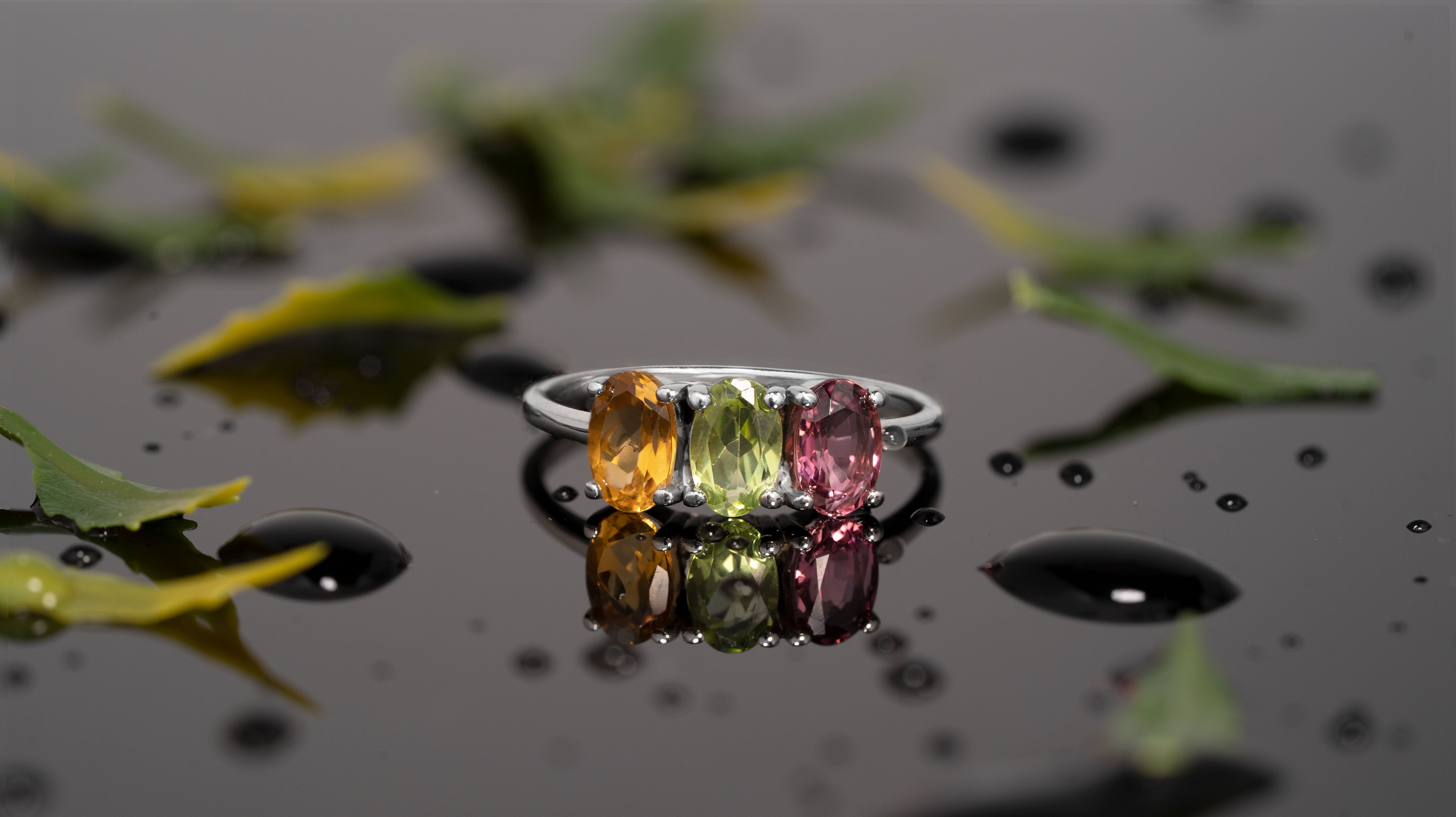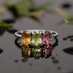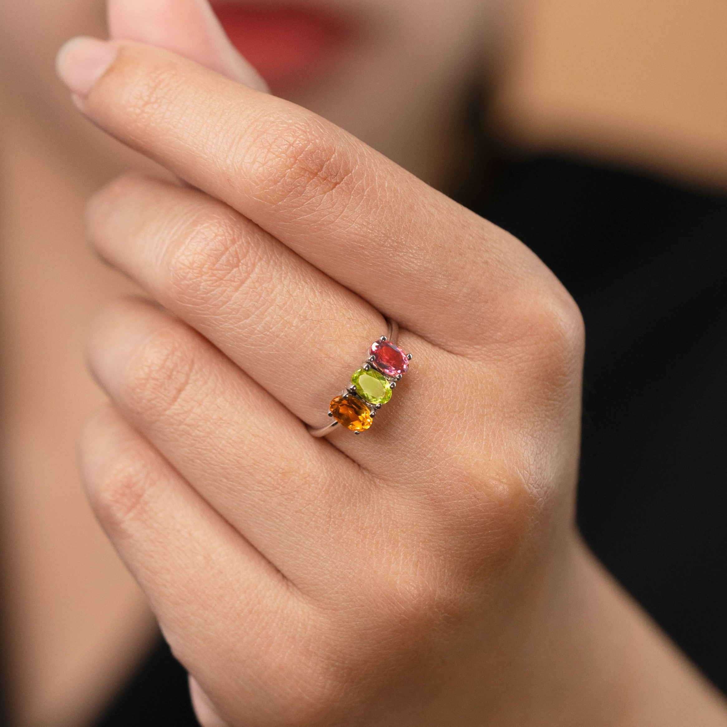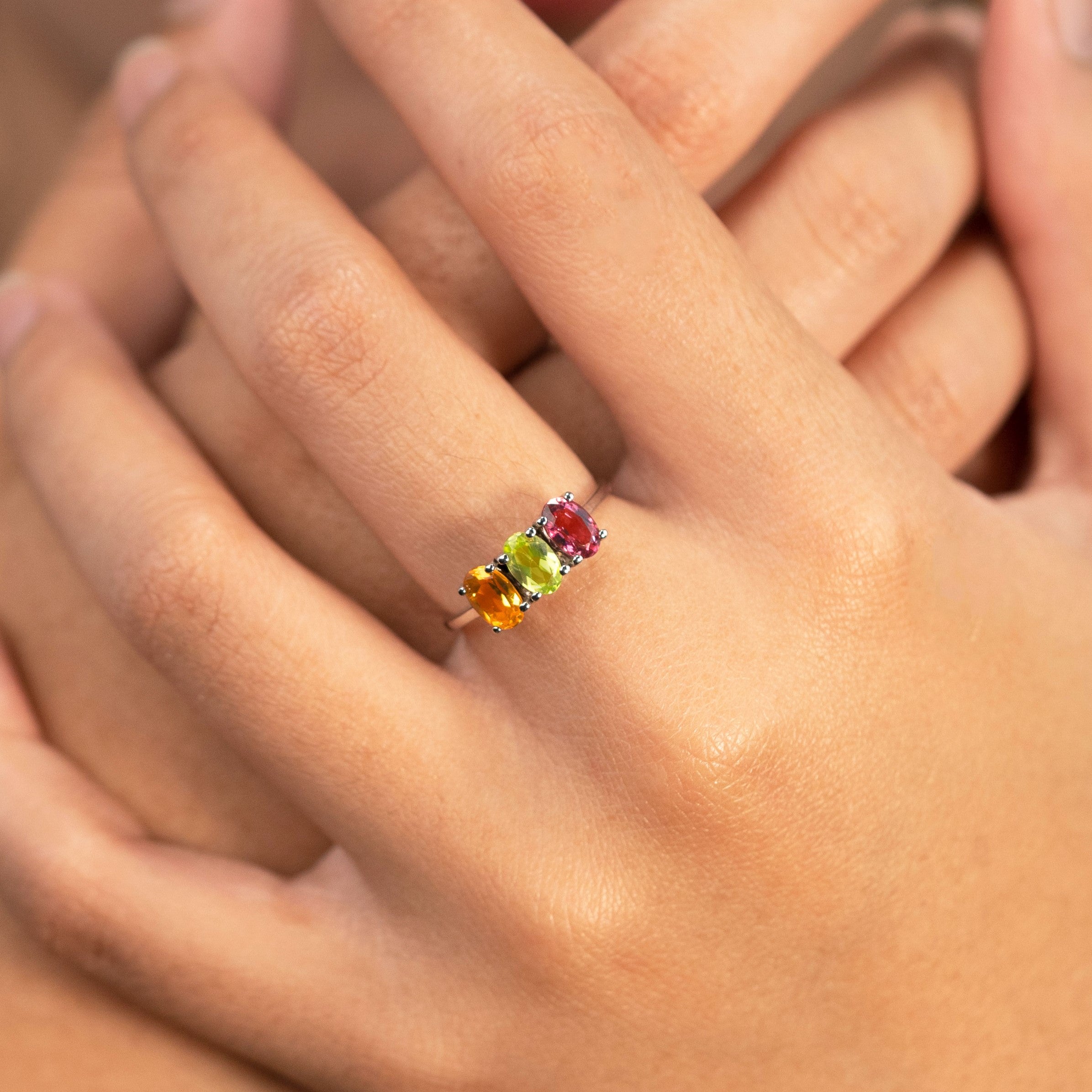 Antique Three stone Oval cut Multi Birthstone Personalized Engagement ring in 18k white gold over silver