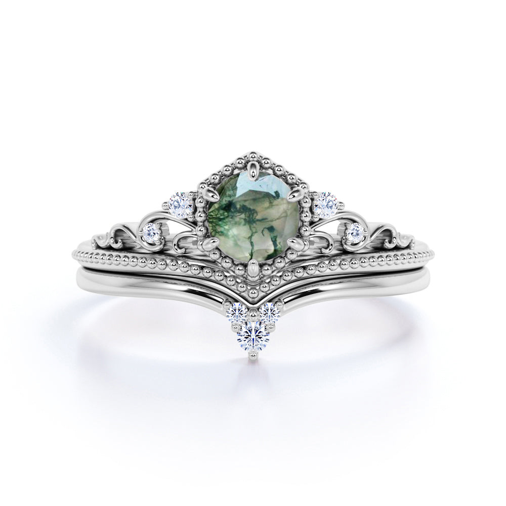 Paint your love story with this Antique Tiara Design 0.75 Carat Round Cut Transparent Moss Green Agate and Diamond Milgrain Art Deco Wedding Ring Sets in White Gold for Her. This antique tiara design dendritic moss green agate bridal set rings feature 0.5 carat round cut natural moss green agate and .25 carat real genuine side diamond for gold ring and moissanite for silver ring. This art deco wedding ring sets can be customized to either 10k, 14K and Gold over Silver and either Black Gold, Rose Gold, White Gold or Yellow Gold. Also, as your satisfaction is our most priority, we will do our best to have your handmade jewelry be carefully and beautifully crafted by our expert jewelers. The order also comes with a 30-day full refund policy. This green colored minerals with banded inclusions ring will surely be a perfect gift for your special someone. It is believed to bring abundance in wealth and improve self-esteem. Encourage trust and hope with this real green Agate ring that shows a variety of white with green inclusions that resembles moss. The unique green color in its patterns will surely complement every style of its wearer. Perfect for everyday wear, this polished veined moss green Agate gemstone is resistant to chemical attack. Create a fascinating look on your finger with this moss green Agate ring which is available in both solid gold and sterling silver. Precisely handcrafted and created to be unique, no two rings are exactly alike. Being named a growth crystal, this real dendritic moss green Agate encourages spiritual growth and renewed commitment to a higher purpose. Impress your special someone with this beautiful and affordable milky white moss green Agate ring. With its mesmerizing patters of colors and inclusions, this Agate ring will enchant your special someone with gracefulness.