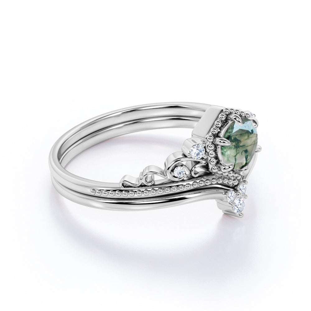 0.75 Carat Round Cut Moss Agate Milgrain Wedding Ring Set