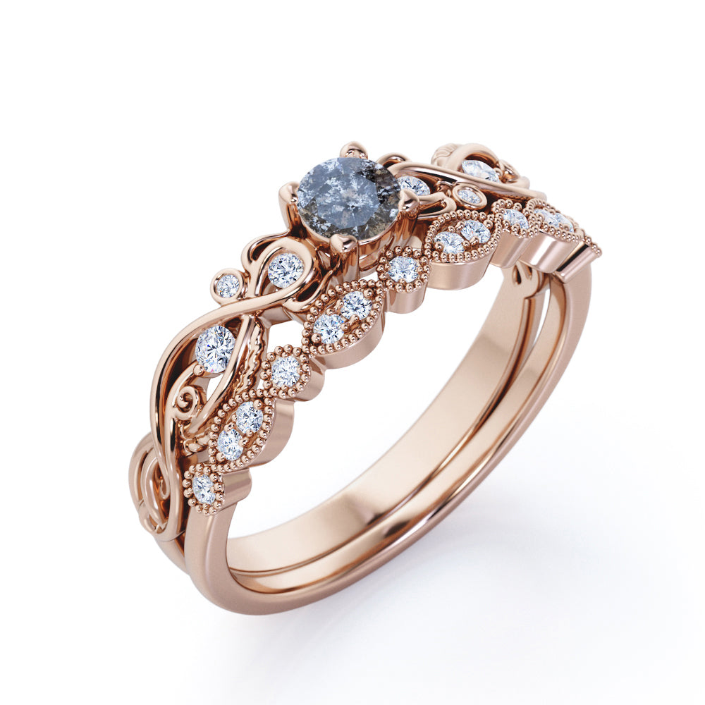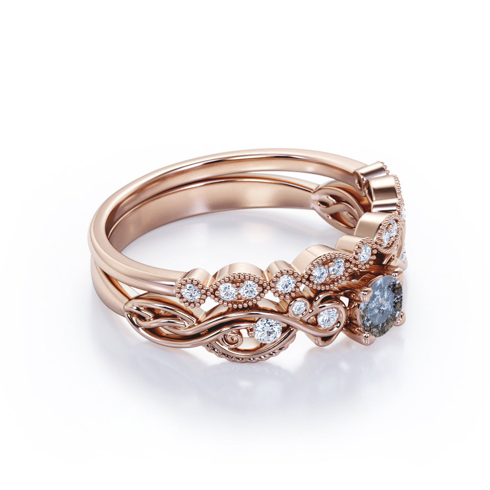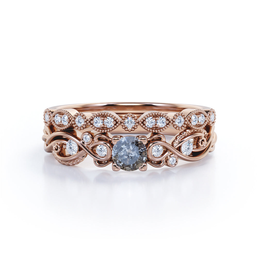 Antique 0.75 Ct Round Salt and Pepper Diamond Wedding Ring Set