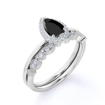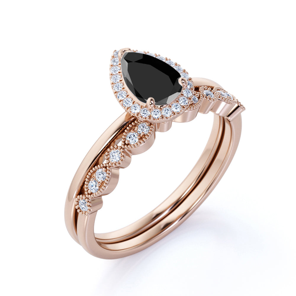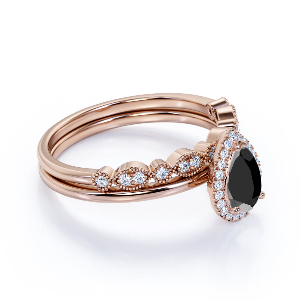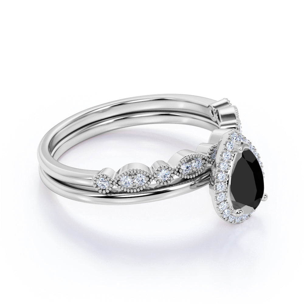 Antique Vintage 1.50 Carat Pear cut Artdeco Halo Bridal Wedding Ring Set with Lab Black Diamond for Her in White Gold