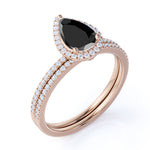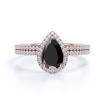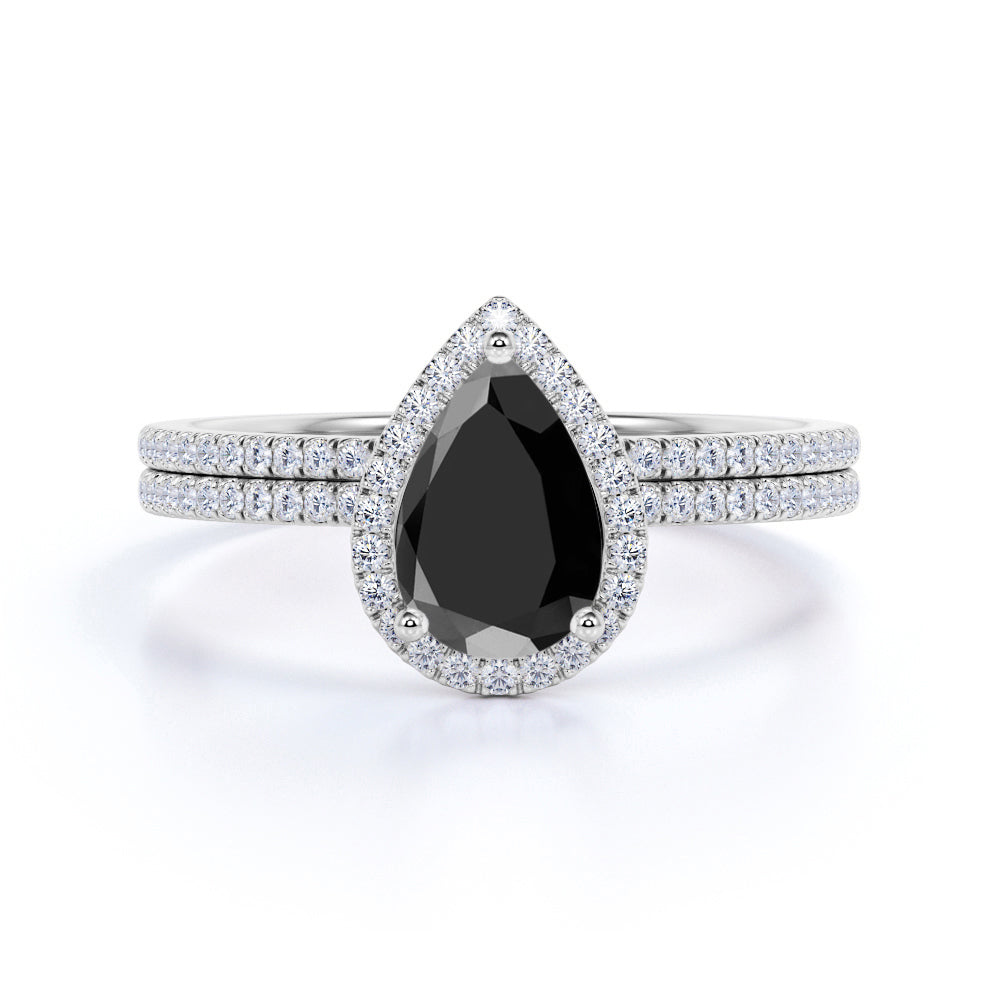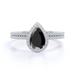 Antique Vintage 1.75 Carat Pear cut Lab Black Diamond Halo Wedding Ring Set for Women in White Gold