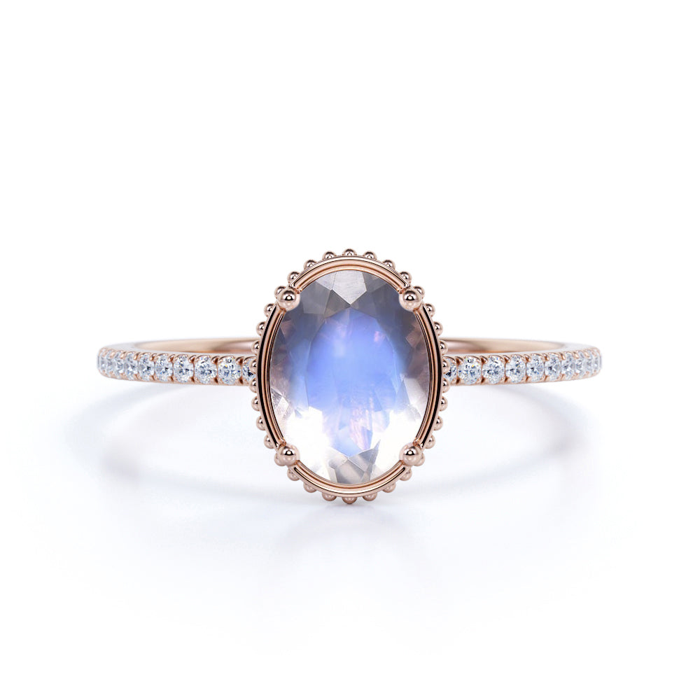 Simple Art Deco 1.25 Carat Oval Cut Rainbow Moonstone Ring with Authentic Diamond in Rose Gold