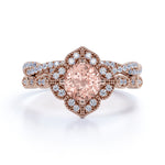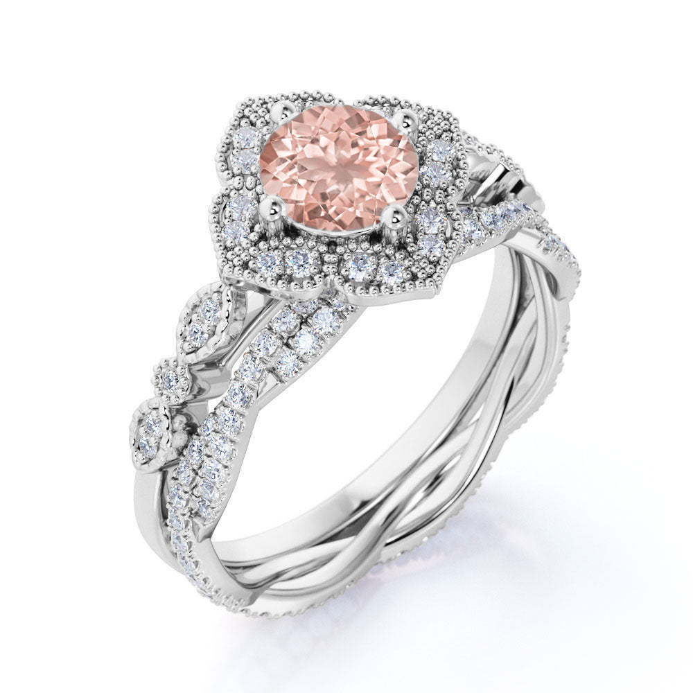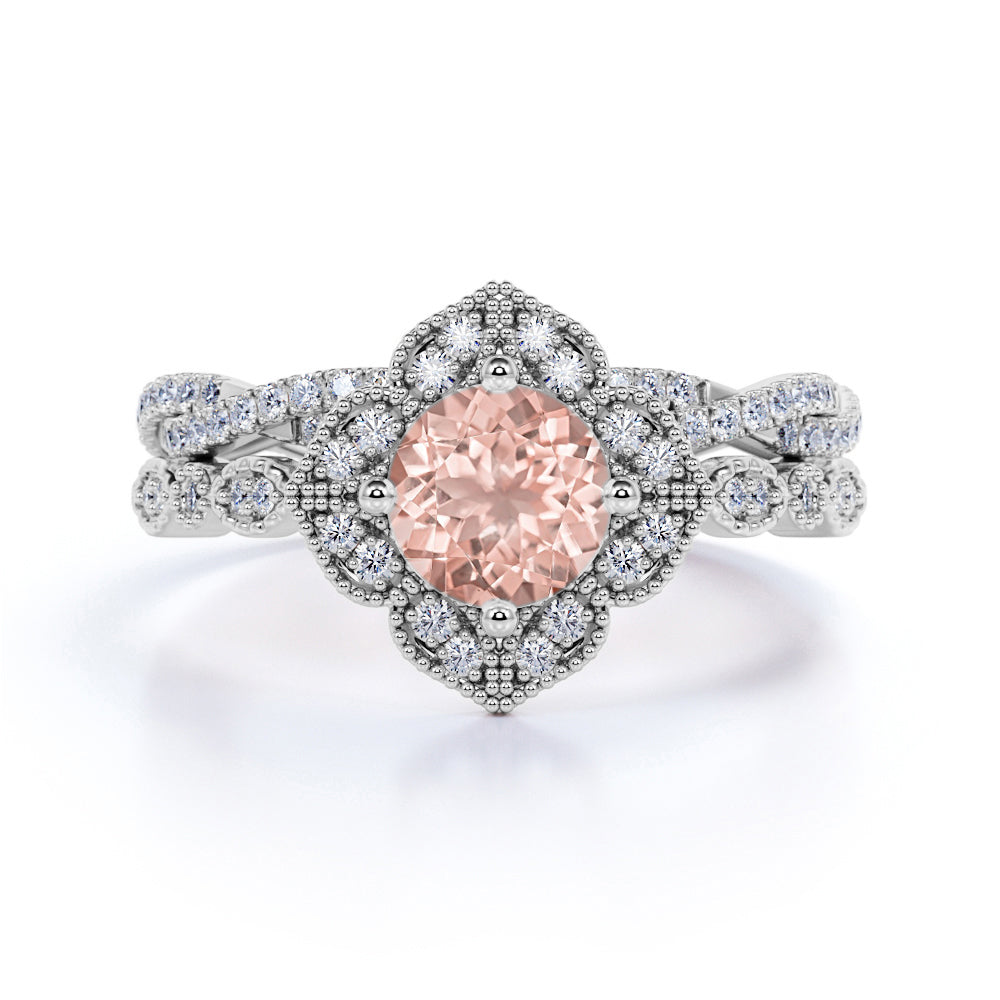 Art Deco 1.50 Carat Round Cut Peach Morganite and Diamond Bridal Ring Set in White Gold