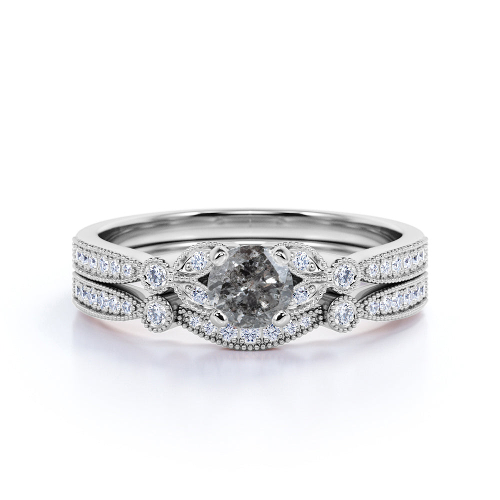 Art Deco 1 Carat Round Cut Natural Salt and Pepper Diamond Vintage Floral Wedding Ring Set in 18k White Gold over Silver
