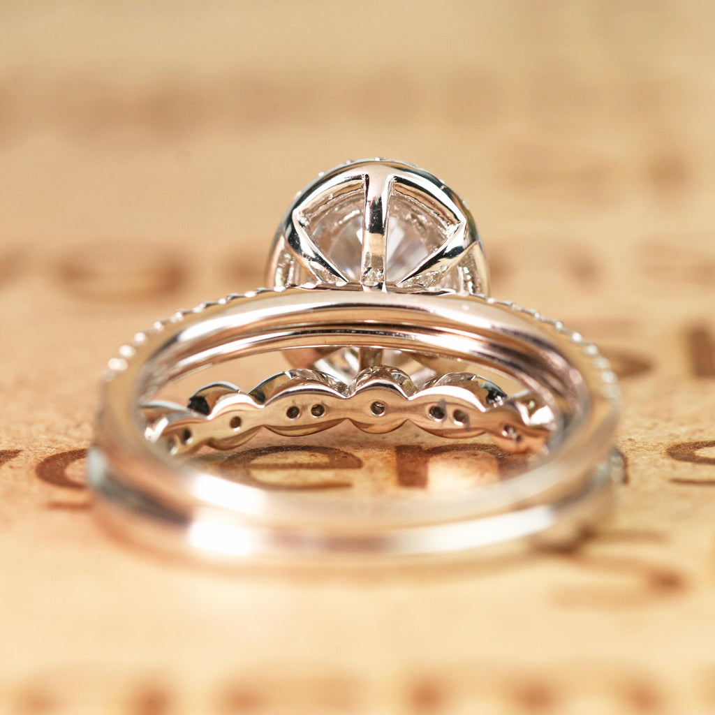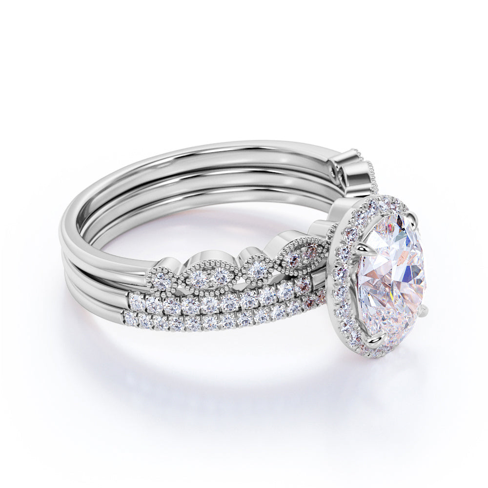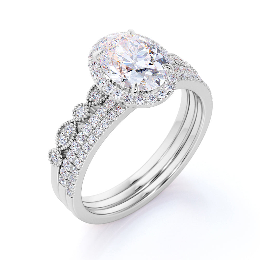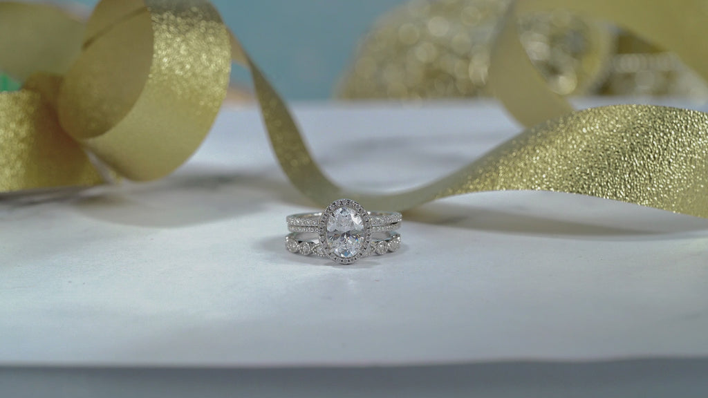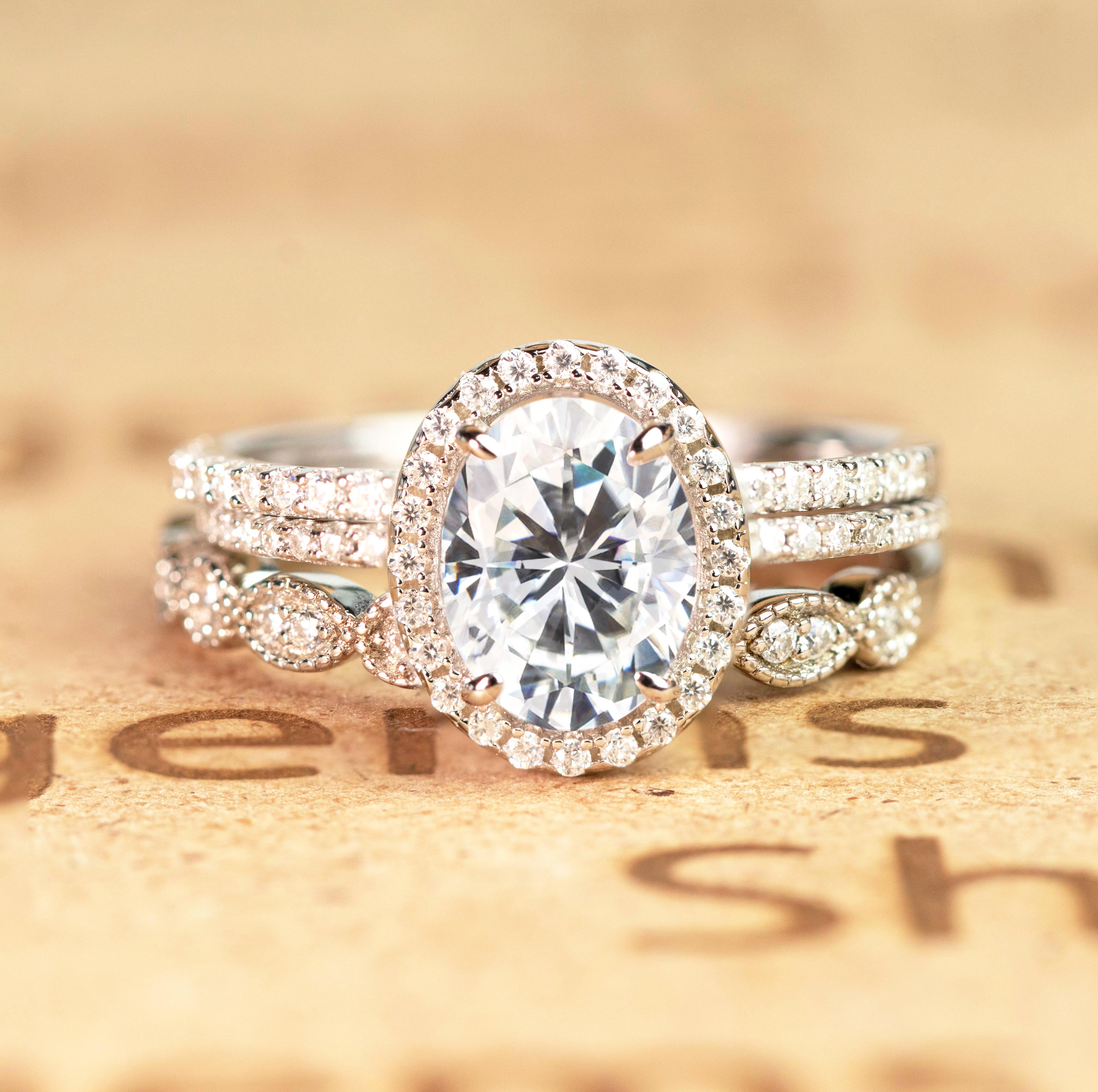 Art Deco 2 Carat Oval cut Real Moissanite Wedding Trio Ring Set with Engagement Ring and 2 Wedding Bands in 18k Gold Over Silver