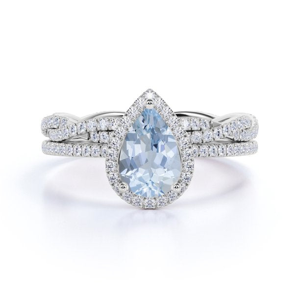 Art Deco 1.75 Carat Pear Cut Aquamarine and Moissanite Infinity Wedding Ring Set in 18k White Gold over Silver
