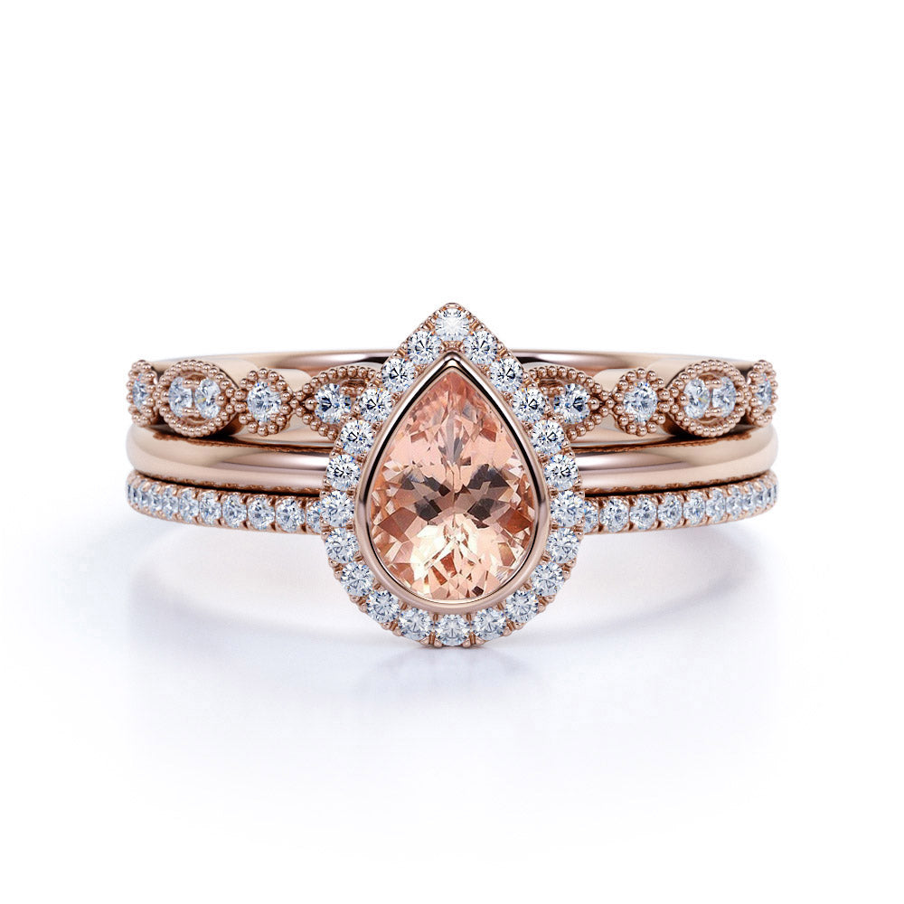 Art Deco 1.75 Carat Pear Shape Peach Morganite and Diamond Trio Wedding Ring Set in Rose Gold