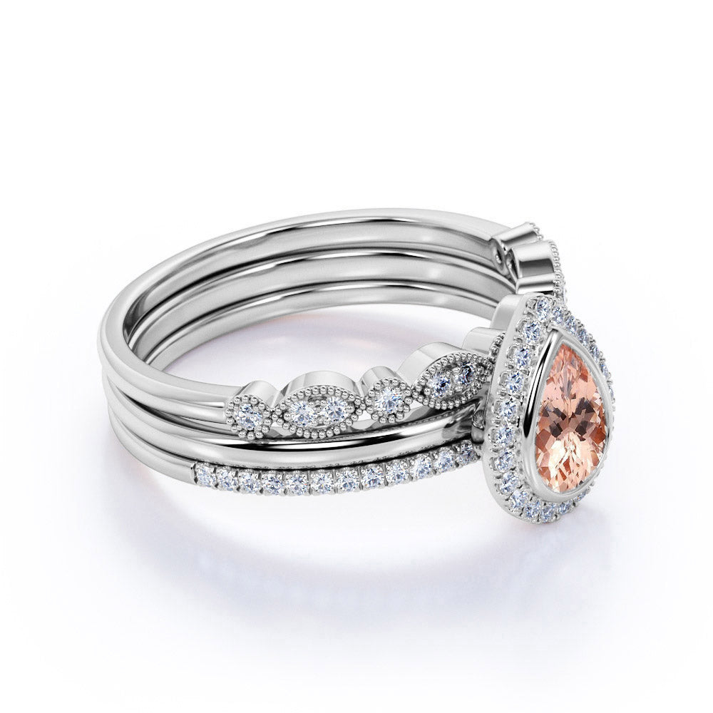 This is a very beautiful handmade art deco style Morganite and Diamond Trio Wedding Ring Set for women. The trio bridal wedding ring set is made with real peach pink morganite, real diamonds and on real gold. The handcrafted engagement ring features peach pink 1 carat pear shape morganite in the center, and 2 matching wedding ring bands have 0.75 carat of diamonds together, for a total carat weight of 1.75 Carats.