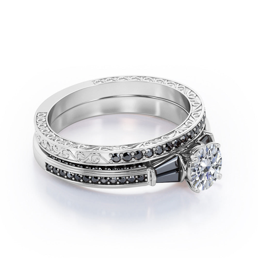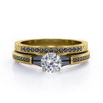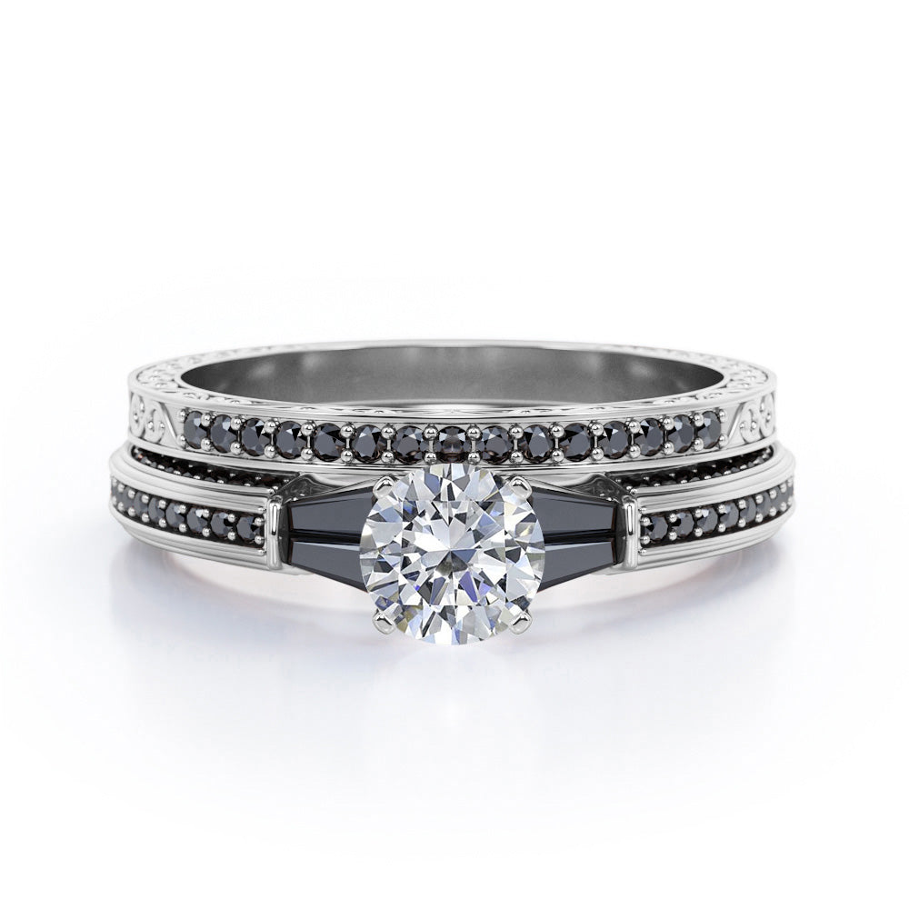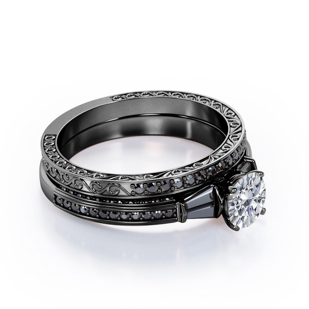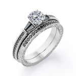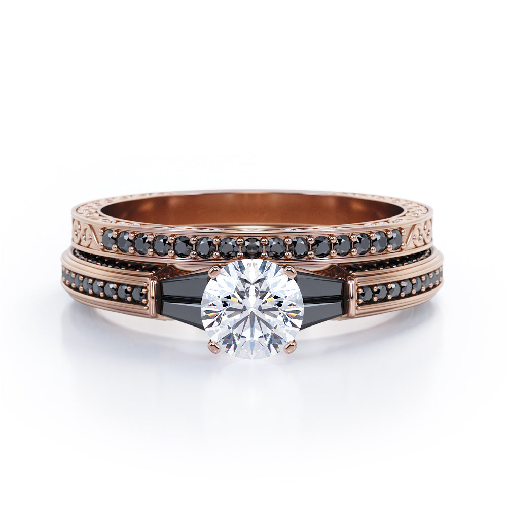 Bring out the sparkle in someone you care about with these Art Deco 5-Stone 1.55 TCW Round Shape Moissanite with Lab Created Black diamond Triple Pave-Channel Wedding Set in Rose Gold Handcrafted with care into a wonderful round cut by our most talented jewelers, these beautiful Moissanite jewelry features total 1.55 carat Moissanite with lab-created Black diamond side stones on solid white gold. For those looking for something a little out of the ordinary, these vintage moissanite wedding rings are an excellent choice. with its dazzling beauty, these vintage moissanite wedding rings are magnificent in its brilliance and clarity and will be an unmistakable addition to any jewelry collection. Beautiful and affordable, these Moissanite rings for women are a great choice for any woman's jewelry collection. These affordable Moissanite engagement rings are a great option if you are in search for something truly special to give to your special someone. Also, these vintage moissanite band rings can be customized to your own choice of metal colors: White gold, rose gold, yellow gold and black gold in 18k Gold over Silver, 10k and 14k gold metal options. Let's show her how much you care by giving her these vintage moissanite wedding rings.