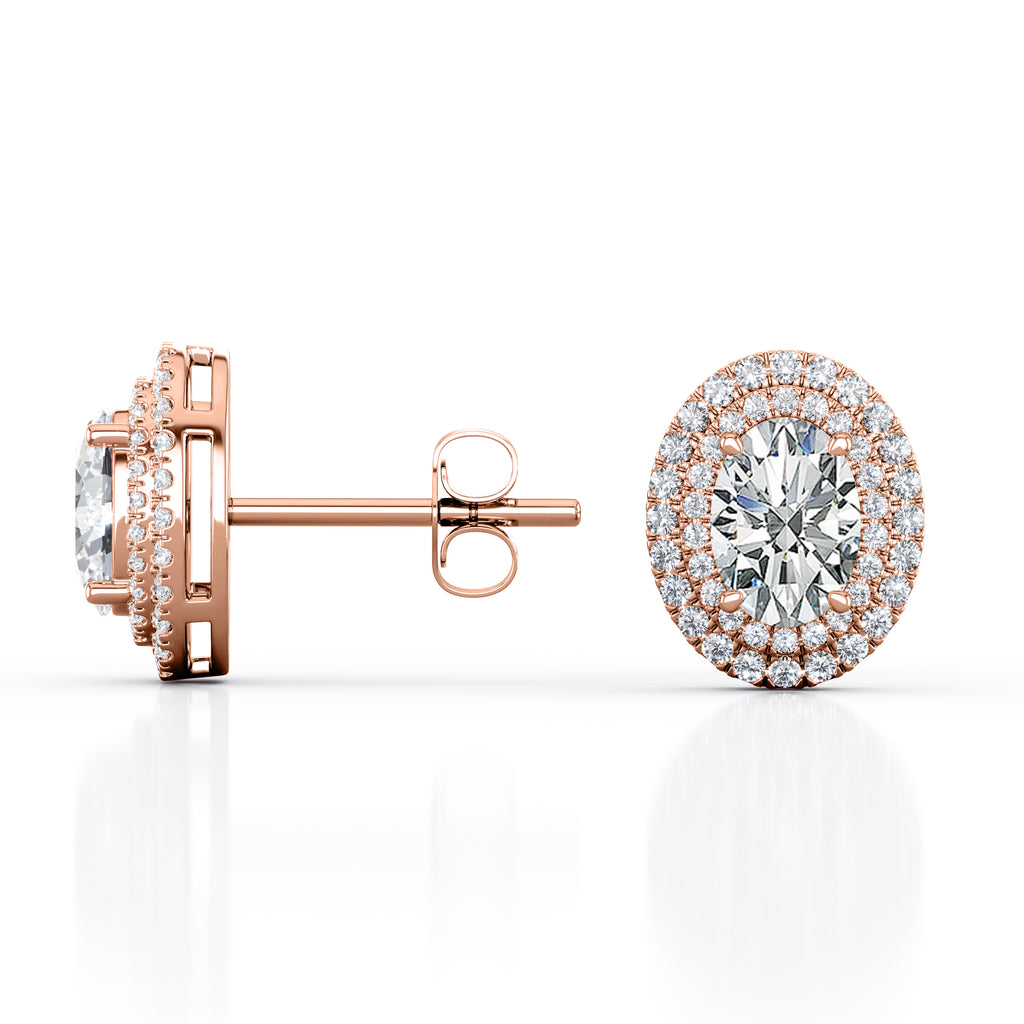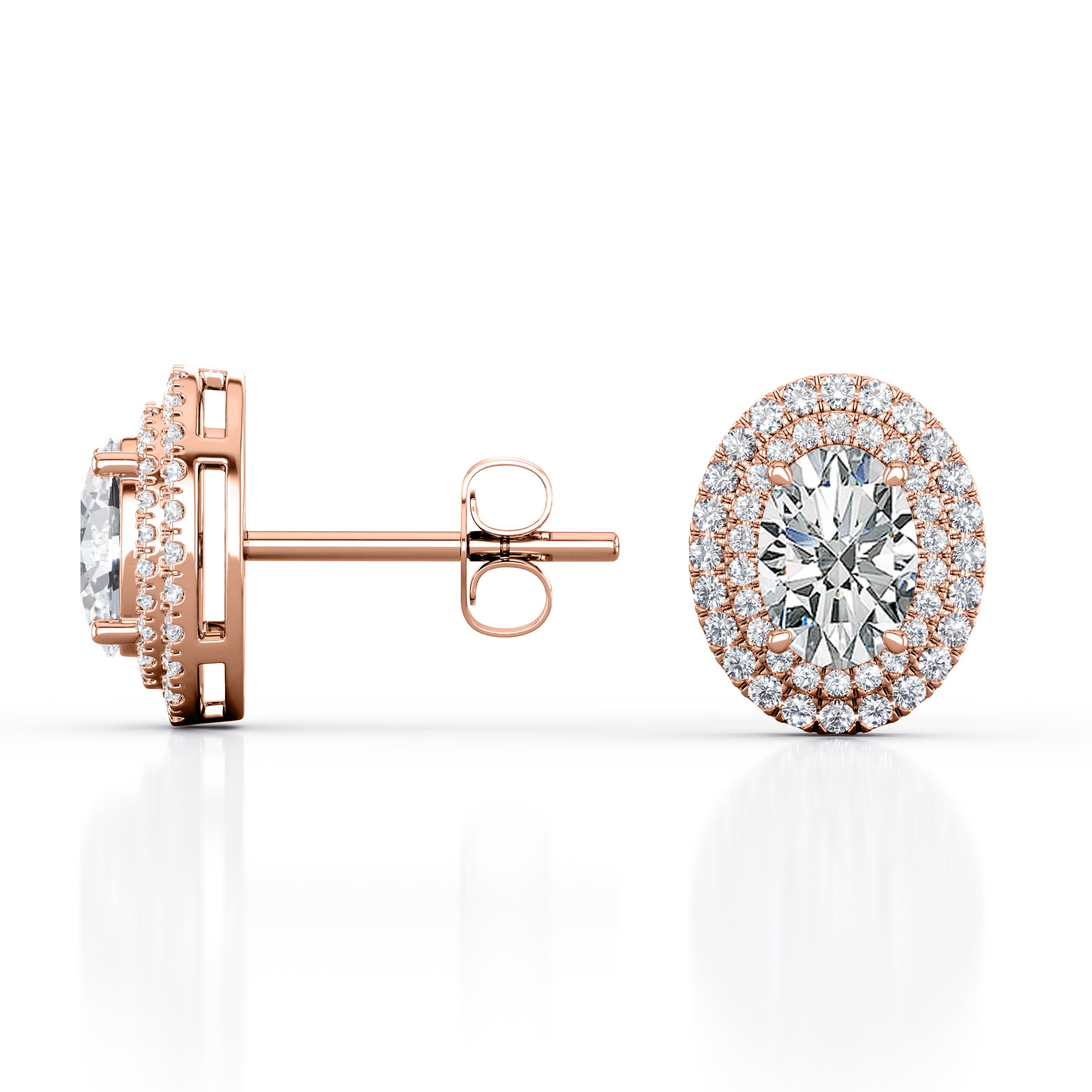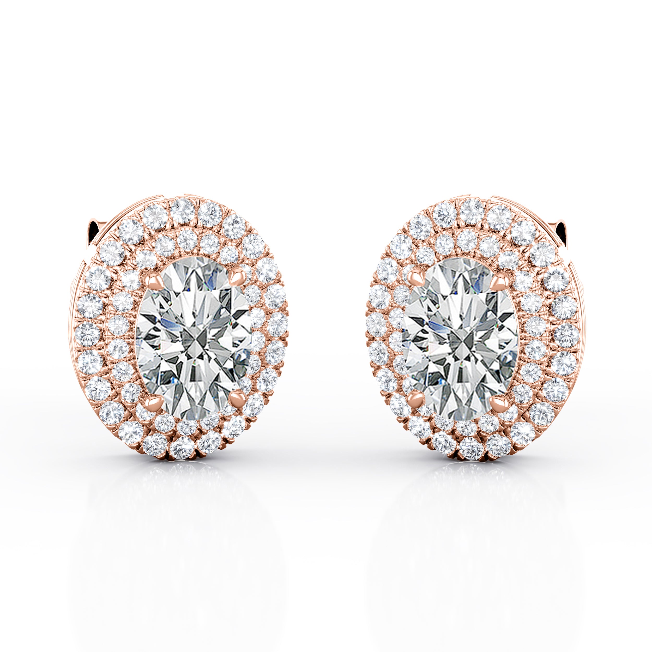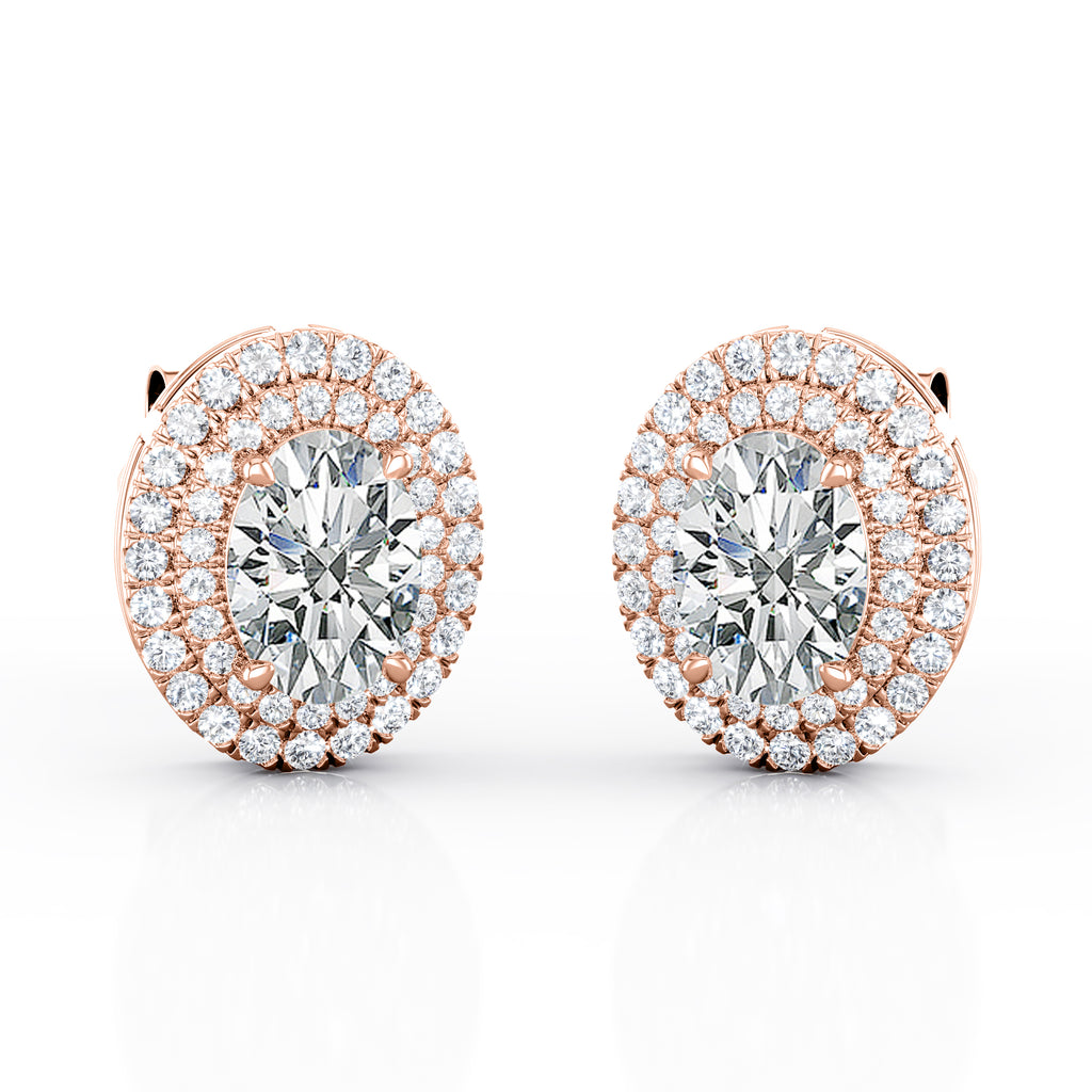 Art Deco Basket Set 2.20 Carat Oval Cut Certified Moissanite and Diamond Double Halo Stud Earrings in Rose Gold