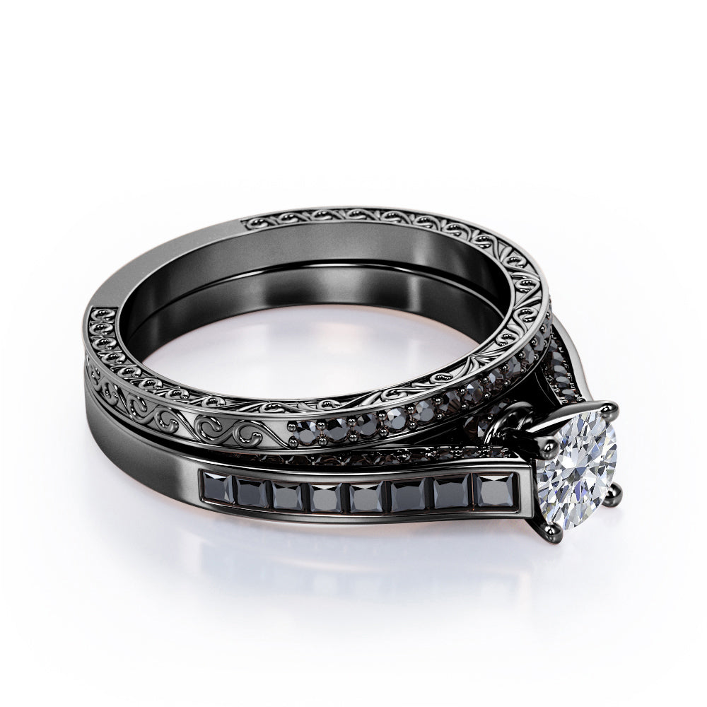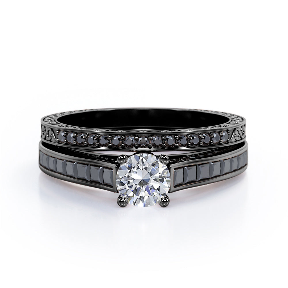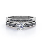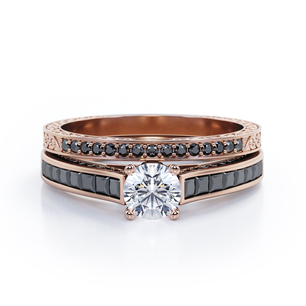 Create an impressive portrait of your love story with these Art Deco Cathedral 1.55 TCW Round Shape Moissanite with Lab Created Black diamond Pave and Channel Wedding Set in Rose Gold. Handcrafted with care into a wonderful round cut by our most talented jewelers, these exceptional gem engagement rings integrates total 1.55 carat Moissanite with lab-created Black diamond side stones on solid white gold. Distinct and unusual, these Moissanite rings are ideal for those who wish to express their charisma and uniqueness. With its dazzling beauty, these affordable wedding rings will accentuate any outfit the wearer chooses to put on. Beautiful and affordable, these wedding anniversary rings are a great choice for any woman's jewelry collection. These Moissanite rings are regarded as a symbol of your undying devotion to your partner. Additionally, these Moissanite rings for women can be customized, either in White gold, rose gold, yellow gold or black gold in 18k Gold over silver, 10k and 14k gold metal options upon customer request. Your love story will be complete with these Moissanite promise rings.
