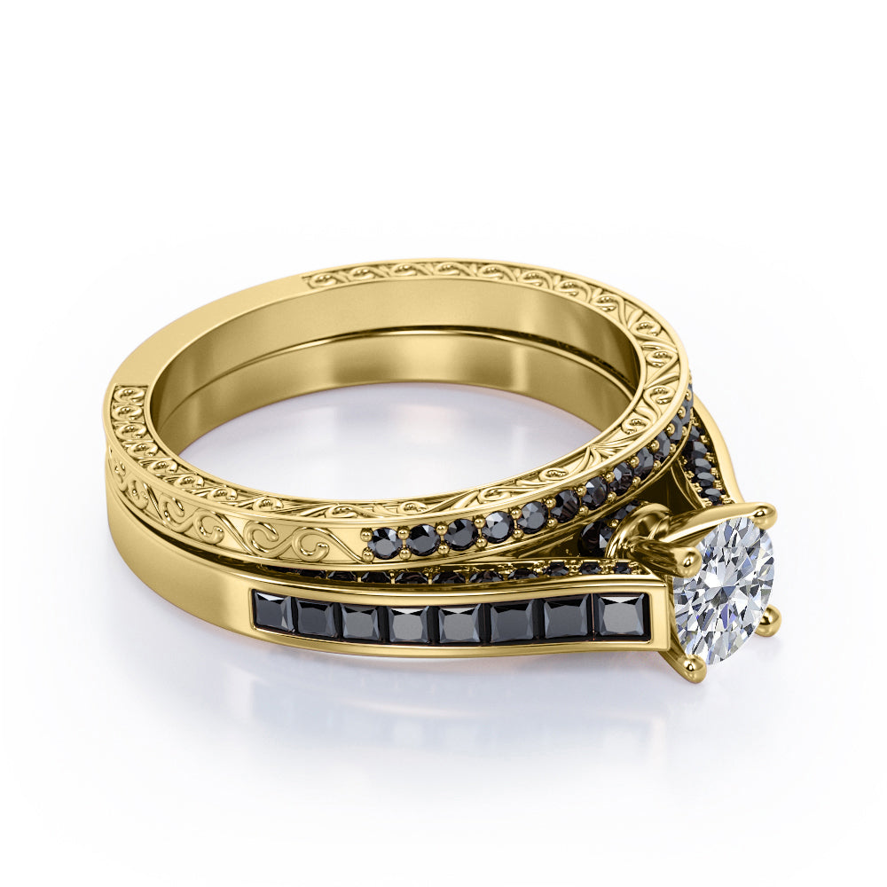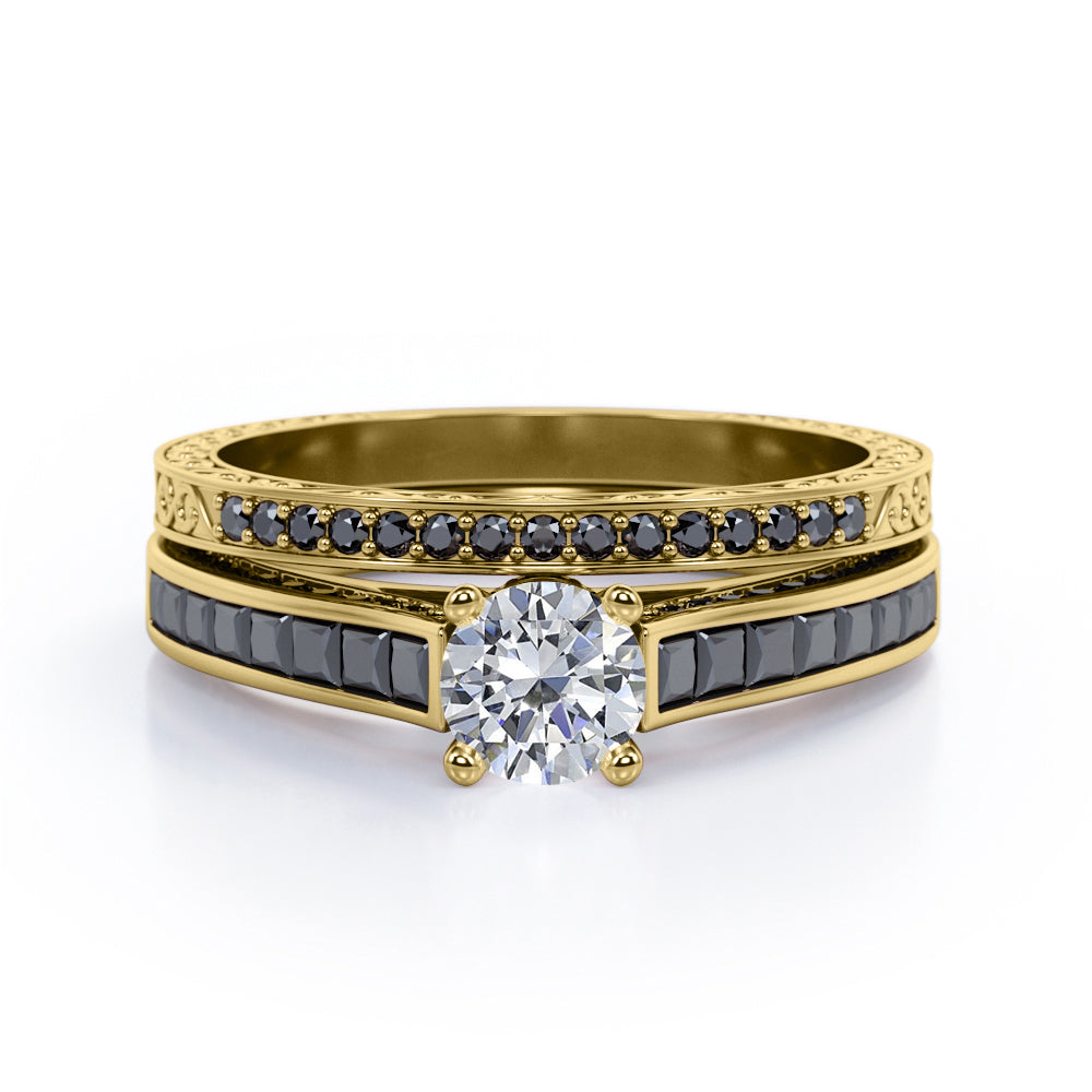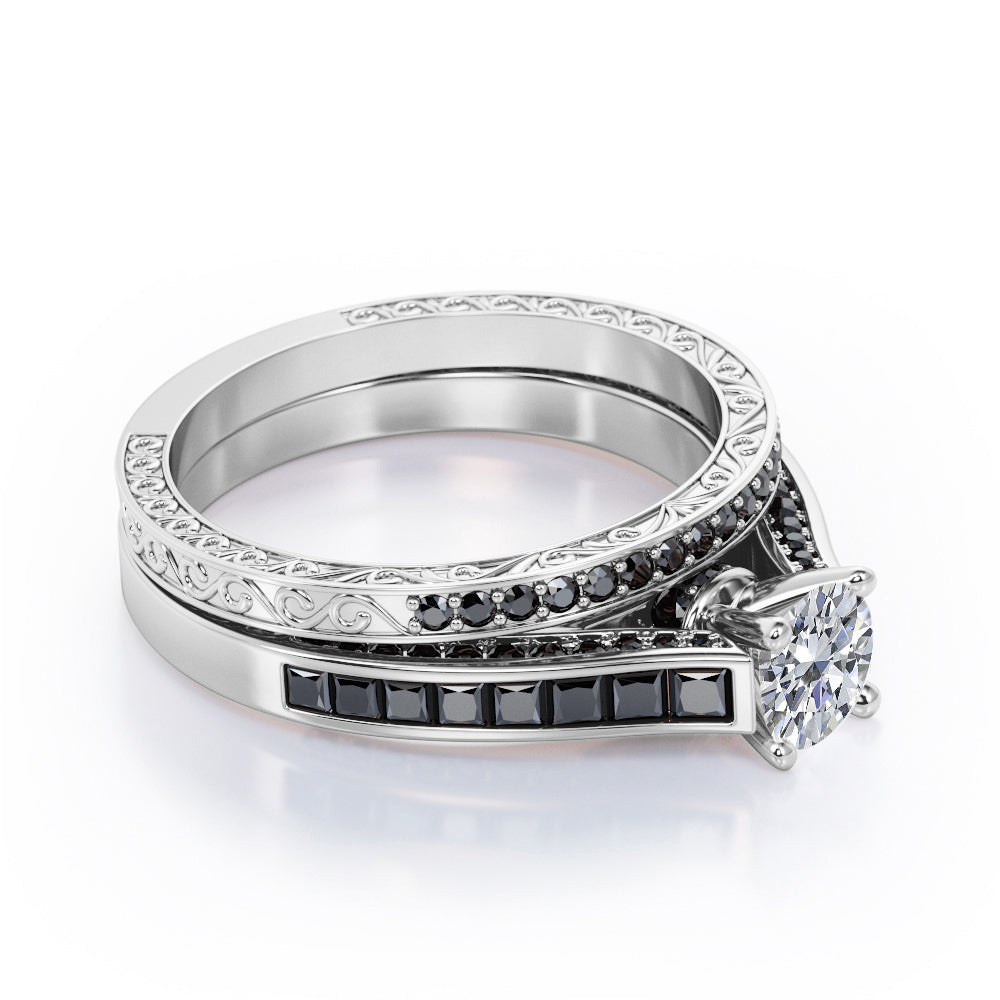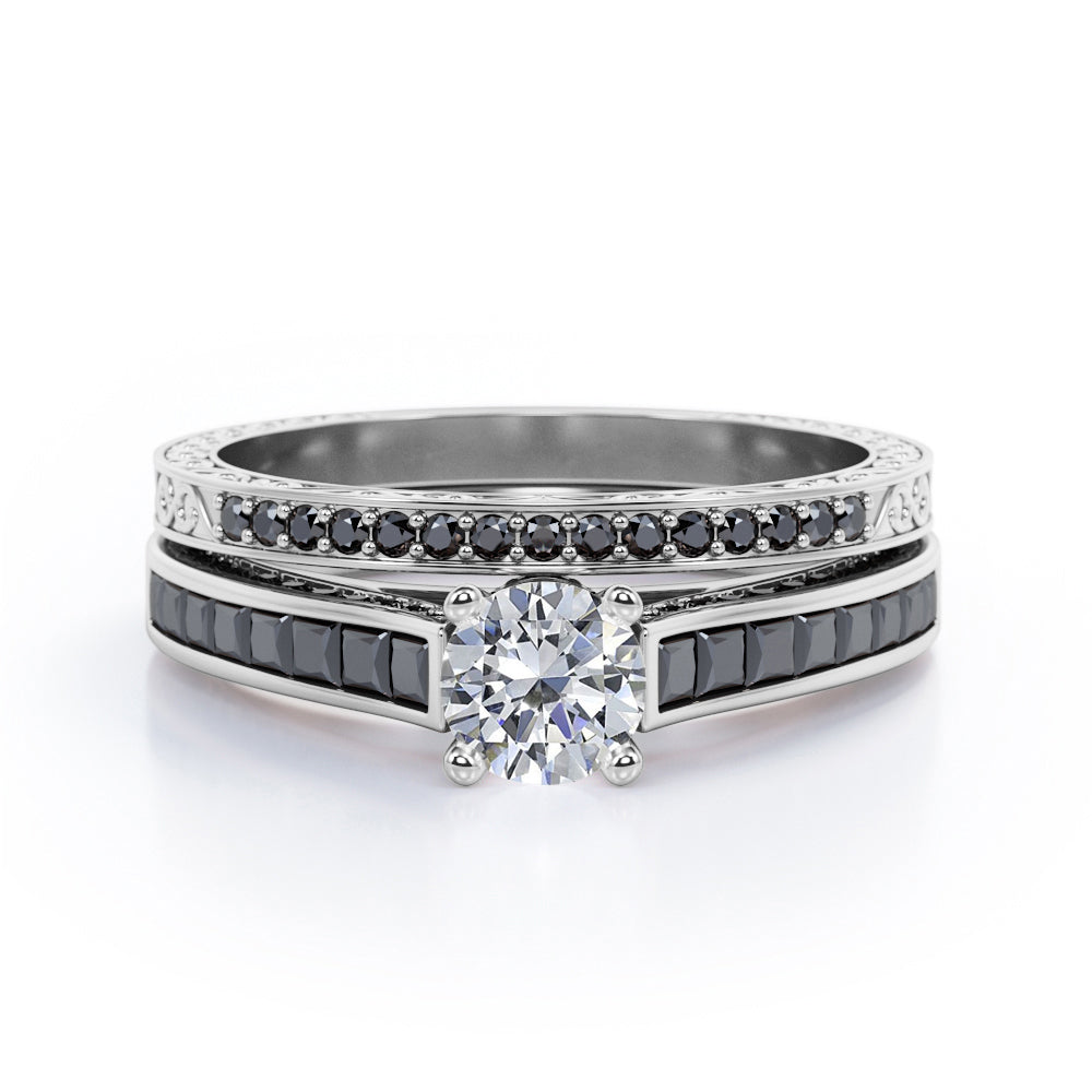 Create an impressive portrait of your love story with these Art Deco Cathedral 1.55 TCW Round Shape Moissanite with Lab Created Black diamond Pave and Channel Wedding Set in Rose Gold. Handcrafted with care into a wonderful round cut by our most talented jewelers, these exceptional gem engagement rings integrates total 1.55 carat Moissanite with lab-created Black diamond side stones on solid white gold. Distinct and unusual, these Moissanite rings are ideal for those who wish to express their charisma and uniqueness. With its dazzling beauty, these affordable wedding rings will accentuate any outfit the wearer chooses to put on. Beautiful and affordable, these wedding anniversary rings are a great choice for any woman's jewelry collection. These Moissanite rings are regarded as a symbol of your undying devotion to your partner. Additionally, these Moissanite rings for women can be customized, either in White gold, rose gold, yellow gold or black gold in 18k Gold over silver, 10k and 14k gold metal options upon customer request. Your love story will be complete with these Moissanite promise rings.