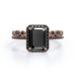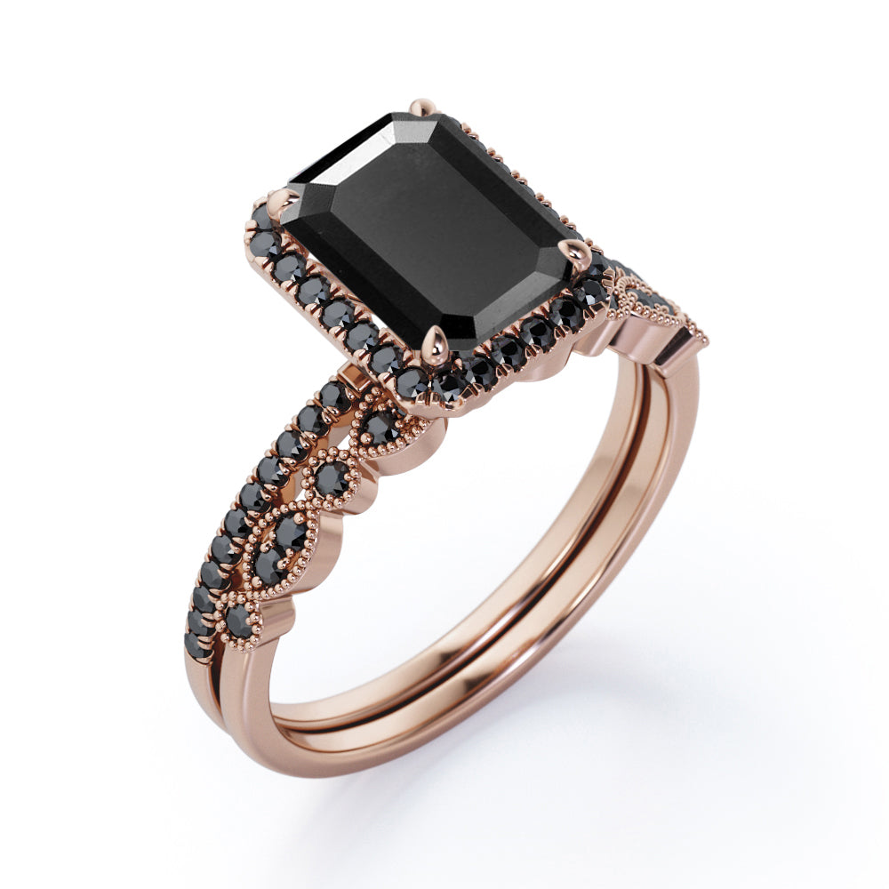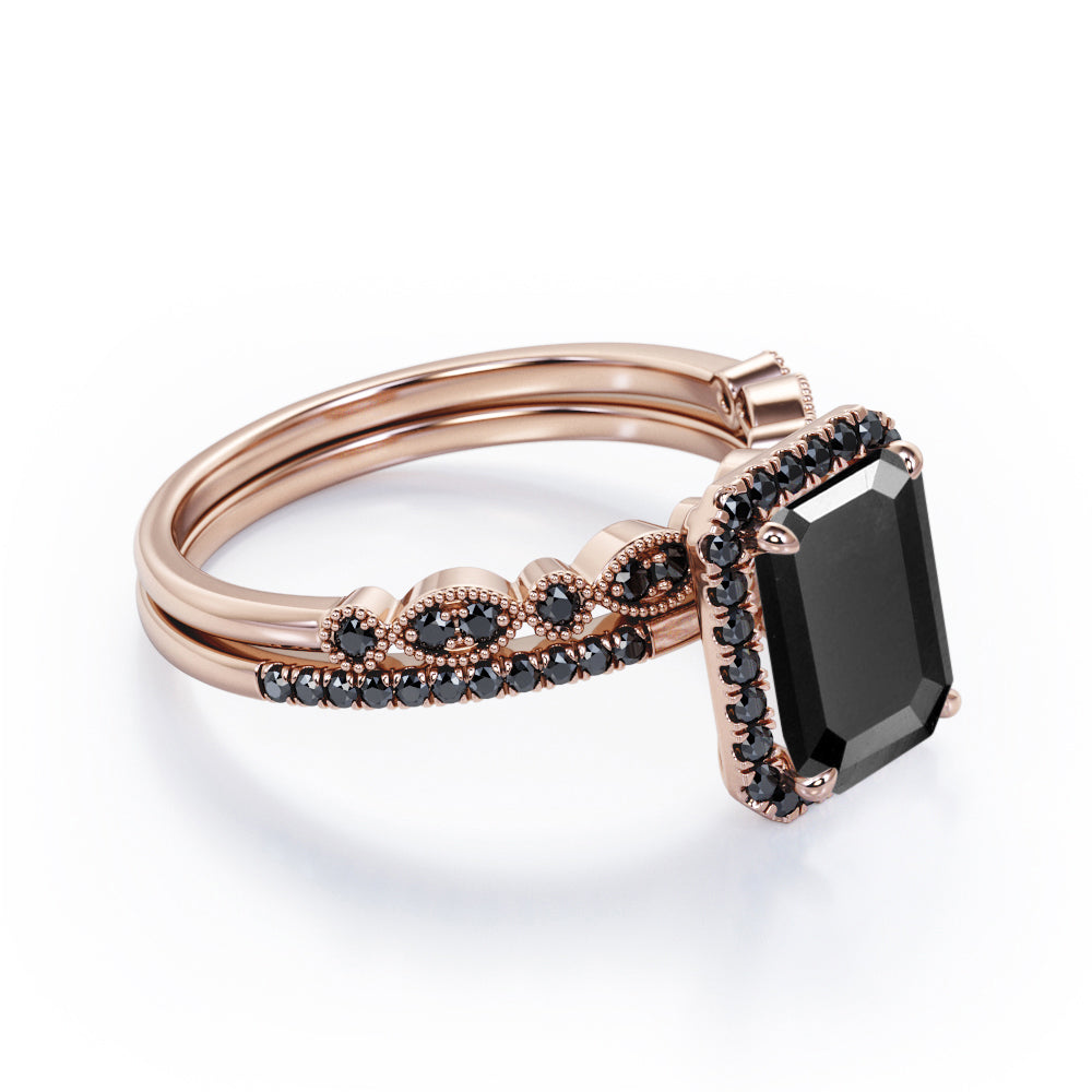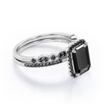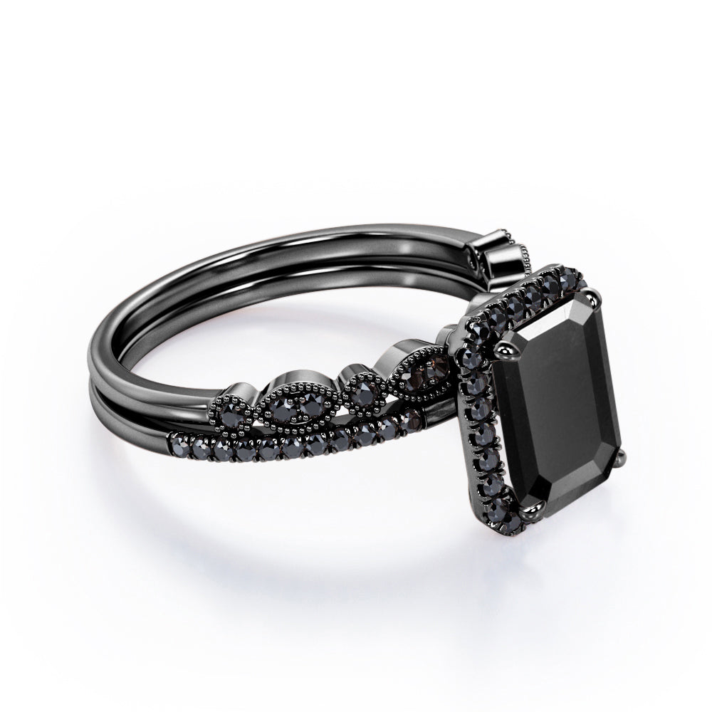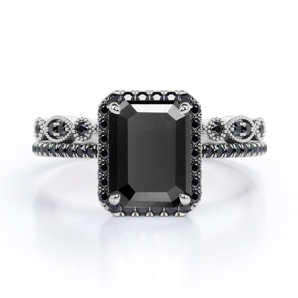 Create a magical moment with this Art Deco Filigree Milgrain 1.65 TCW Emerald Cut Lab Created Black Diamond Halo-Style Wedding Set in White Gold. Skillfully hand-cut into a nice emerald cut by our skilled jewelers, this exceptional statement black diamond rings set features total 1.65 carat lab created black diamond on solid white gold. Special and non-traditional, this black diamond wedding rings set is perfect for those who would love to express their charisma and uniqueness. With its charming color, this black diamond stone engagement ring set will absolutely enhance every style of its wearer. This black diamond rings set is beautiful and accessible since it is available at an affordable price. This black diamond stone engagement ring set can definitely help you out. Also, this black diamond gemstone ring set can be customized, either in white gold, rose gold, yellow gold or black gold in 10k and 14k gold metal options upon customer request. Let’s impress her with this black diamond wedding rings set and she will be eternally joyful.