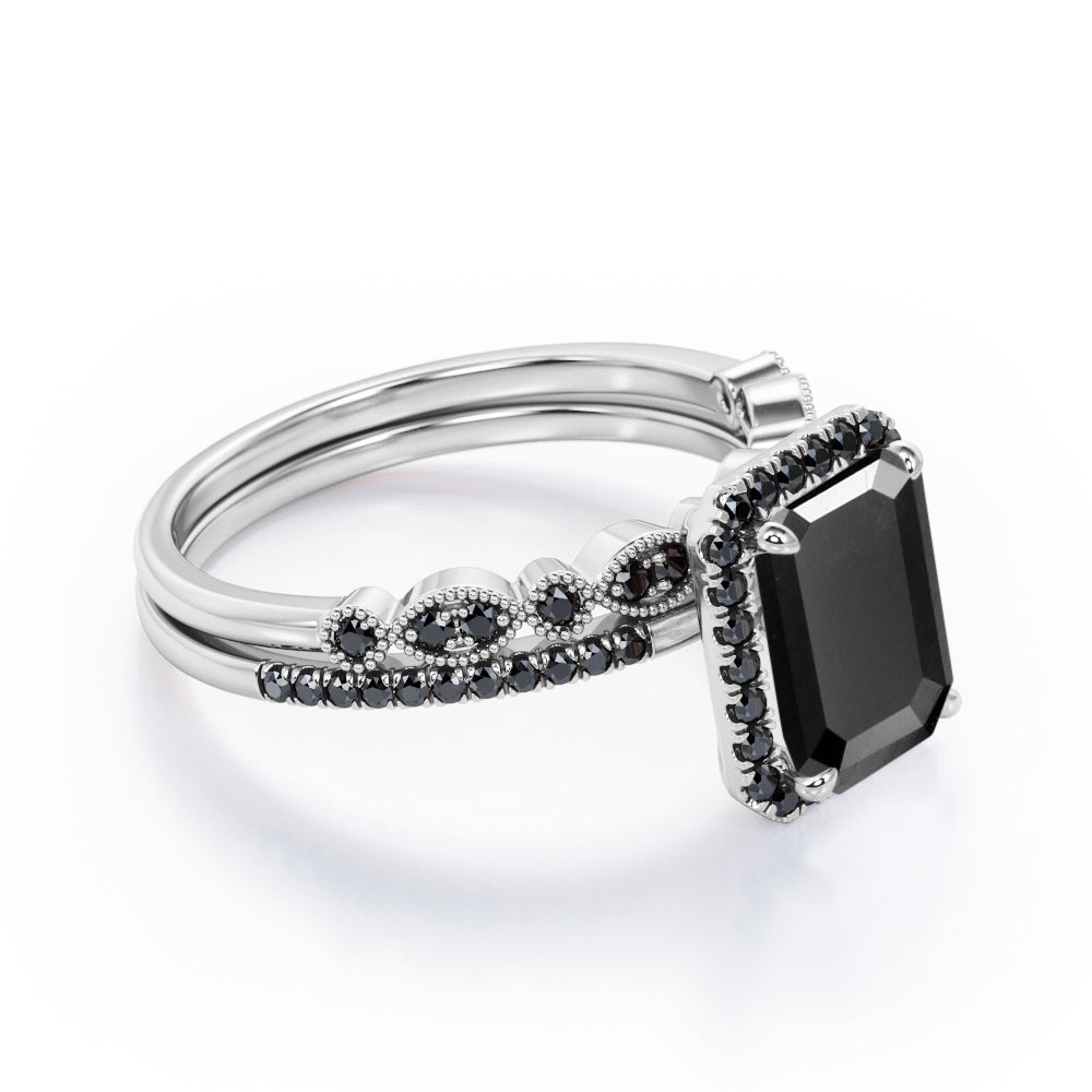 Art Deco Filigree Milgrain 1.65 TCW Emerald Cut Lab Created Black Diamond Halo-Style Wedding Set in White Gold