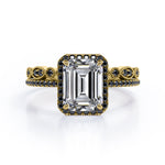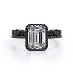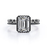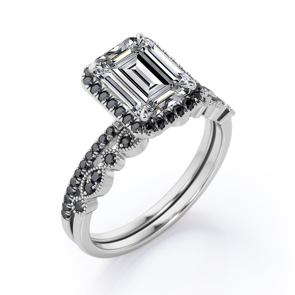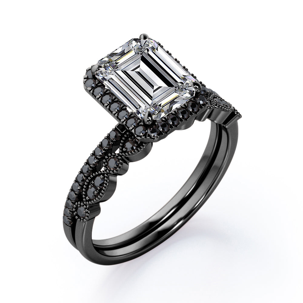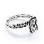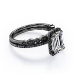 Be shinily standout from the crowd with this Art Deco Filigree Milgrain 1.65 TCW Emerald Cut Moissanite with Lab Created Black Diamond Halo-Style Wedding Set in Rose gold. Skillfully hand-cut into a nice emerald cut by our skilled jewelers, this flawless moissanite anniversary band set is composed of total 1.65 carat moissanite and lab-created black diamonds. Distinctive and extraordinary, this moissanite ring set is well-suited for those who are not quite into normal lifestyle. With naked eyes moissanites look, shine and feel exactly like diamonds. Reflective properties of this moissanite engagement ring set will enhance happiness and attract positive vibes. This moissanite and sterling silver ring set is beautiful and accessible since it is available at an affordable price. Moissanites are the most popular alternative gemstone for diamonds while being at lower and more affordable price. For those who have no idea what to surprise your life partners, this silver moissanite ring set can definitely help you out. This moissanite bridal ring set can be customized, so customers can choose one of metal colors between White gold, rose gold, yellow gold and black gold in 18k Gold over Silver, 10k and 14k gold metal options. In regards to its hardness, moissanite is almost as hard as diamond which means that it is notably durable. Let’s impress her with this moissanite fine jewelry, and she will be eternally joyful.