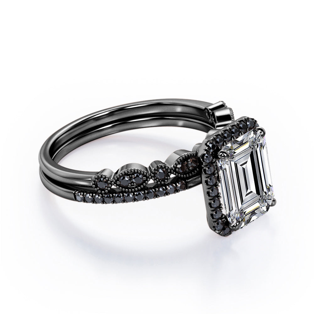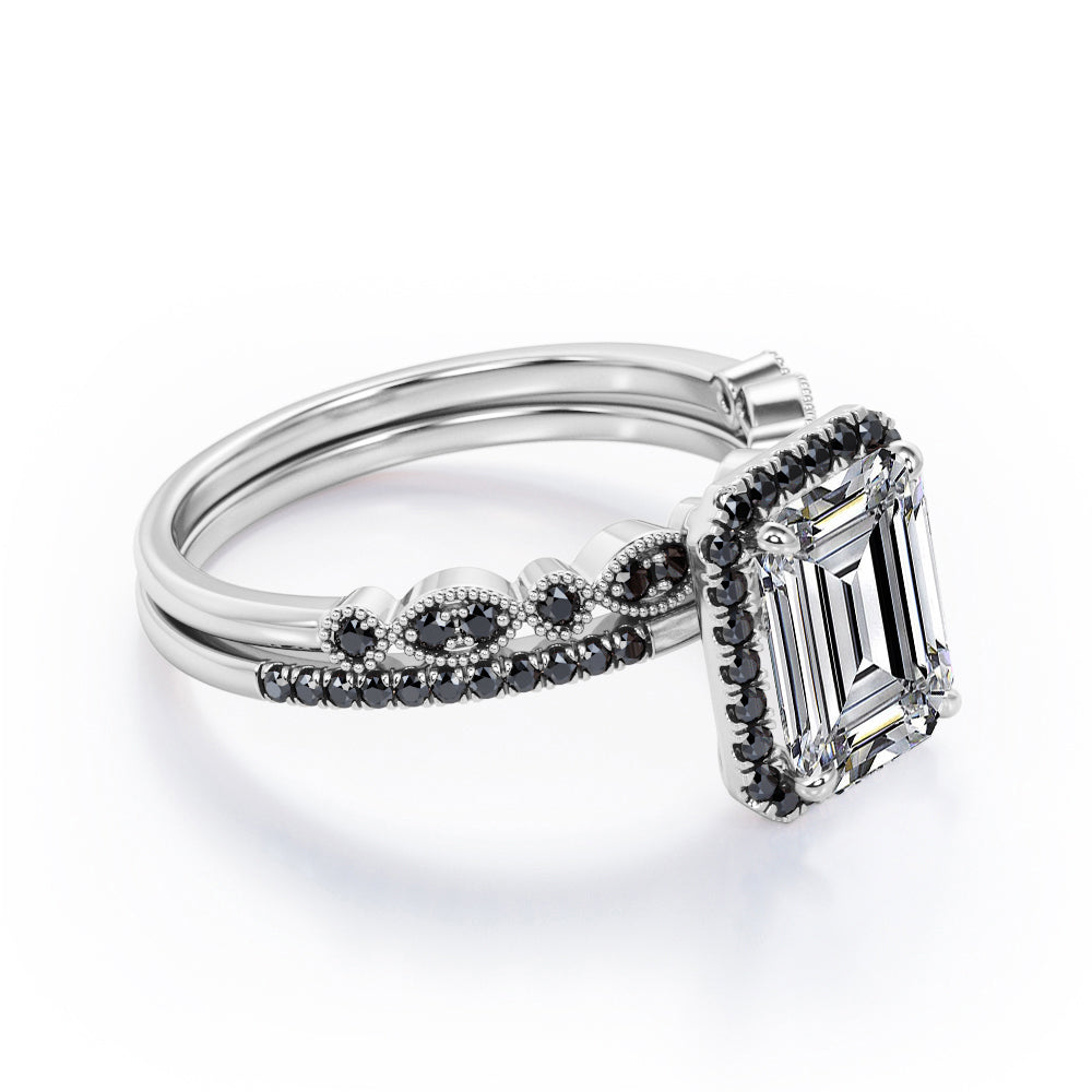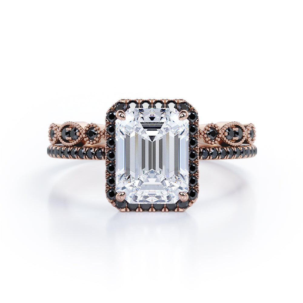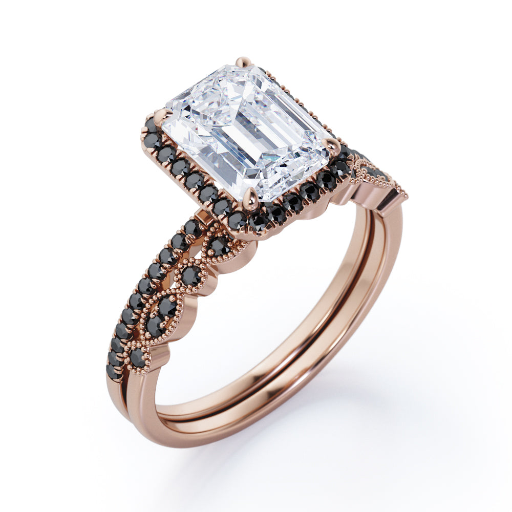 Art Deco Filigree Milgrain 1.65 TCW Emerald Cut Moissanite with Lab Created Black Diamond Halo-Style Wedding Set in Rose Gold