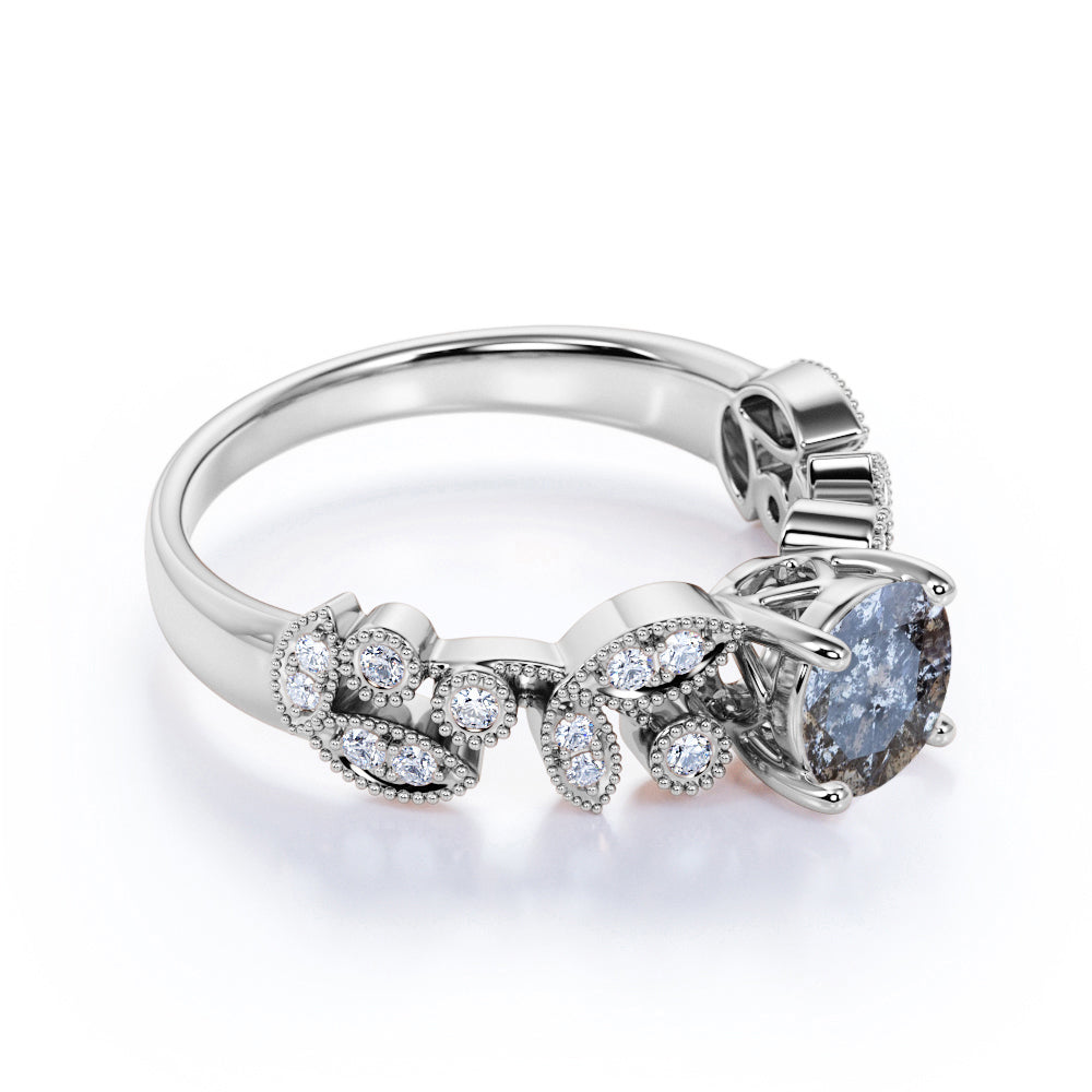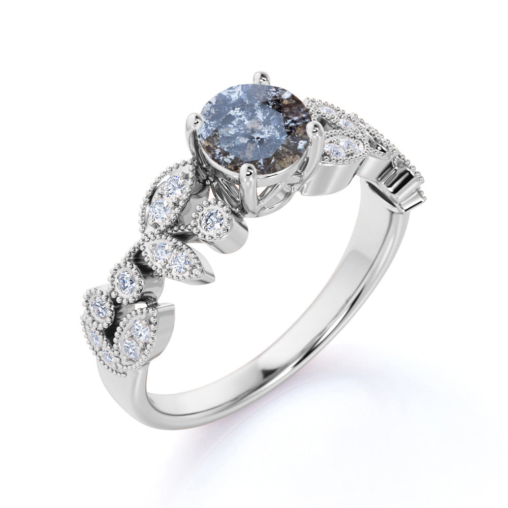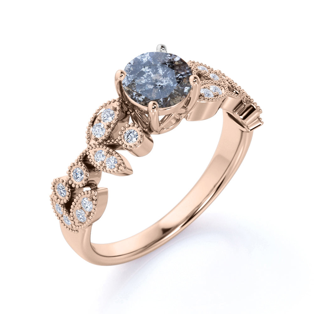 IMPORTANT NOTE: Since each Salt and Pepper Diamonds is one of a kind, the actual color of it may vary from the one that is pictured above. Handcrafted with love, this Art Deco Leaf Design .75 Carat Round Cut Genuine Icy Dark Grey Salt and Pepper Diamond Milgrain Engagement Ring will surely be as unique as you are. This nature-inspired Salt and Pepper Diamond ring features .50 carat round cut natural Salt and Pepper Diamond and .25 carat real side Diamond for gold ring and Moissanite for silver ring. This delicate engagement ring can be customized to either 10k, 14K and Gold over Silver and either Black Gold, Rose Gold, White Gold or Yellow Gold. Also, as your satisfaction is our most priority, we will do our best to have your handmade jewelry be carefully and beautifully crafted by our expert jewelers. The order also comes with a 30-day full refund policy. Due to its unique appearance, this ring will be a distinctive gift for all special occasions. With its unique appearance, you can be sure that no any other rings will look exactly alike. If you are looking for alternate gemstone, this Salt and Pepper Diamond is right for you. It provides an ideal way to stand out from crowd with a gorgeous and distinctive ring. This antique ring is available at a very affordable price yet it offers a very expensive and gorgeous look on your finger. Create a fascinating look on your finger with this Salt and Pepper Diamond ring for women which is available in both solid gold and sterling silver. Impress your special someone with this beautiful and affordable ring. Its inclusions reminds us that beauty doesn't always lie in perfection. Handcrafted with love, this antique ring will complement any style and enhance the charm of its wearer.