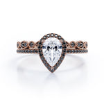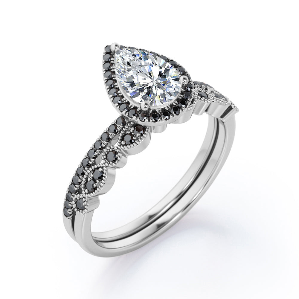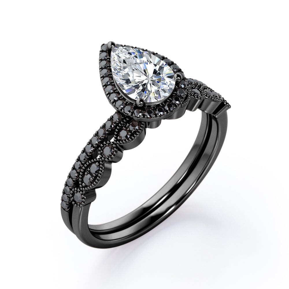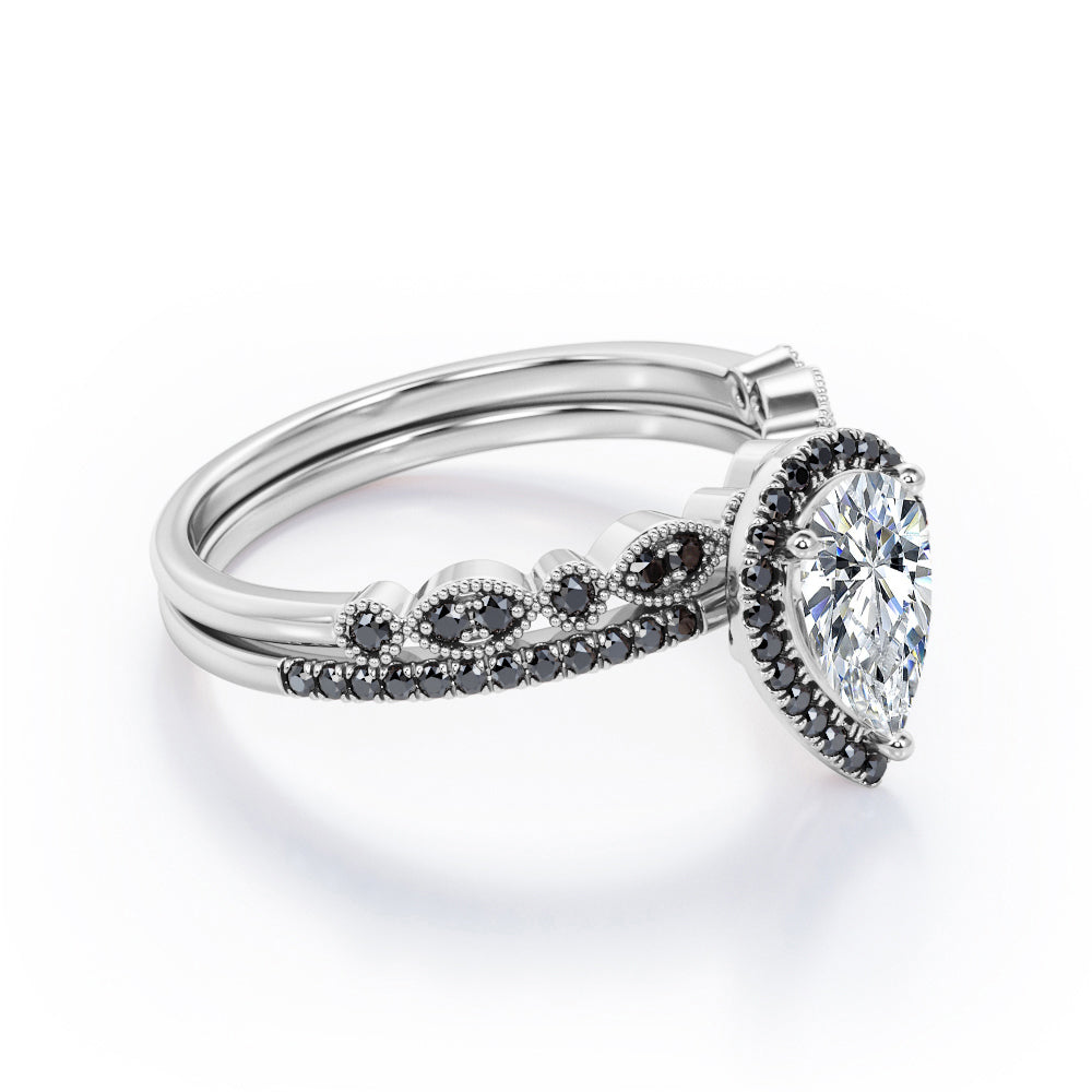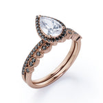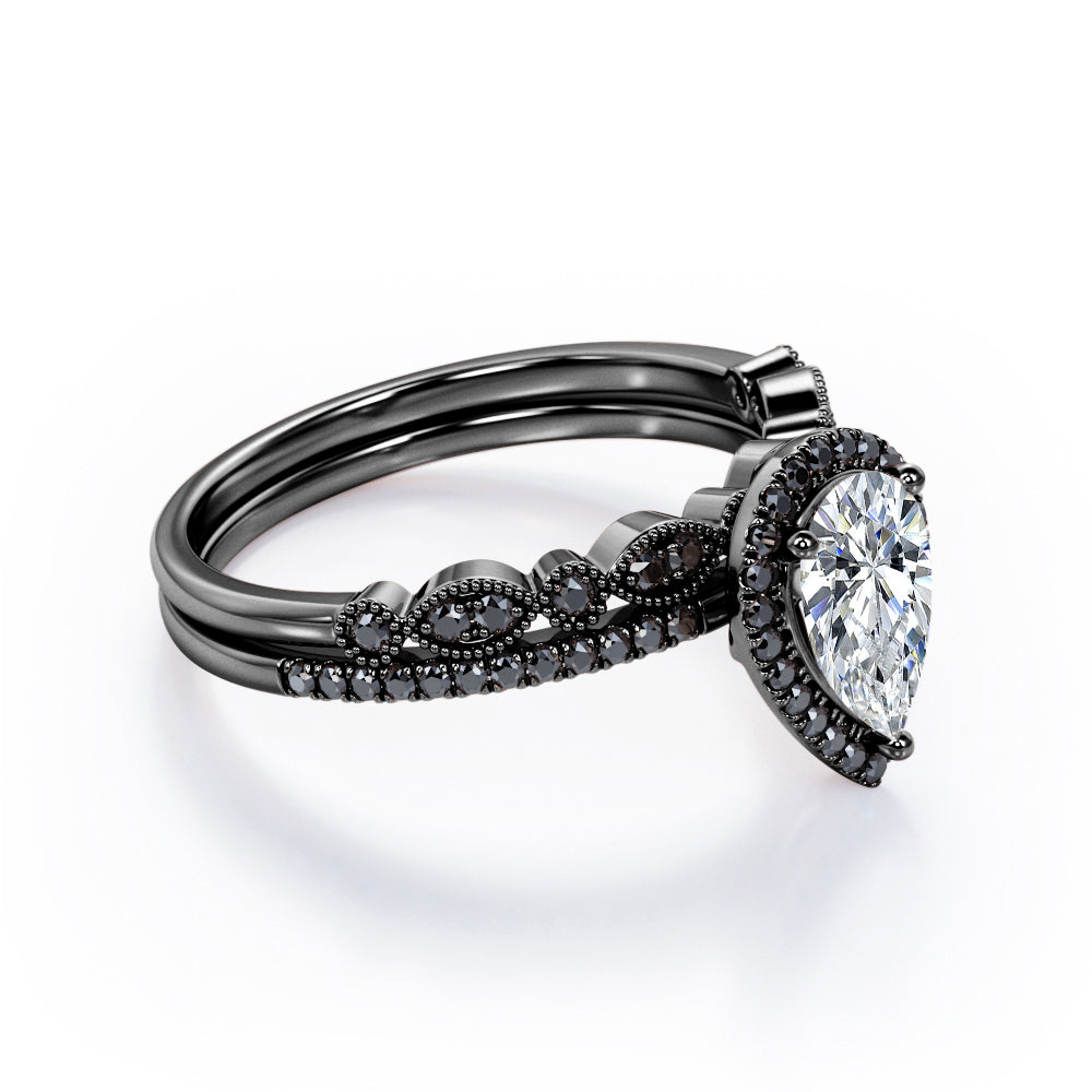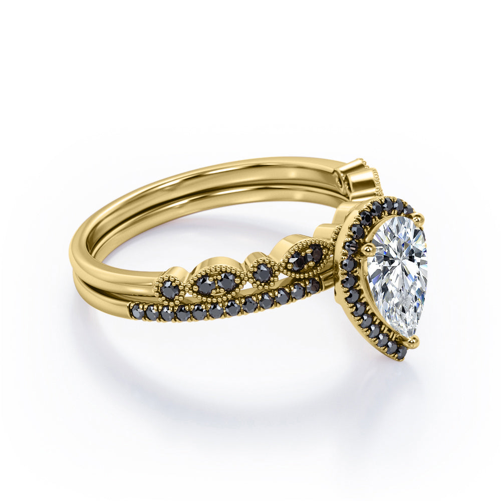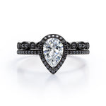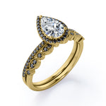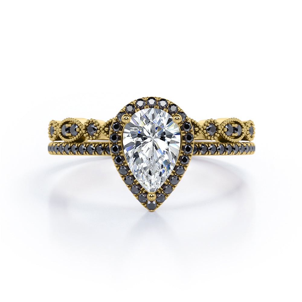Paint your love story with this Art-Deco Milgrain Filigree 1.65 TCW Teardrop Moissanite with Lab Created Black Diamond Pave Wedding Ring Set in Yellow gold. Skillfully hand-cut into a nice pear cut by our skilled jewelers, this flawless near colorless moissanite ring set integrates total 1.65 carat moissanite and lab-created black diamonds. Distinctive and extraordinary, this moissanite stone engagement rings set is perfect for those who would love to express their charisma and uniqueness. With naked eyes moissanites look, shine and feel exactly like diamonds. With its splendor, this moissanite stone ring set will unquestionably be an essential additional to any jewelry collection. This moissanite ring set is beautiful and accessible since it is available at a reasonable price. Moissanites are the most popular alternative gemstone for diamonds while being at lower and more affordable price. If you are looking for a special gift for your friends or your better half, this moissanite stone ring set can be a perfect gift for any occasion like engagements, Valentine's day, mother's day or anniversary. Also, this moissanite wedding rings set can be customized, so customers can choose one of metal colors between White gold, rose gold, yellow gold and black gold in 18k Gold over Silver, 10k and 14k gold metal options. In regards to its hardness, moissanite is almost as hard as diamond which means that it is notably durable. Let's fulfill your love story with this white moissanite ring set, and she will be eternally joyful.