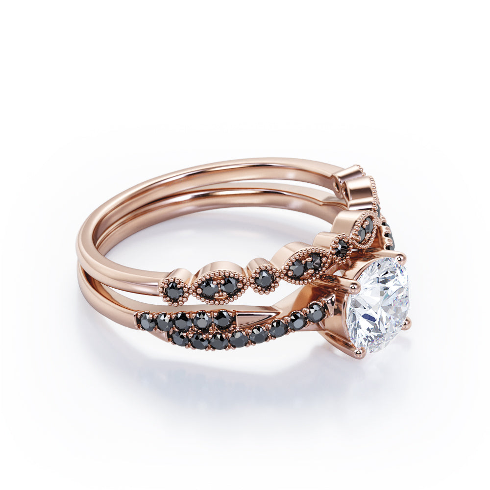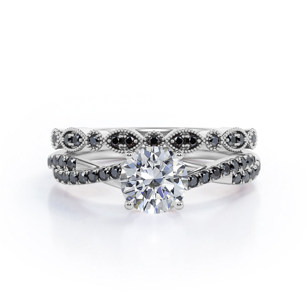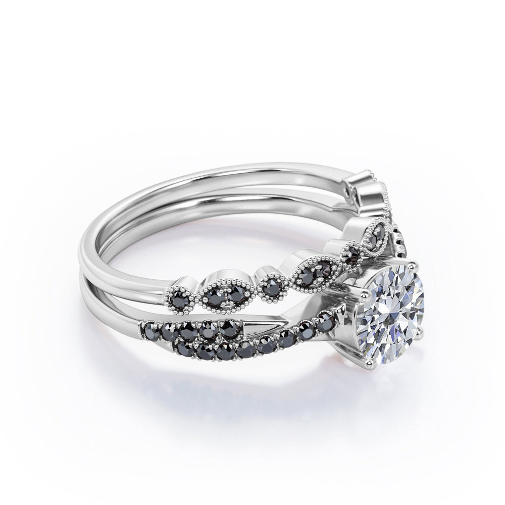 Art Deco Pave Infinity 1.65 TCW Round-Shaped Moissanite with Lab Created Black Diamond Basket Cathedral Wedding Set in White Gold