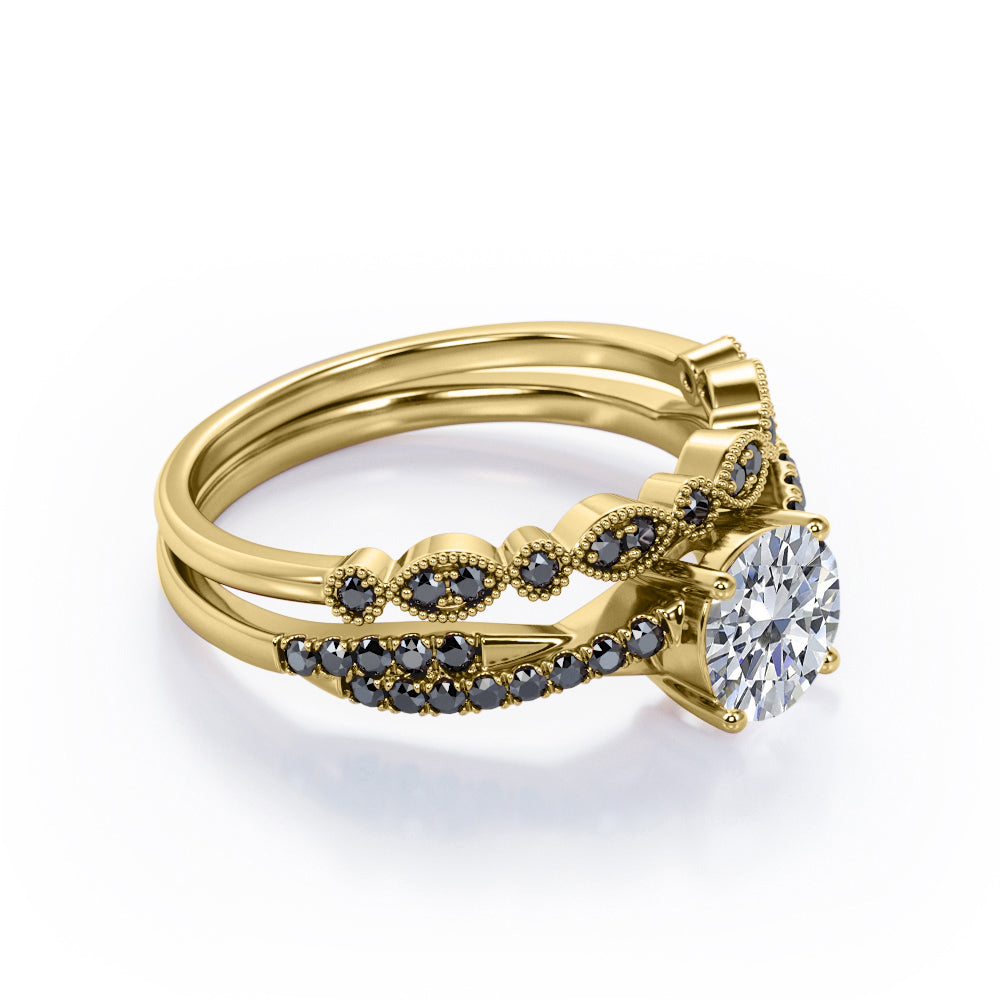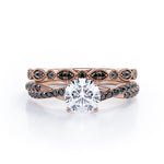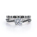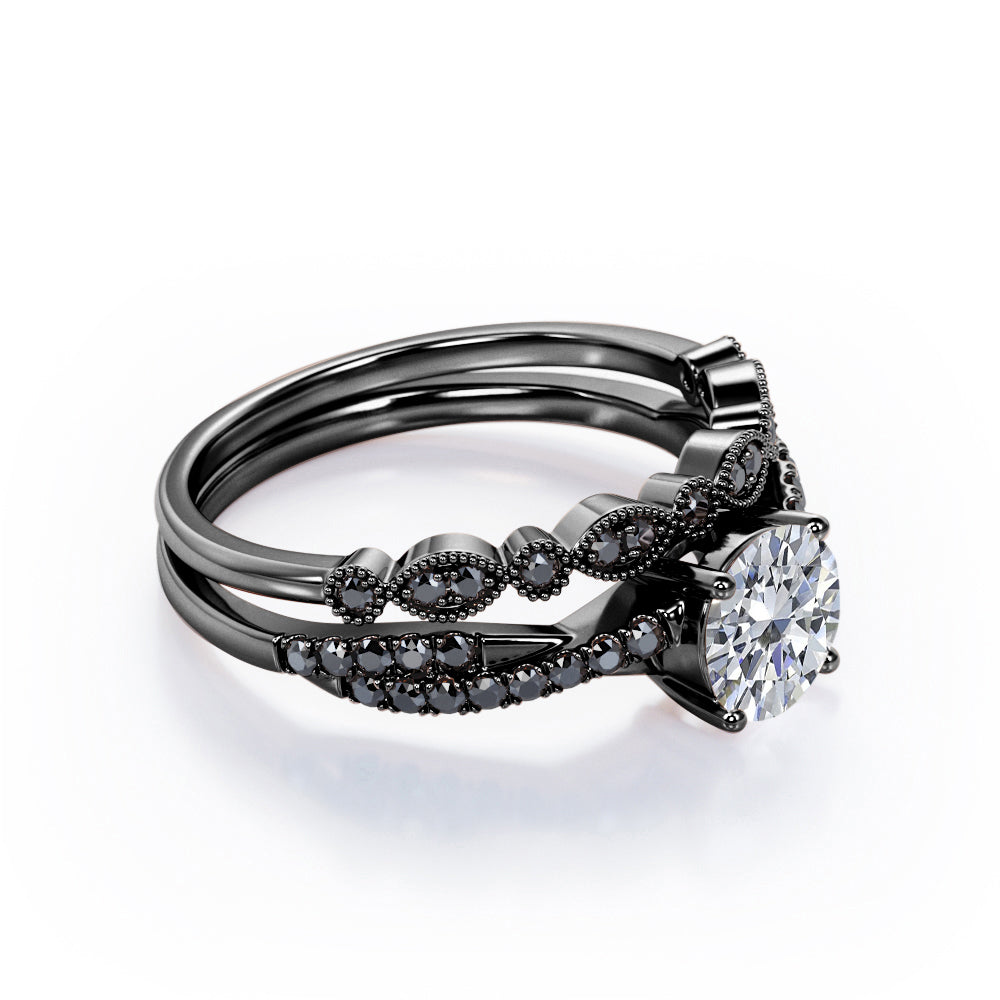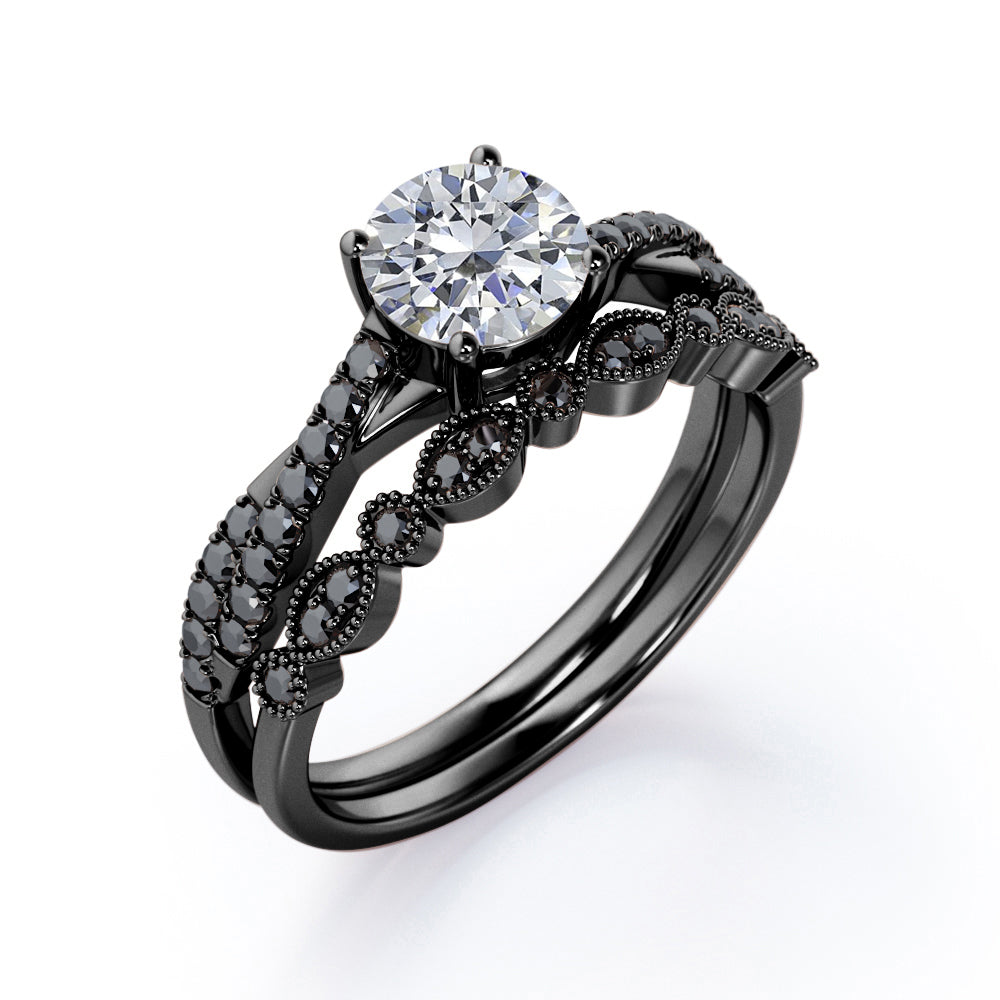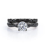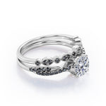 Paint your love story with this Art Deco Pave Infinity 1.65 TCW Round-Shaped Moissanite with Lab Created Black Diamond Basket Cathedral Wedding Set in White gold. Skillfully hand-cut into a nice round cut by our skilled jewelers, this splendid moissanite engagement rings set features total 1.65 carat moissanite and lab-created black diamonds. Distinctive and extraordinary, this best moissanite engagement rings set is perfect for those who would love to express their charisma and uniqueness. With naked eyes moissanites look, shine and feel exactly like diamonds. With its glory and clarity, this moissanite stone ring set will enhance happiness and attract positive vibes. This moissanite engagement ring set is beautiful and accessible since it is available at a reasonable price. Moissanites are the most popular alternative gemstone for diamonds while being at lower and more affordable price. If you are in search of an incredibly romantic gift for your significant other, our best moissanite engagement rings set, the birthstone ring for April, symbolically representing strength and an unbreakable love, will be the greatest choice you will ever make. This moissanite wedding ring set can be customized, either in White gold, rose gold, yellow gold or black gold in 18k Gold over Silver, 10k and 14k gold metal options upon customer request. In regards to its hardness, moissanite is almost as hard as diamond which means that it is notably durable. Let’s impress her with this moissanite wedding rings set, and she will be eternally joyful.