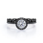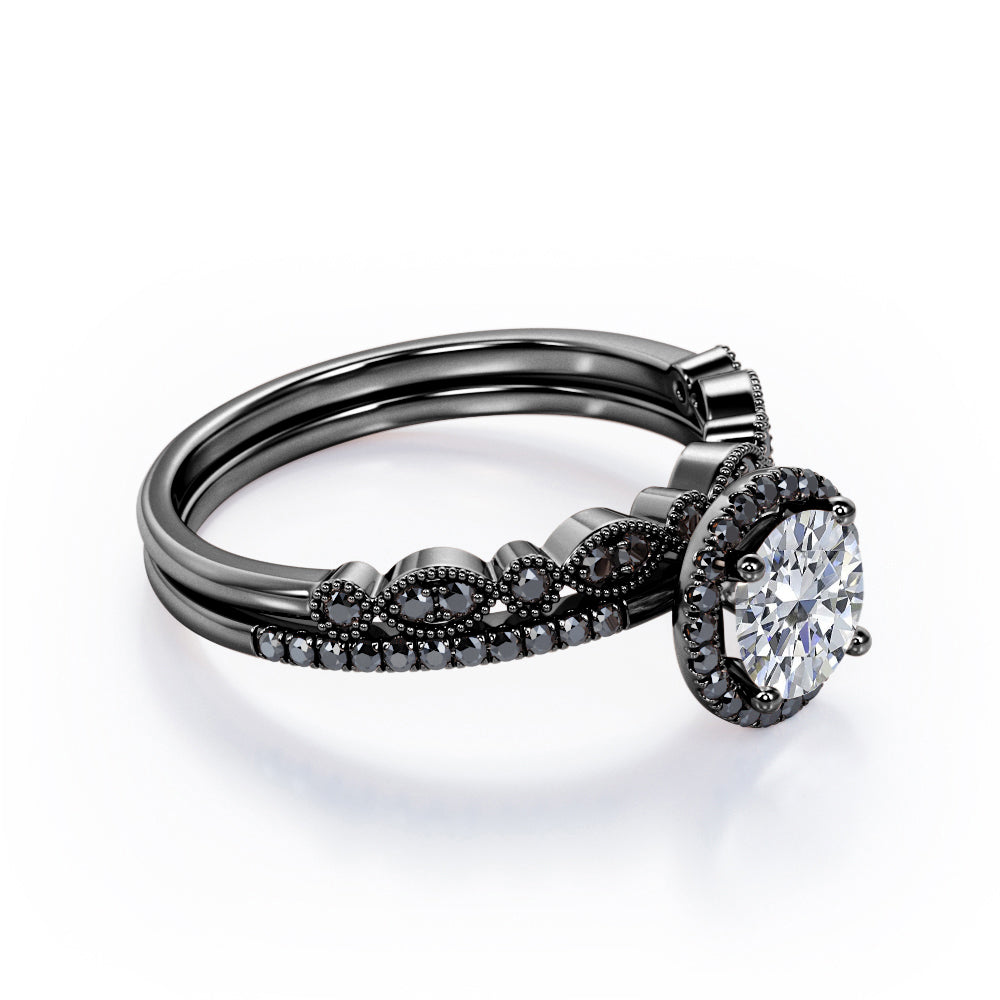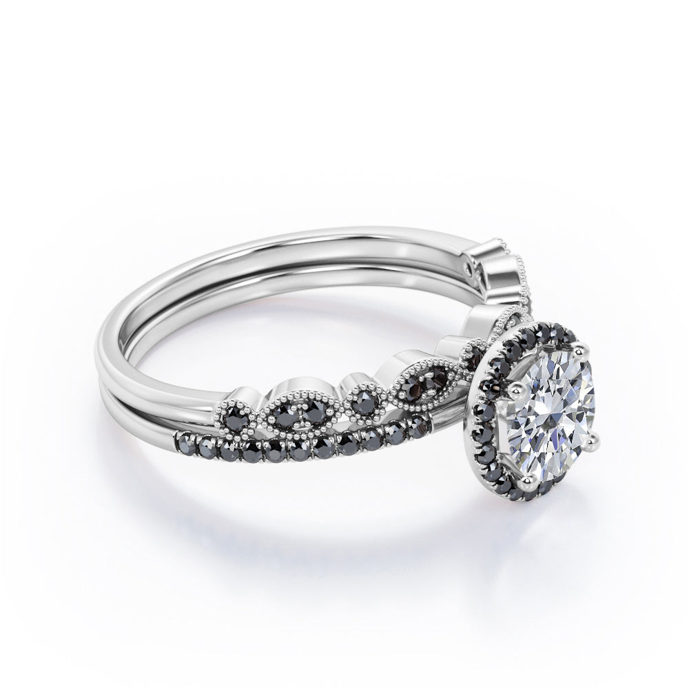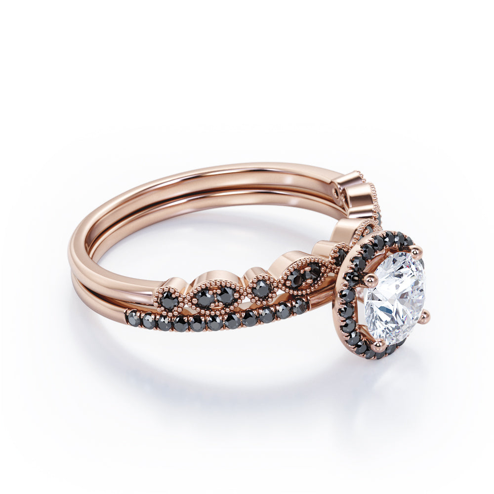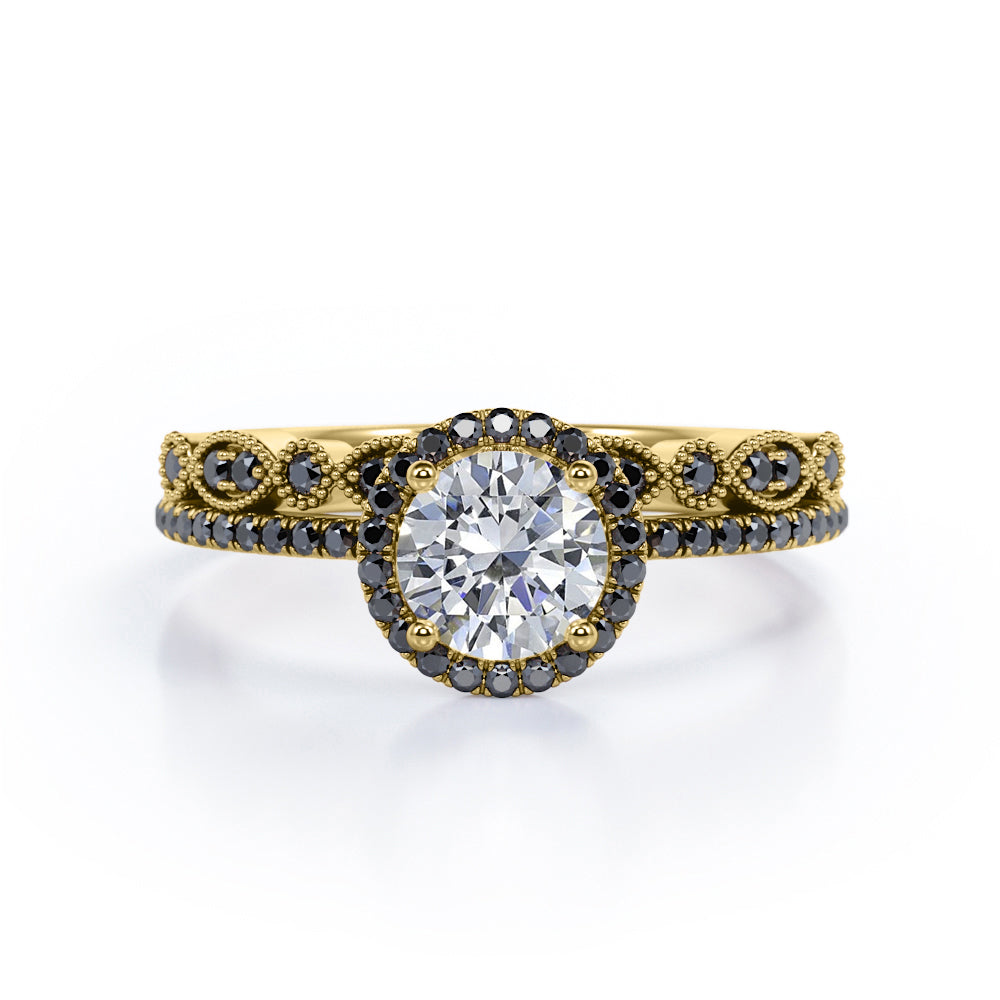 Art Deco Pave Setting - 1.65 TCW Round Cut Moissanite with Lab Created Black Diamond - Halo Design Bridal Set in Yellow Gold