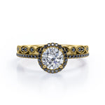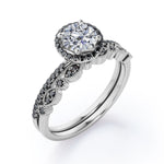 Create a magical moment with this Art Deco Pave Setting - 1.65 TCW Round Cut Moissanite with Lab Created Black Diamond - Halo Design Bridal Set in Yellow gold. Professionally handcrafted into a fine round cut by our experts in lapidary, this appealing moissanite stone engagement rings set is made up of total 1.65 carat moissanite and lab-created black diamonds. Special and non-traditional, this silver moissanite ring set is perfect for those who would love to express their charisma and uniqueness. With naked eyes moissanites look, shine and feel exactly like diamonds. With its splendor, this sterling silver moissanite wedding rings set will enhance happiness and attract positive vibes. This moissanite band set is beautiful and accessible since it is available at a reasonable price. Moissanites are the most popular alternative gemstone for diamonds while being at lower and more affordable price. This moissanite wedding rings set can be a perfect gift for any occasion like engagements, Valentine's day, mother's day or anniversary. Also, this moissanite engagement ring set can be customized to your own choice of metal colors: White gold, rose gold, yellow gold and black gold in 18k Gold over Silver, 10k and 14k gold metal options. In regards to its hardness, moissanite is almost as hard as diamond which means that it is notably durable. Let's fulfill your love story with this best moissanite engagement rings set, and she will be eternally joyful.