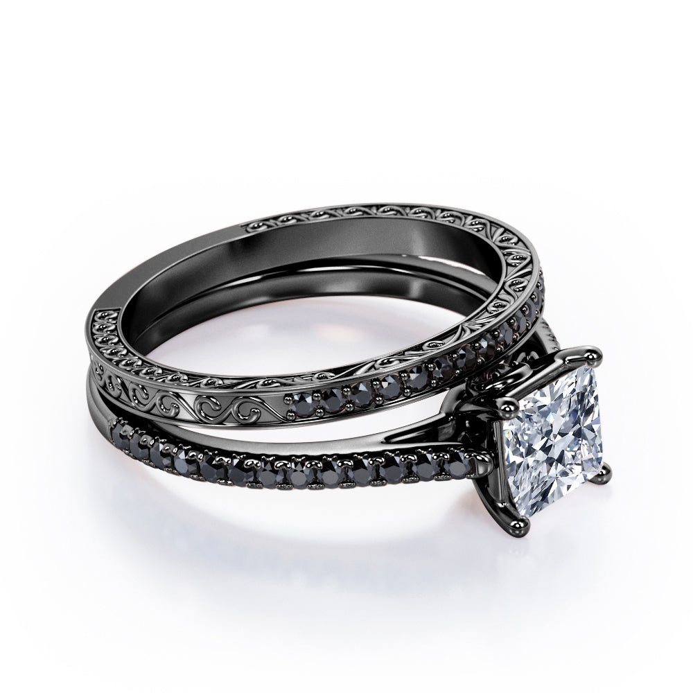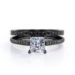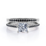 Create an impressive portrait of your love story with these Art Deco Prong 1.5 TCW Princess Cut Moissanite with Lab Created Black diamond Bridal Set with Pave Accents in Rose Gold. Hand-cut with deftness into a lovely shape princess cut by our lapidary expertise, these astonishing affordable Moissanite rings showcases total 1.5 carat Moissanite with lab-created Black diamond side stones on solid white gold. For those looking for something a little out of the ordinary, these affordable engagement rings are ideal for those who wish to express their charisma and uniqueness. with its dazzling beauty, these Moissanite engagement rings for women will bring joy and good energy to its wearer. Beautiful and affordable, these gold and Moissanite rings are stunning and inexpensive, thanks to its reasonable price. If you are looking for a Moissanite ring for any special event, such as a birthday, an engagement, or a marriage proposal, these Moissanite wedding rings, the birthstone wedding ring set for April, symbolically represents love and dedication, is the best gift you can give to your significant other. These Moissanite wedding rings can be customized to your own choice of metal colors: White gold, rose gold, yellow gold and black gold in 18k Gold over silver, 10k and 14k gold metal options. Let's show her how much you care by giving her these Moissanite jewelry, and she will never regret it.