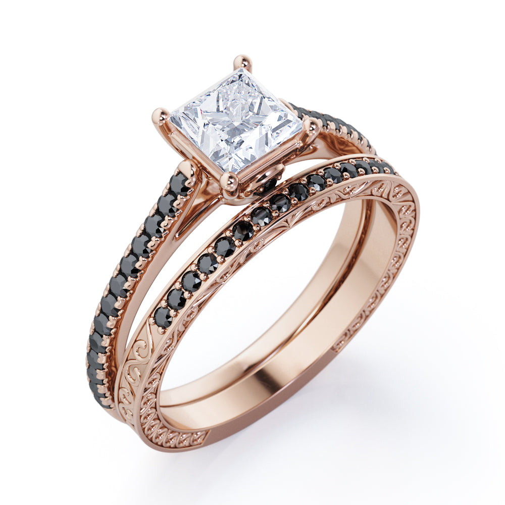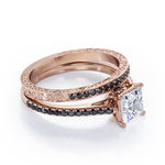 Art Deco Prong 1.5 TCW Princess Cut Moissanite with Lab Created Black Diamond Bridal Set with Pave Accents in Rose Gold
