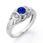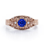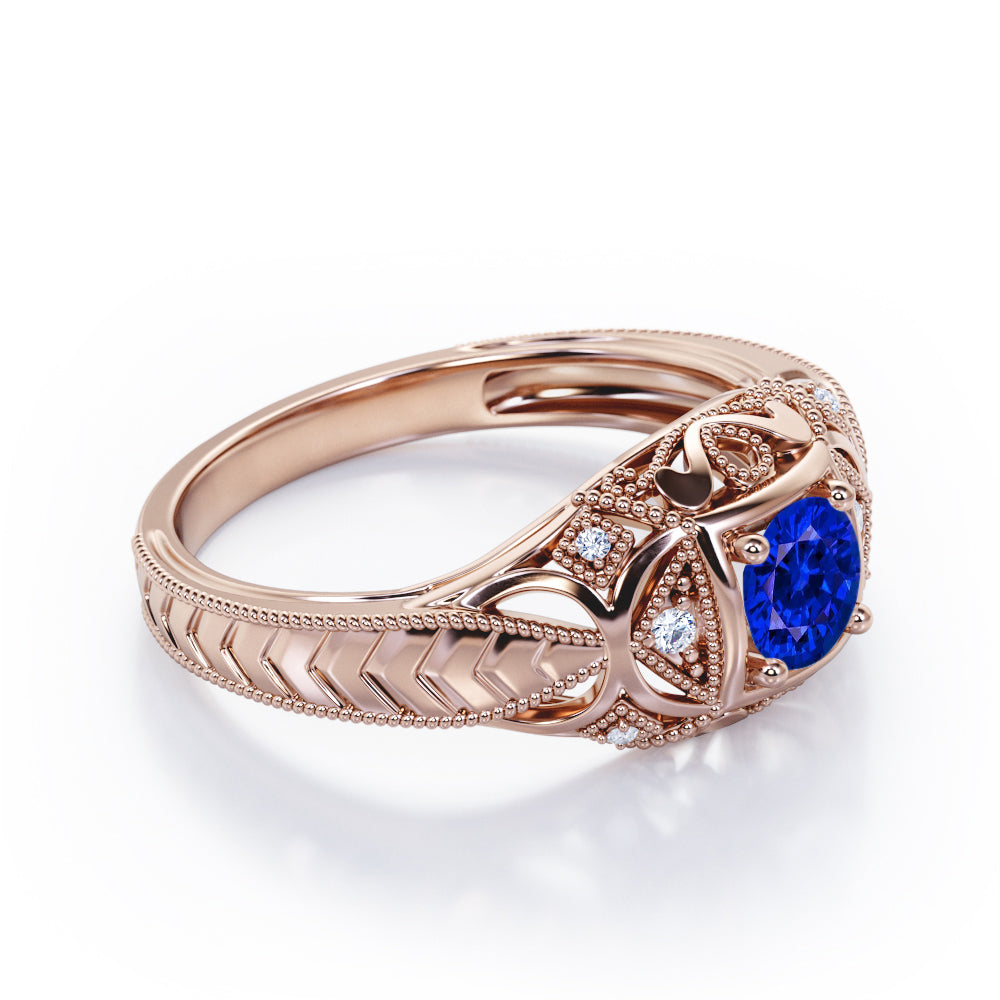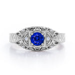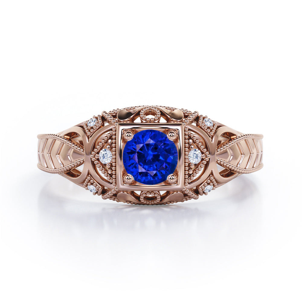 Art Deco Style 1.05 Carat Round Cut Sapphire And Diamond Square Framed Vintage Filigree Engagement Ring In Rose Gold. Look radiant in our 1.05 carat round cut sapphire and diamond engagement ring in rose gold. A brilliant round sapphire stone weighing 1 carat on a square framing further surrounded by an ornate of beaded detailing gives a nod to a bygone era. This regal engagement ring is perfect for vintage lovers with an art deco milgrain edging all around the band. The art deco work in the rose gold band complements the tones of the sapphire center stone. This art deco style 1.05 carat round cut sapphire and diamond square framed vintage filigree engagement ring in rose gold can also be customized to 18k Gold plating over silver, 10k Gold or 14k Gold as per your preference as all our rings are handmade by our experienced artisans. Please note that if the ring is made over silver, the side stone will be moissanite and if it is made on gold, diamond will be employed as the side stone.